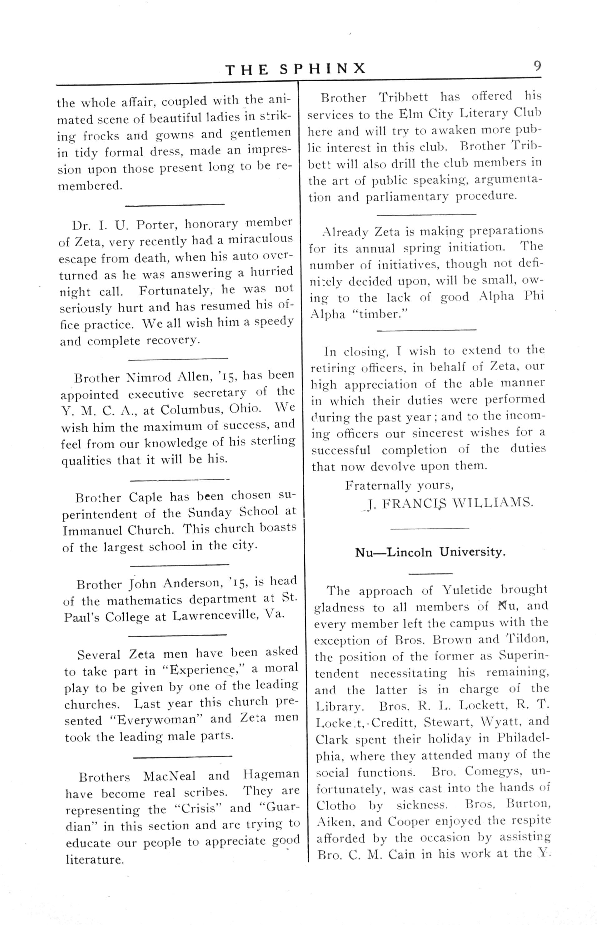 The approach of Yuletide brought gladness to all members of Nu, and every member left the campus with the exception of Bros Brown and Tildon, the position of the former as Superintendent necessitating his remaining and the latter is in charge of the Library Bros R L Lockett, R T Locke.t,-Creditt, Stewart, Wyatt, and Clark spent their holiday in Philadelphia, where they attended many of the social functions. Bfo. Comegys, unfortunately, was cast into the hands oi Clotho by sickness. Bros; Burton, Aiken, and Cooper enjoyed the respite afforded by the occasion by assisting Bro C M Cain in his work at the Y