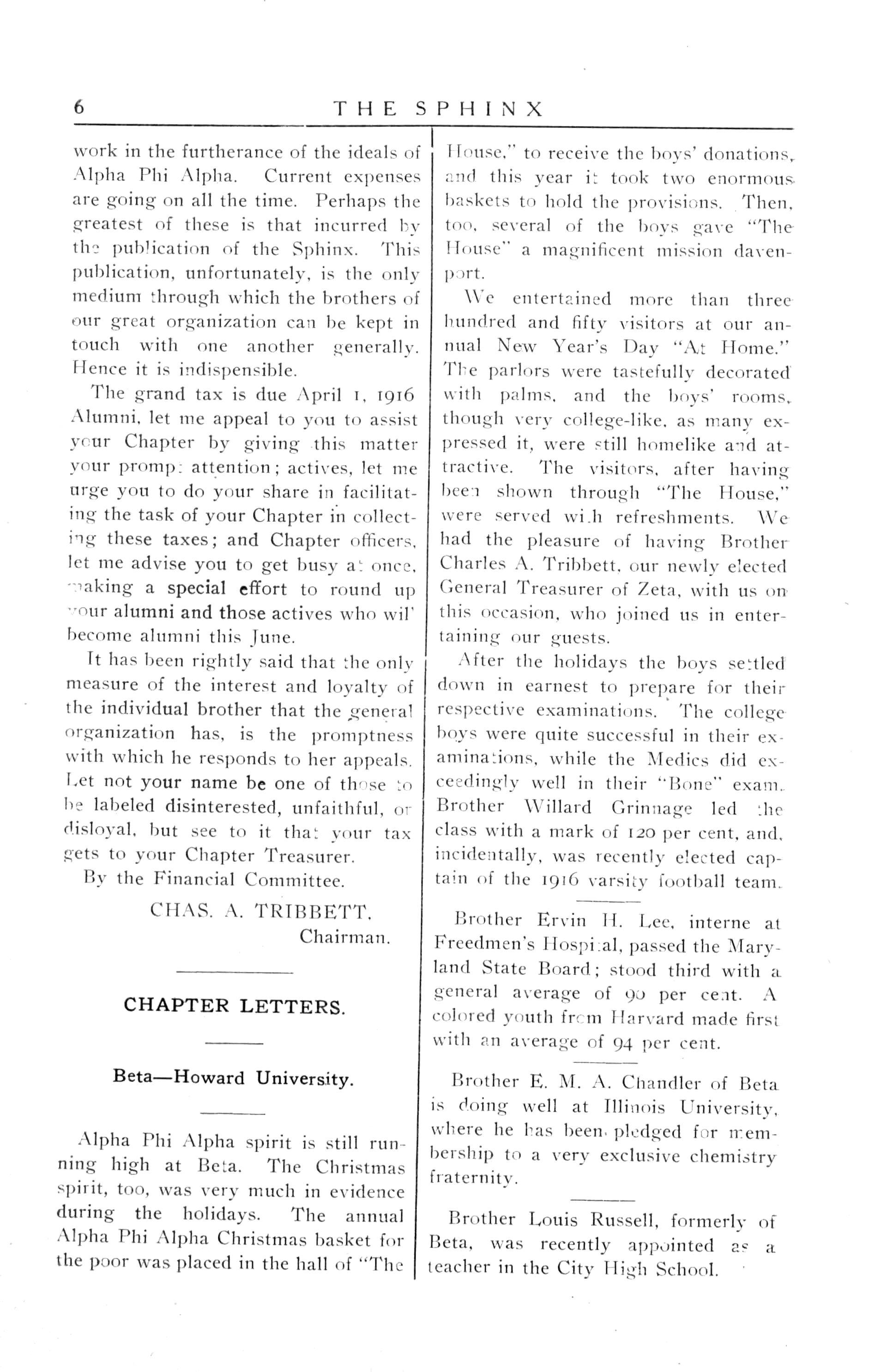 It seems to be the opinion of a great man}' brothers that their financial obligations to Alpha Phi Alpha cease with their passing from the so-called "active circle" into the ranks of the alumni; the Opinion of others seems to be that the life of the general organization is but for the last few days of the year during the sessions of the Annual Convention. The consequence is that the former, thinking they have been exempt, fail to pay any tax at all; while the latter, believing, and rightly, that a dead body needs no nourishment, wait until almost the last hour before making any effort to get their tax in, and then find themselves late Of course, this is only felt by the general administration, which finds itself short of funds, and also by the delegate to the National Convention, who suffers the embarrassment of disfranchisement. To the one it is but necessary to recall the oath of allegiance, and to the other it needs only to be said that a casual reading of the publications of the Sphinx will verify the fact that the general organization is in actual exs ence 365 days of the year