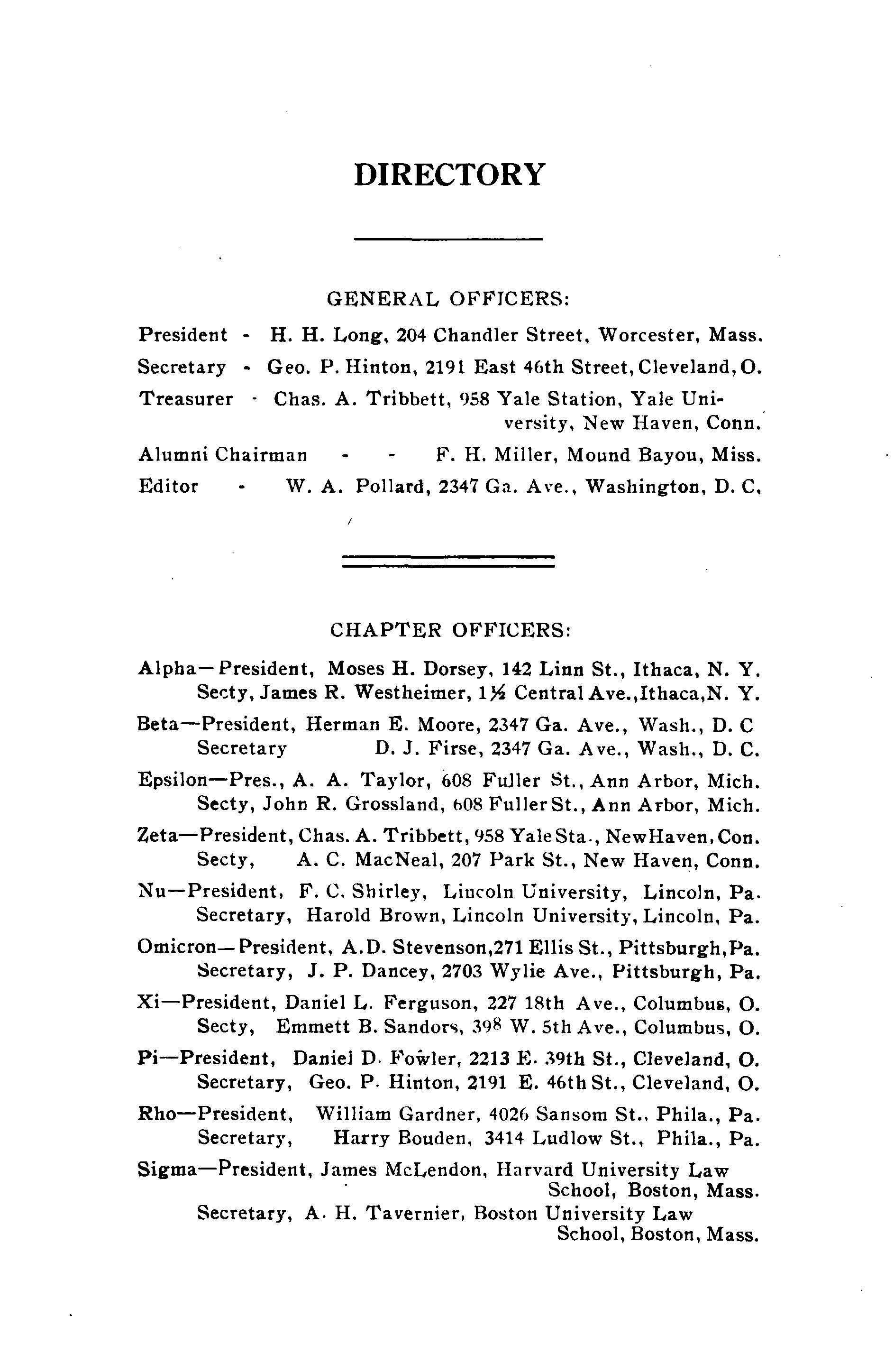 Alpha—President, Moses H Dorsey, 142 Linn St., Ithaca, N Y