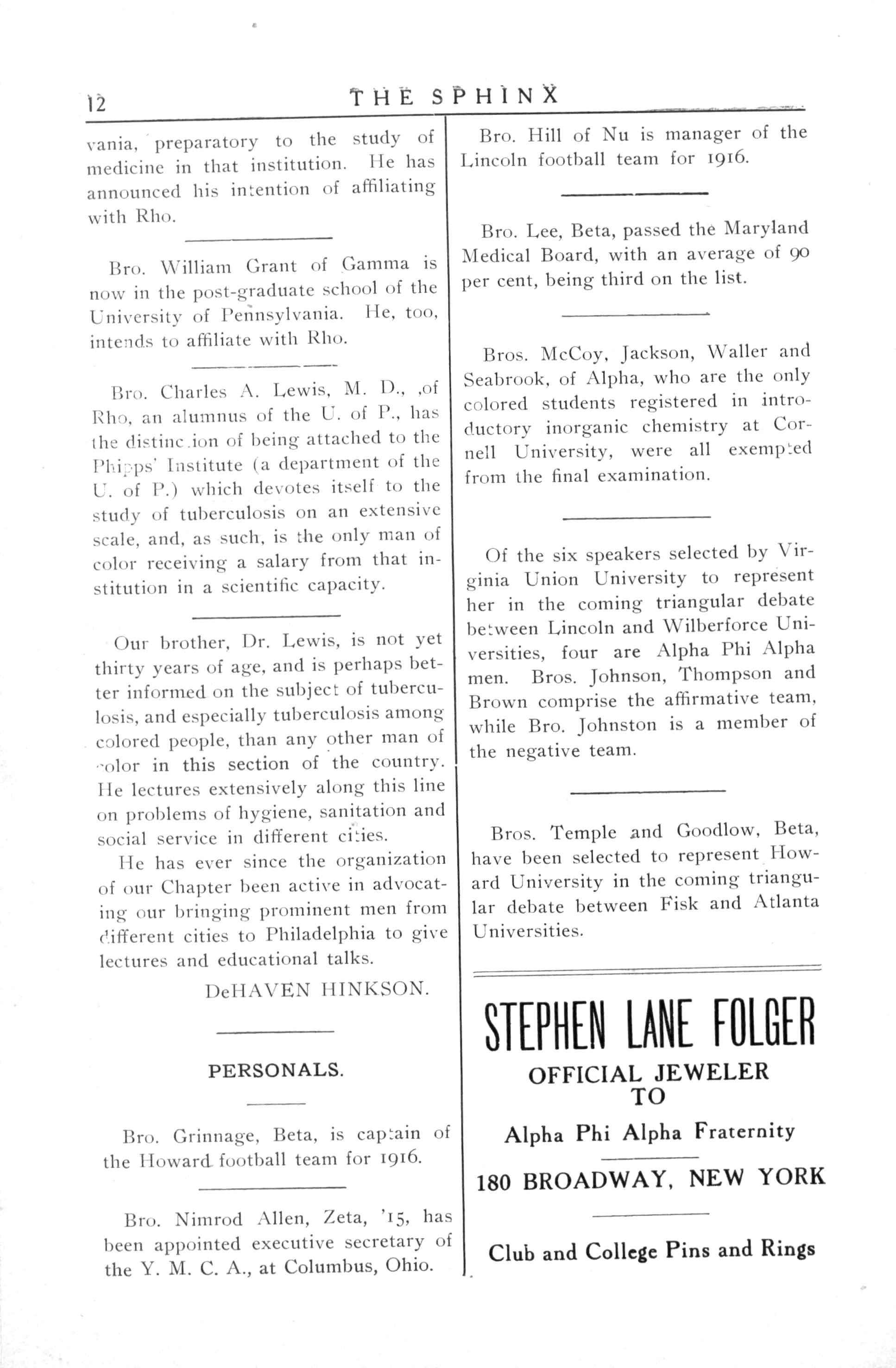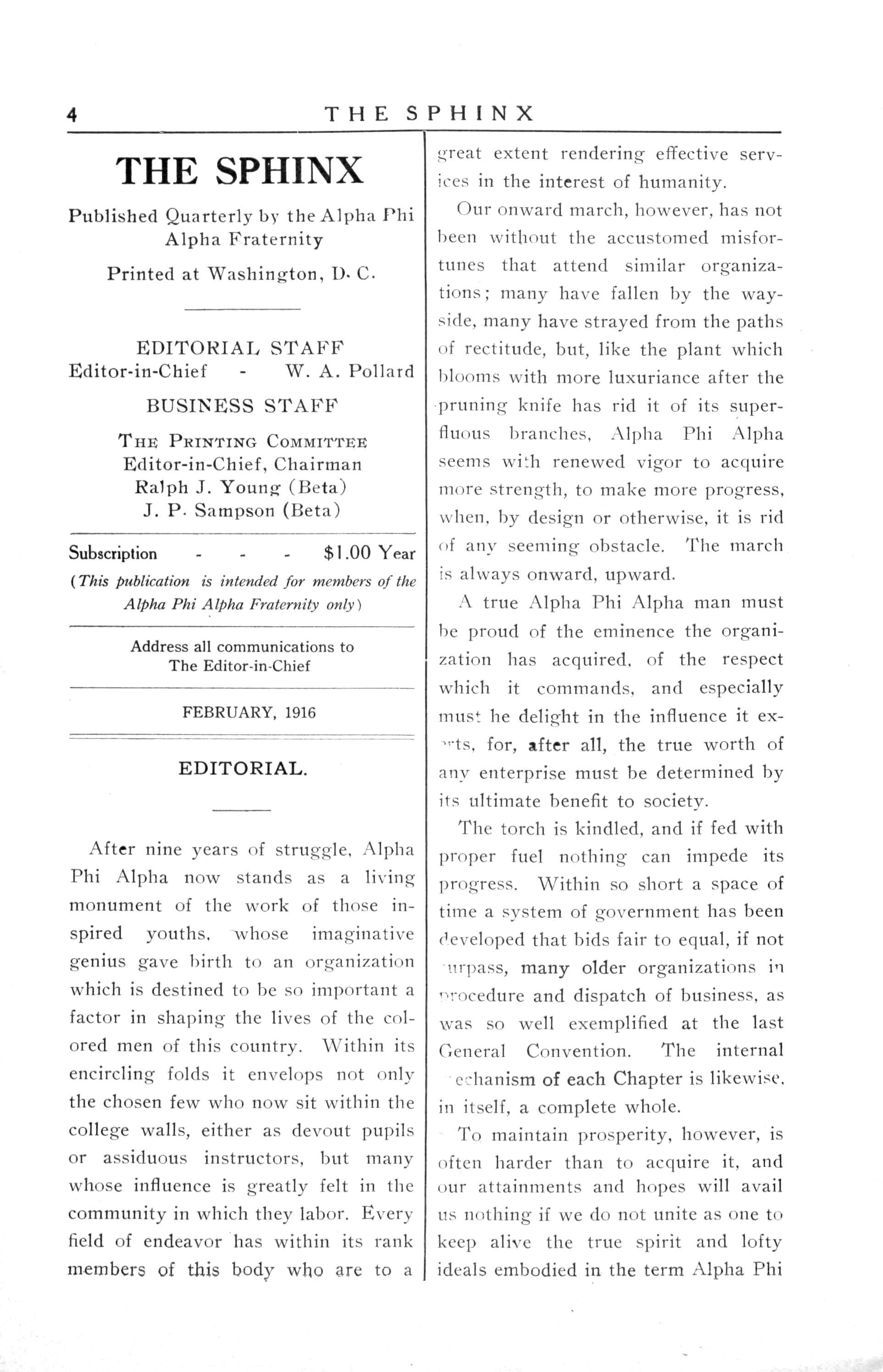 The Sphinx should be regarded as a strictly secret journal; should never be left carelessly on desks or tables; nor should its contents be read by or communicated to any other than members cf Alpha Phi Alpha.