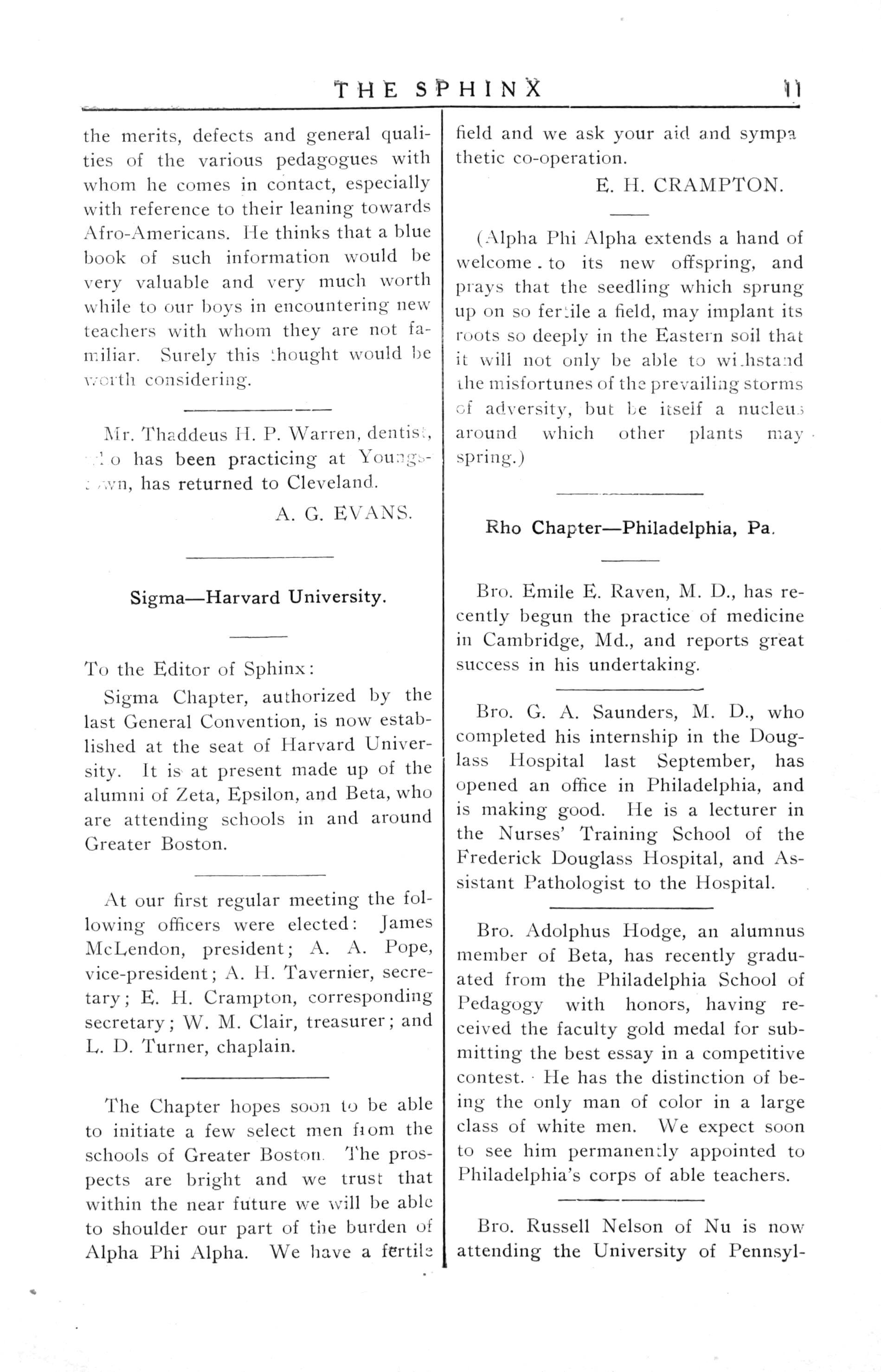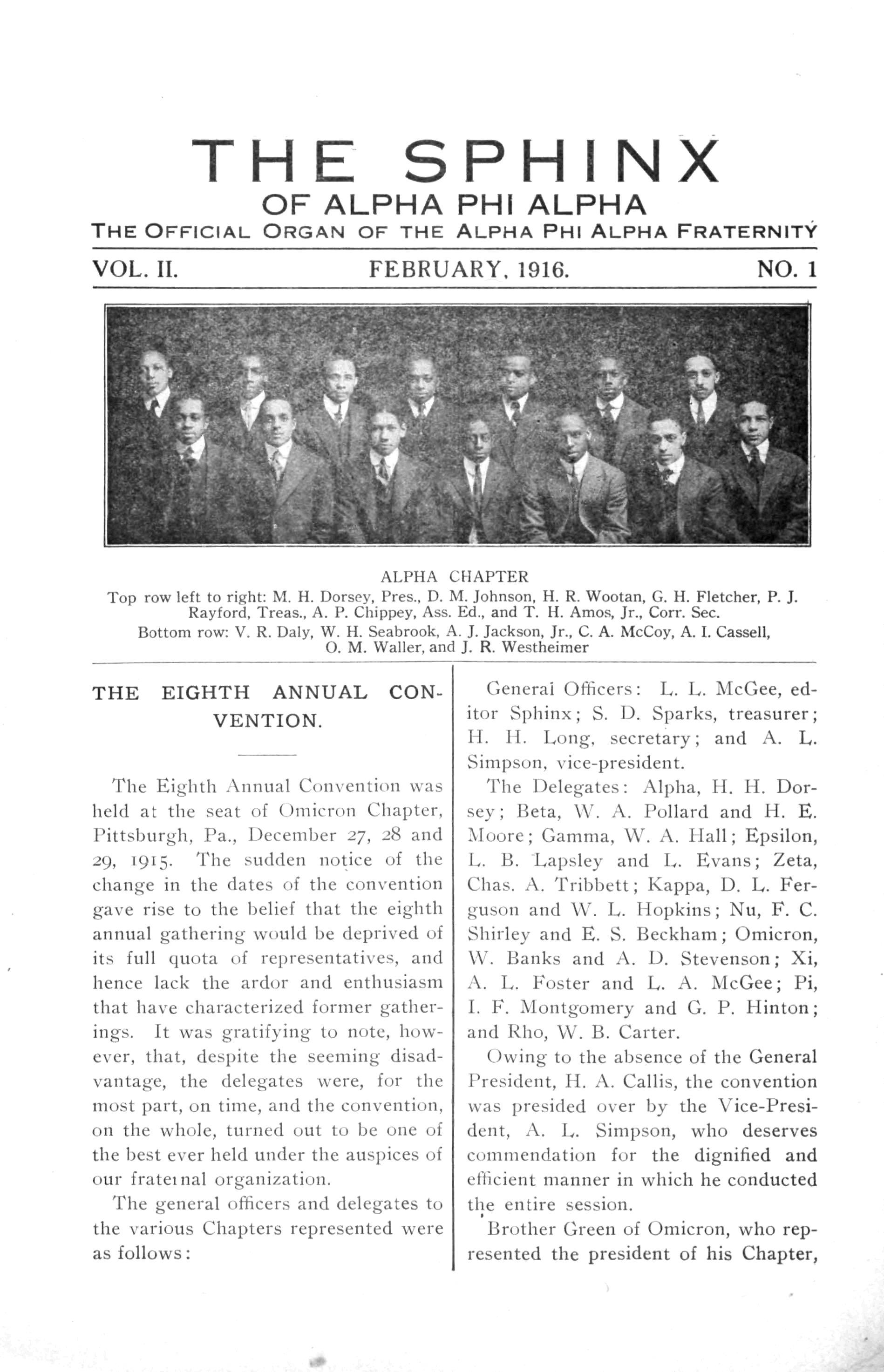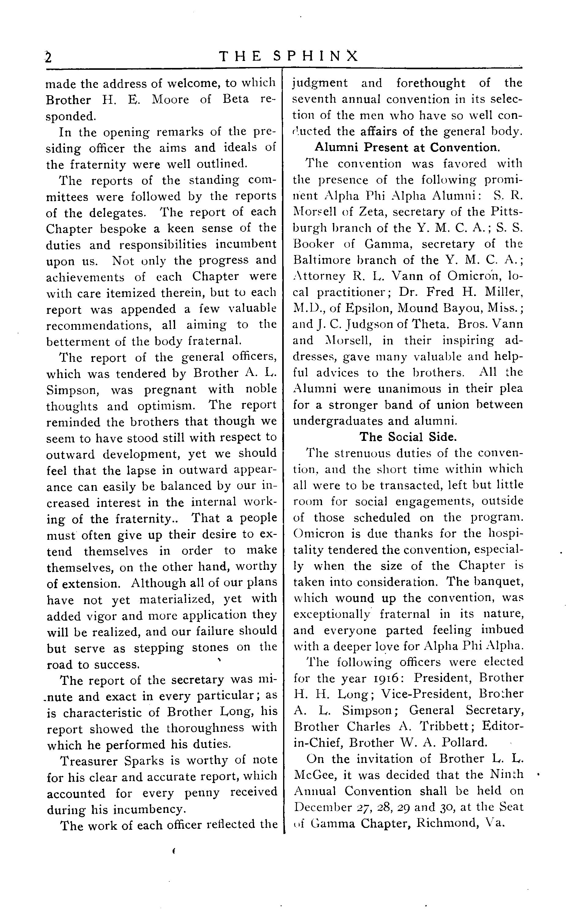 The convention was favored with the presence of the following prominent Alpha Phi Alpha Alumni: S R Morsell of Zeta, secretary of the Pittsburgh branch of the Y M C A.; S S Booker of Gamma, secretary of the Baltimore branch of the Y M C A.; Attorney R. L. Vann of Omicroh, local practitioner; Dr Fred H Miller, M.D., of Epsilon, Monnd Bayou, Aliss.; and J C Judgson of Theta Bros Vann and Morsell, in their inspiring addresses, gave many valuable and helpful advices to the brothers. All the Alumni were unanimous in their plea for a stronger band of union between undergraduates and alumni