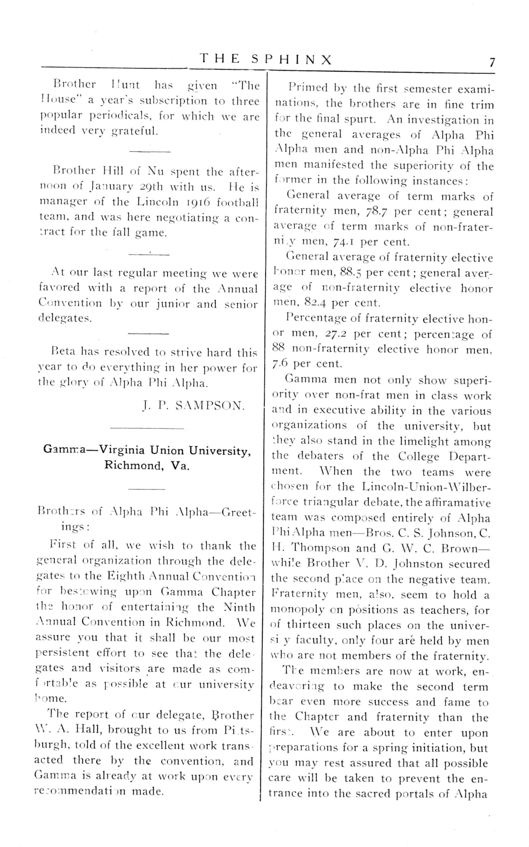Of the six speakers selected by Virginia Union University to represent her in the coming triangular debate between Lincoln and Wilberforce Universities, four are Alpha Phi Alpha men. Bros. Johnson, Thompson and Brown comprise the affirmative team. while Bro. Johnston is a member of the negative team.