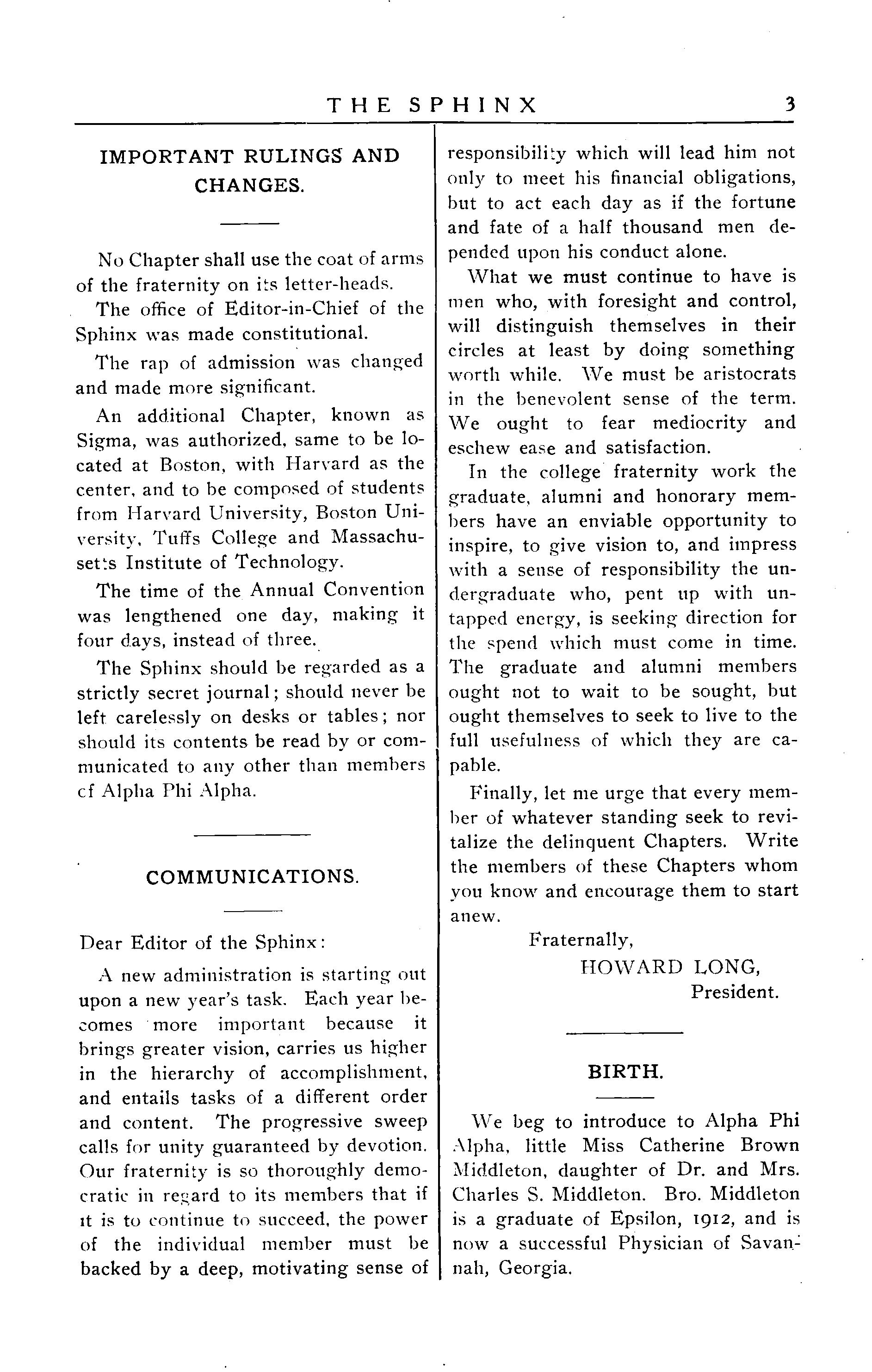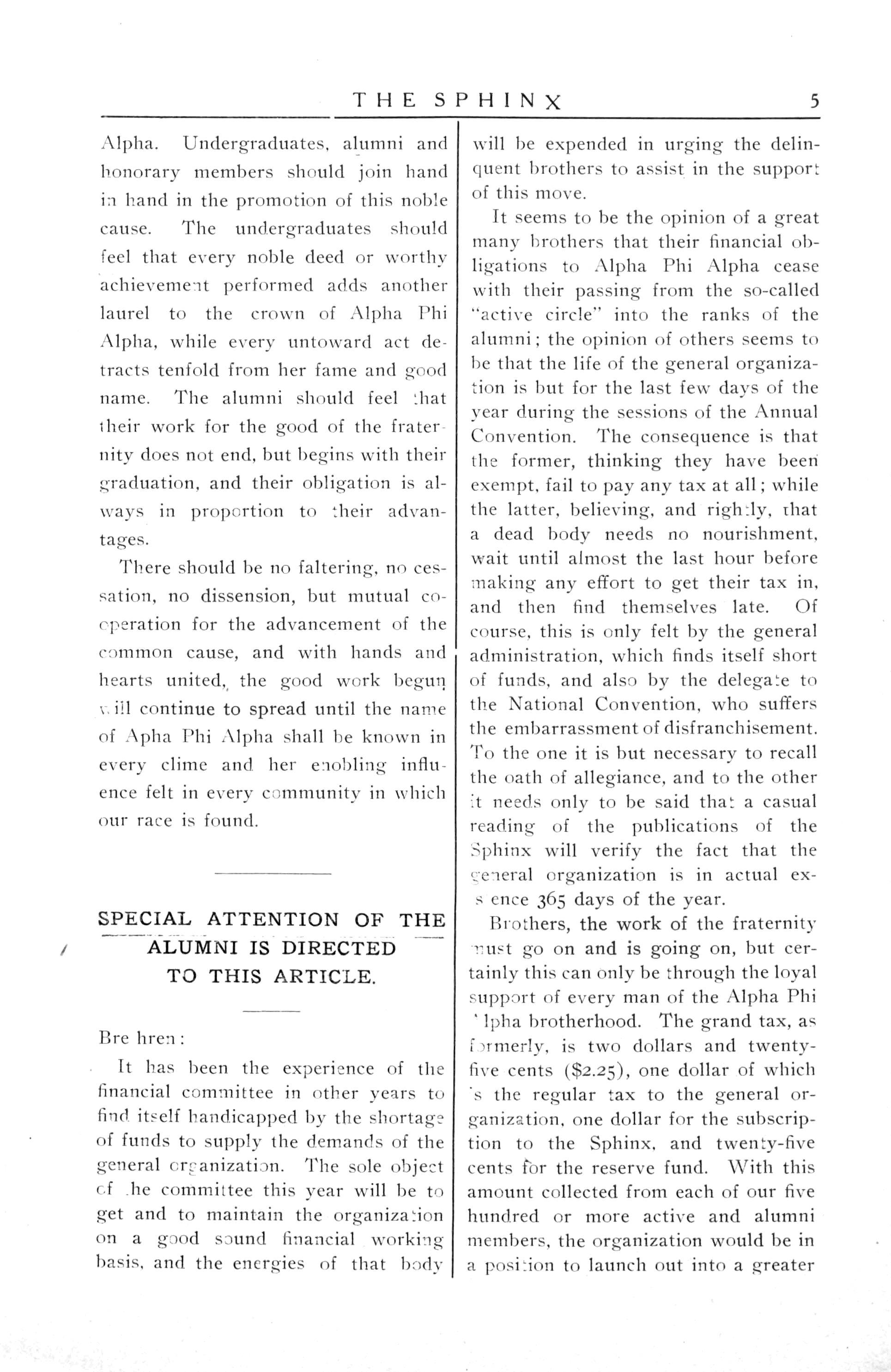 Brothers, the work of the fraternity Tiust go on and is going on, but certainly this can only be through the loyal support of every man of the Alpha Phi ' lpha brotherhood. The grand tax, as f11merly, is two dollars and twentyfive cents ($2.25), one dollar of which s the regular tax to the general organization, one dollar for the subscription to the Sphinx, and twenty-five cents for the reserve fund. With this amount collected from each of our five hundred or more active and alumni members, the organization would be in a position to launch out into a greater