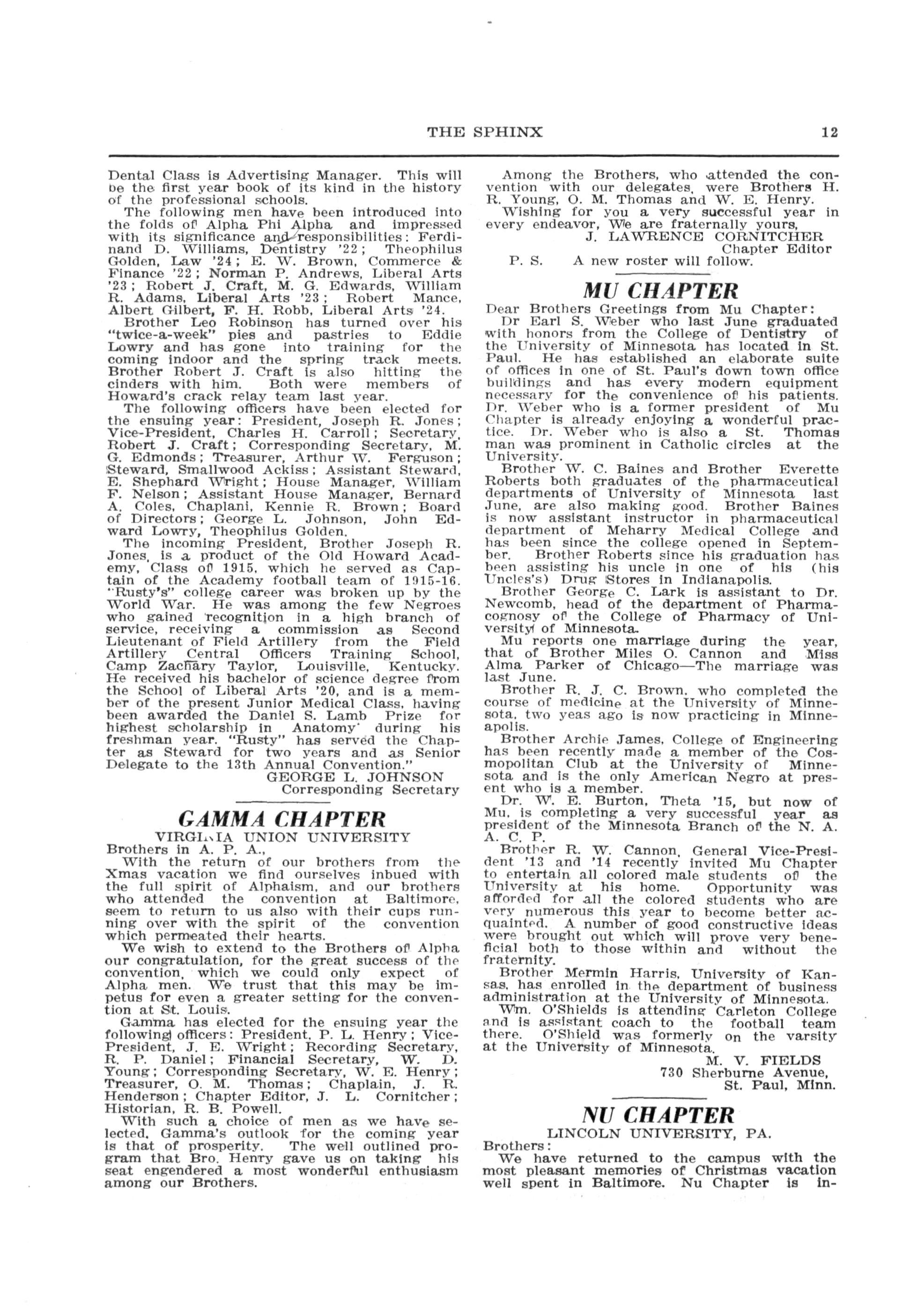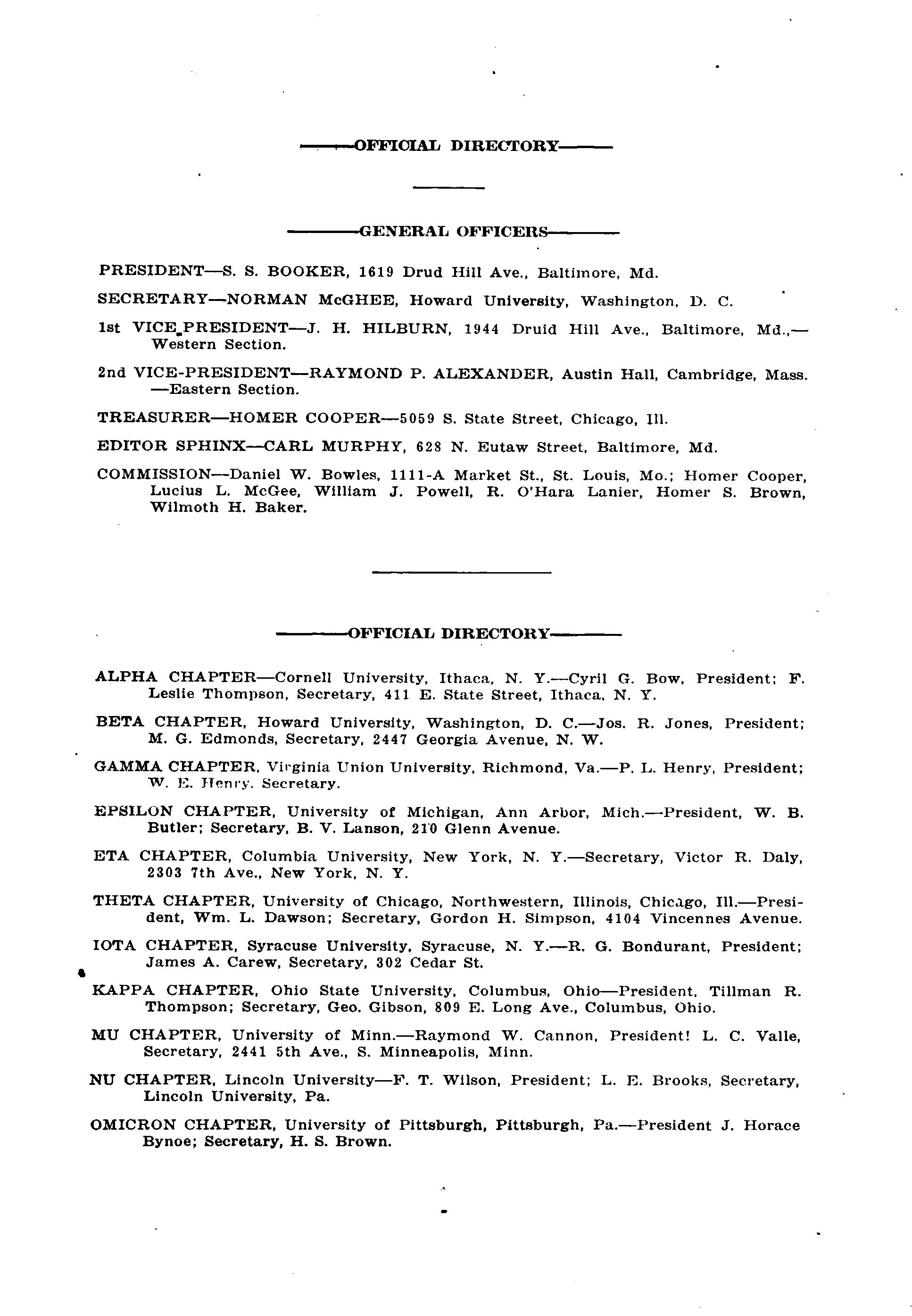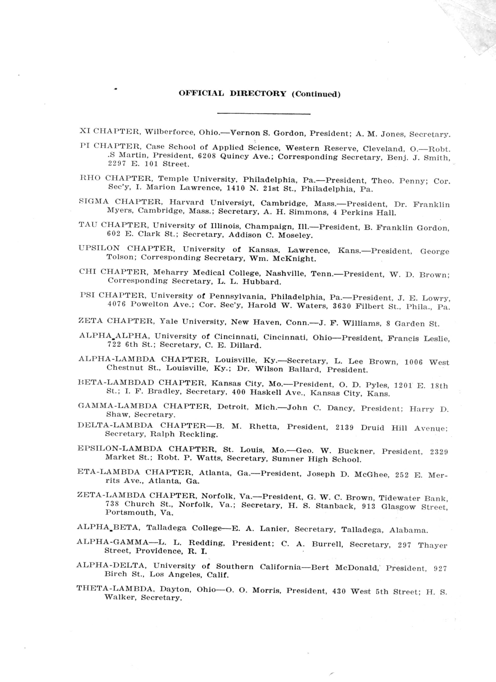 GAMMA CHAPTER, Virginia Union University, Richmond, Va.—P. L. Henry, President; W. E. Henry, Secretary.