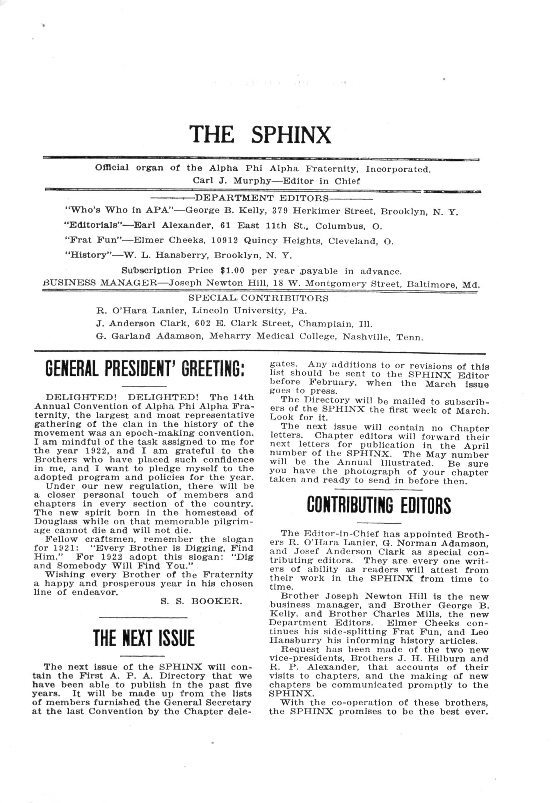 The Editor-in-Chief has appointed Brothers R. O'Hara Lanier, G. Norman Adamson, and Josef Anderson Clark as special contributing editors. They are every one writers of ability as readers will attest from their work in the SPHINX from time to time