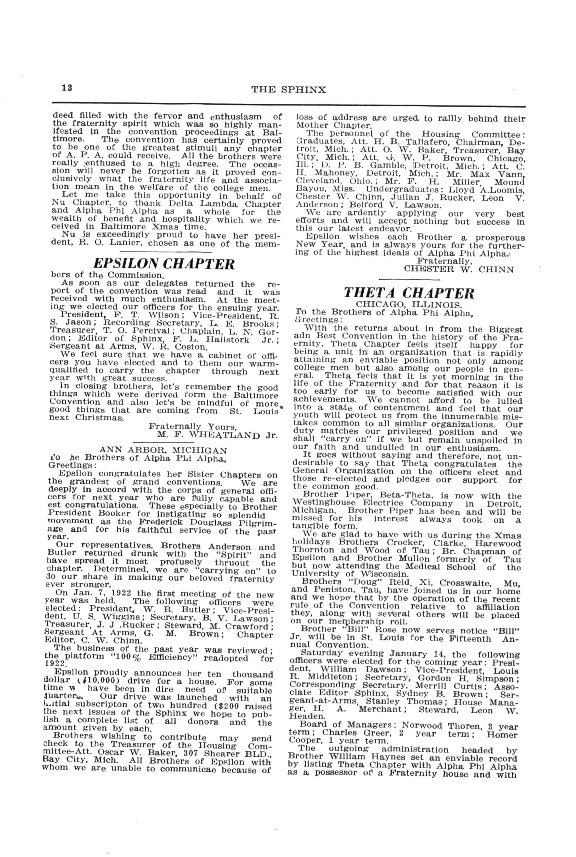 Epsilon wishes each Brother a prosperous New Year, and is always yours for the furthering of the highest ideals of Alpha Phi Alpha CHESTEFraternally, R W. CHINN