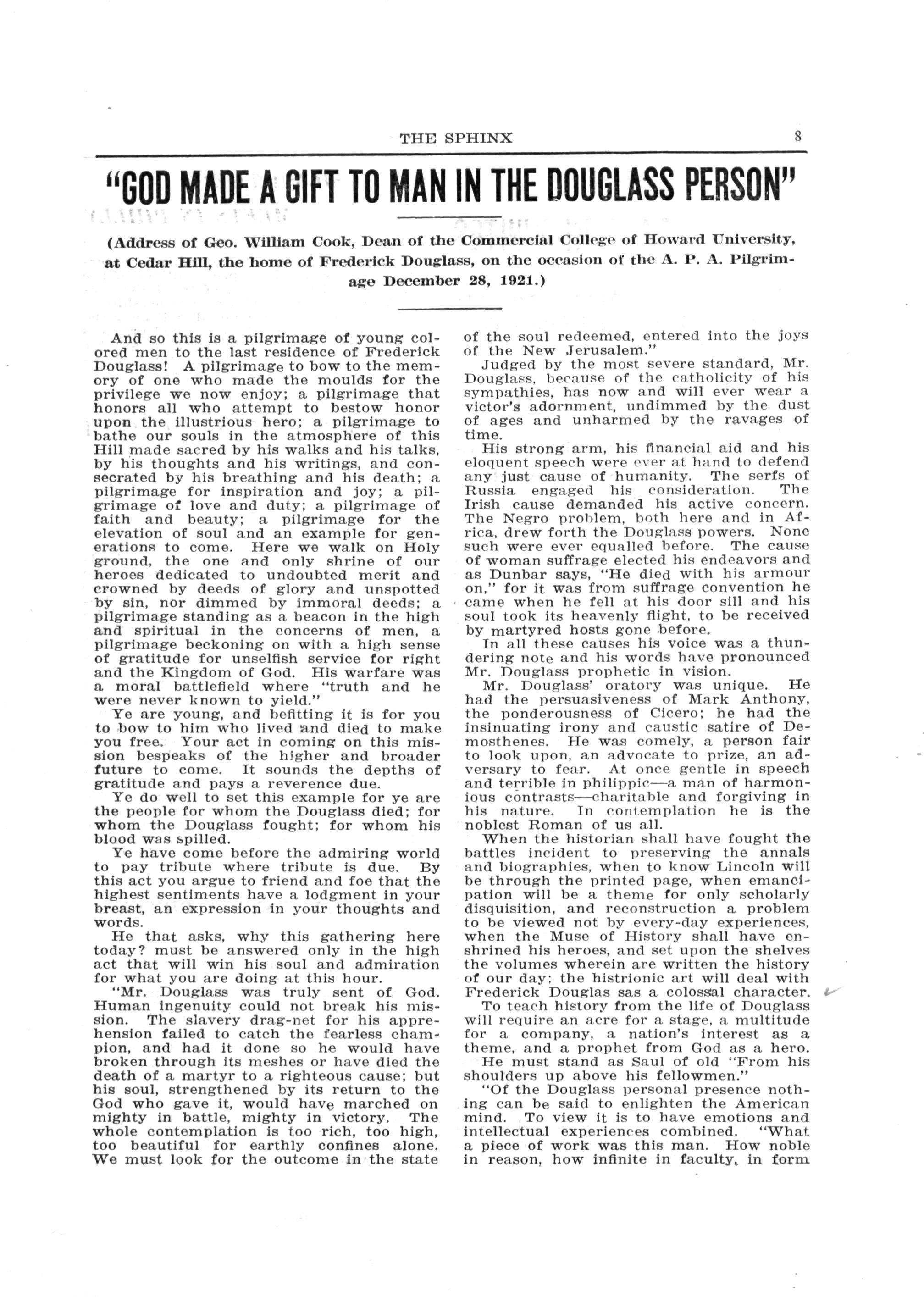 The big event of the Convention was the pilgrimage to Cedar Hill, the home of Frederick Douglass, in Anacostia. Three hundred persons heard eloquent talks by Brother Oscar Brown, of Beta, who presided; Brother George William Cook, Brother George Cleveland Hall, Theta, and Brother President Booker, whose dramatic "Doug- lass, we're here," brought tears to the eyes of the many Responses were made by Dr Georgianna Simpson and Mrs. Lelia Pendleton, on the part of the Frederick Douglass Memorial Association in charge of the restoration of the Home.