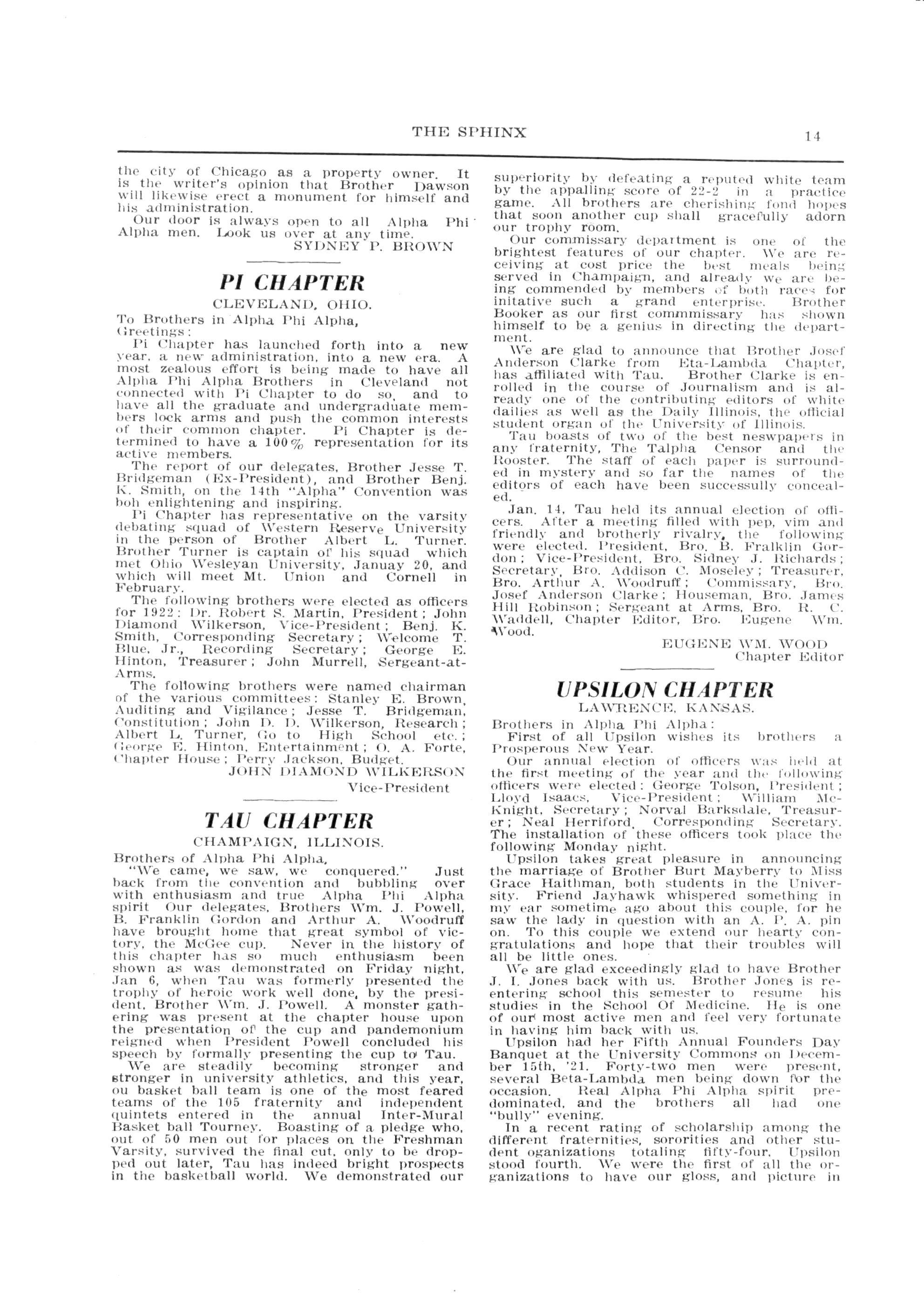 W|Bare glad to have with us during the Xmas holidays Brothers Crocker. Clarke, Harewood Thornton and Wood of Tau; Br Chapman of Epsilon and Brother Mullon formerly of Tau but now attending the Medical School of the University of Wisconsin Brothers "Doug" Reid, XI, Crosswaite, Mu, and Peniston, Tau, have joined us in our home and we hope)that by the operation of the recent rule of the Convention relative to affiliation they, along with several others will be placed on our membership roll Brother "8111" Rose now serves notice "Bill" Jr. will be in St. Louis for the Fifteenth Annual Convention Saturday evening January 14, the following officers were elected for the coming year: President, William Dawson; Vice-President, Louis R. Mlddleton; Secretary, Gordon H. Simpson; Corresponding Secretary, Merrill Curtis; Associate Editor Sphinx, Sydney B Brown; Sergeant-at-Arms, Stanley Thomas; House Manager, H. A. Merchant; Steward, Leon W. Headen