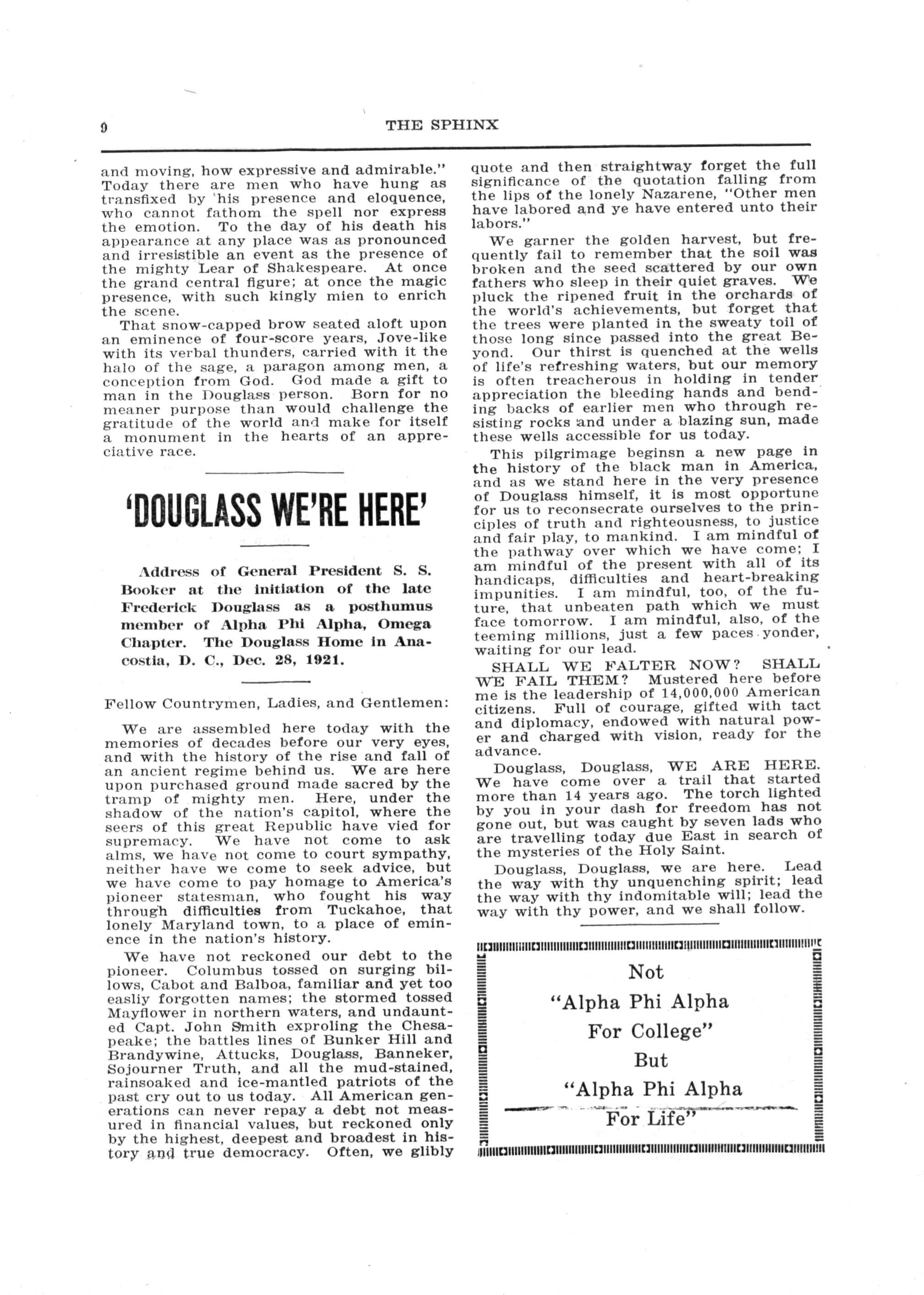 Alpha Phi Alpha Fraternity Done at the end of a pilgrimage to the Frederick Douglass Home in Anacostia, this 28th day of December, 1922.