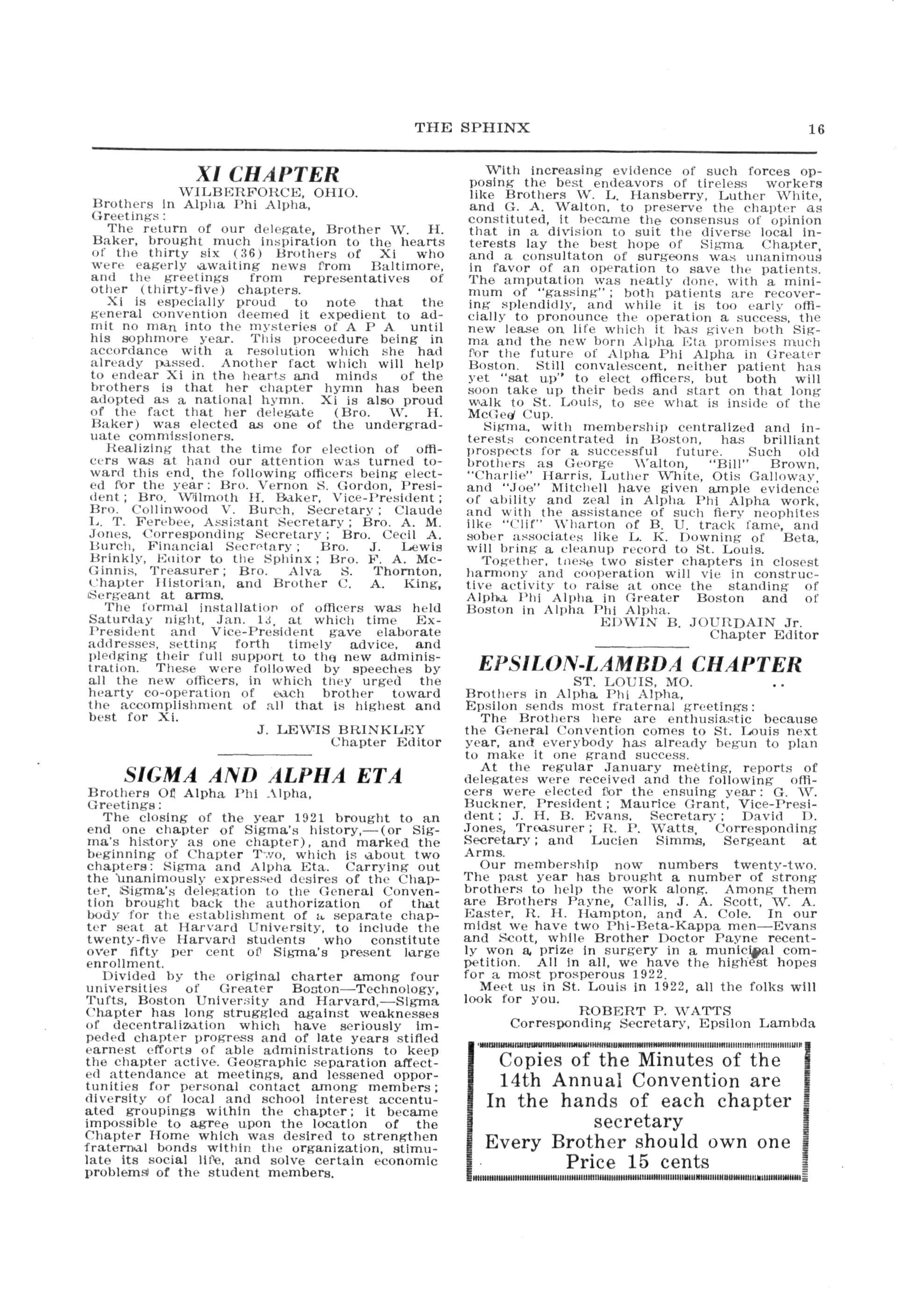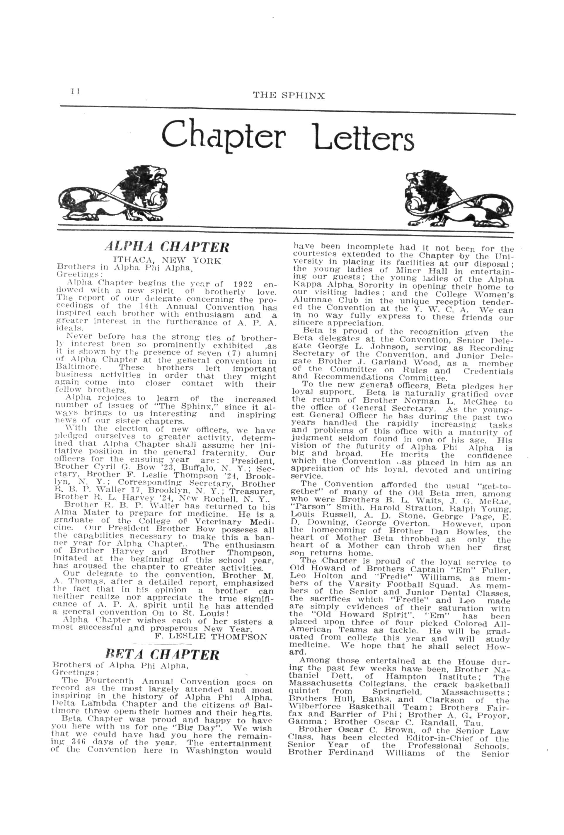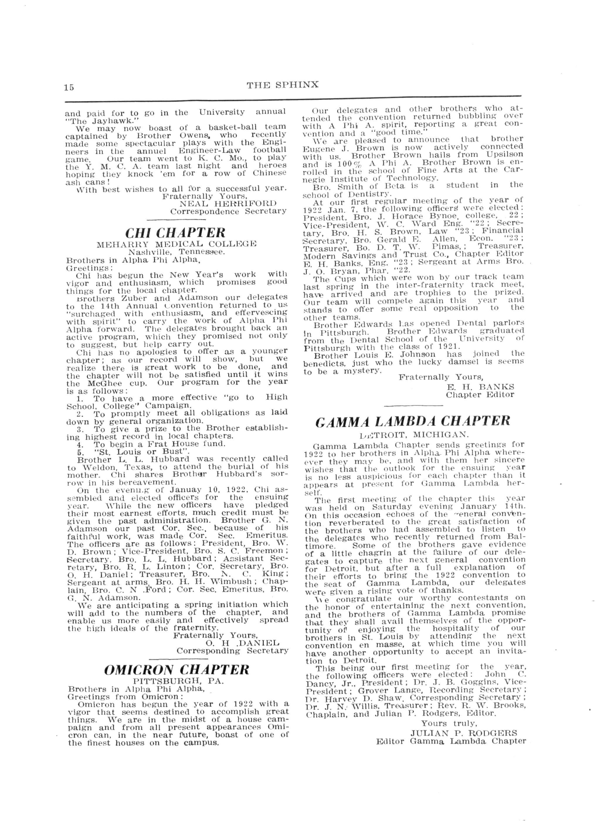 At our first regular meeting of the year of 1922 Jan 7, the following officers' were elected: President Bro J Horace Bynoe college, 22; Vice-President, W C Ward Eng "22; Secretary Bro H S Brown, Law "23; Financial Secretary,'Bro. Gerald E. Allen, Econ. "28; Treasurer Bo D T W Plmas,; Treasurer, Modern Savings and Trust Co. Chapter Editor E H Banks, Eng. "23; Sergeant at Arms Bro. J O Bryan, Phar "22