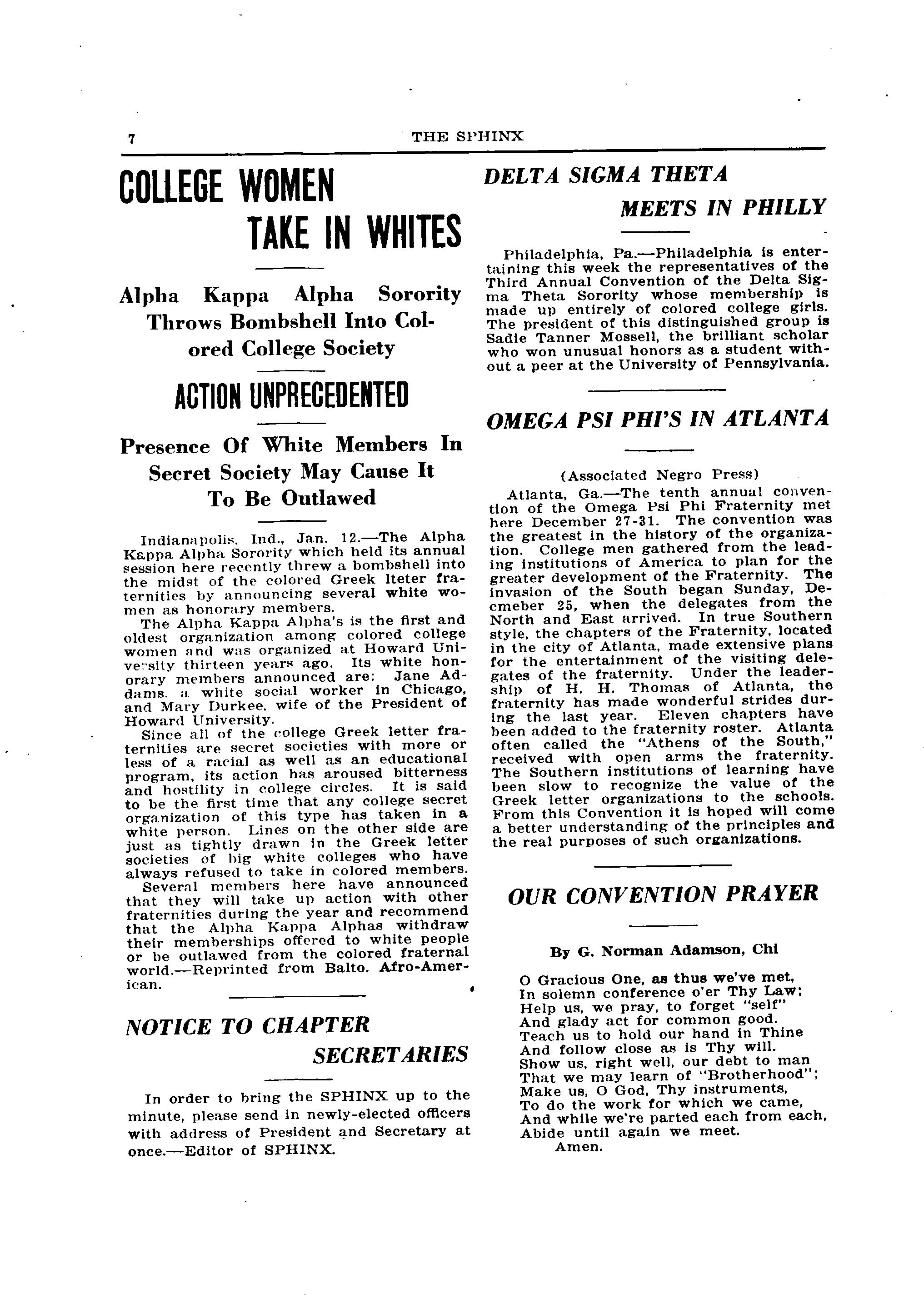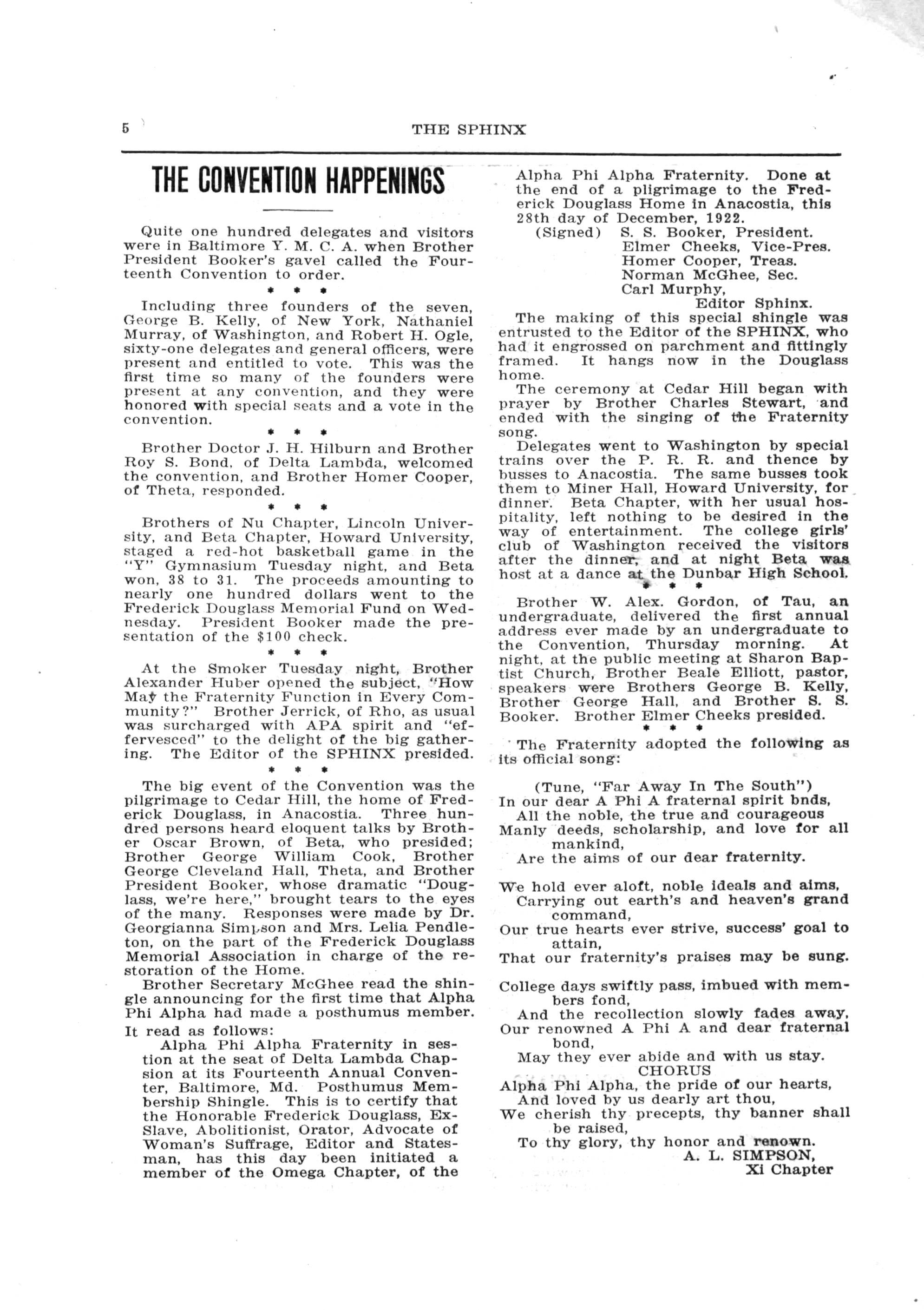 (Signed) S S Booker, President Elmer Cheeks, "Vice-Pres. Homer Cooper, Treas Norman McGhee, Sec Carl Murphy, Editor Sphinx