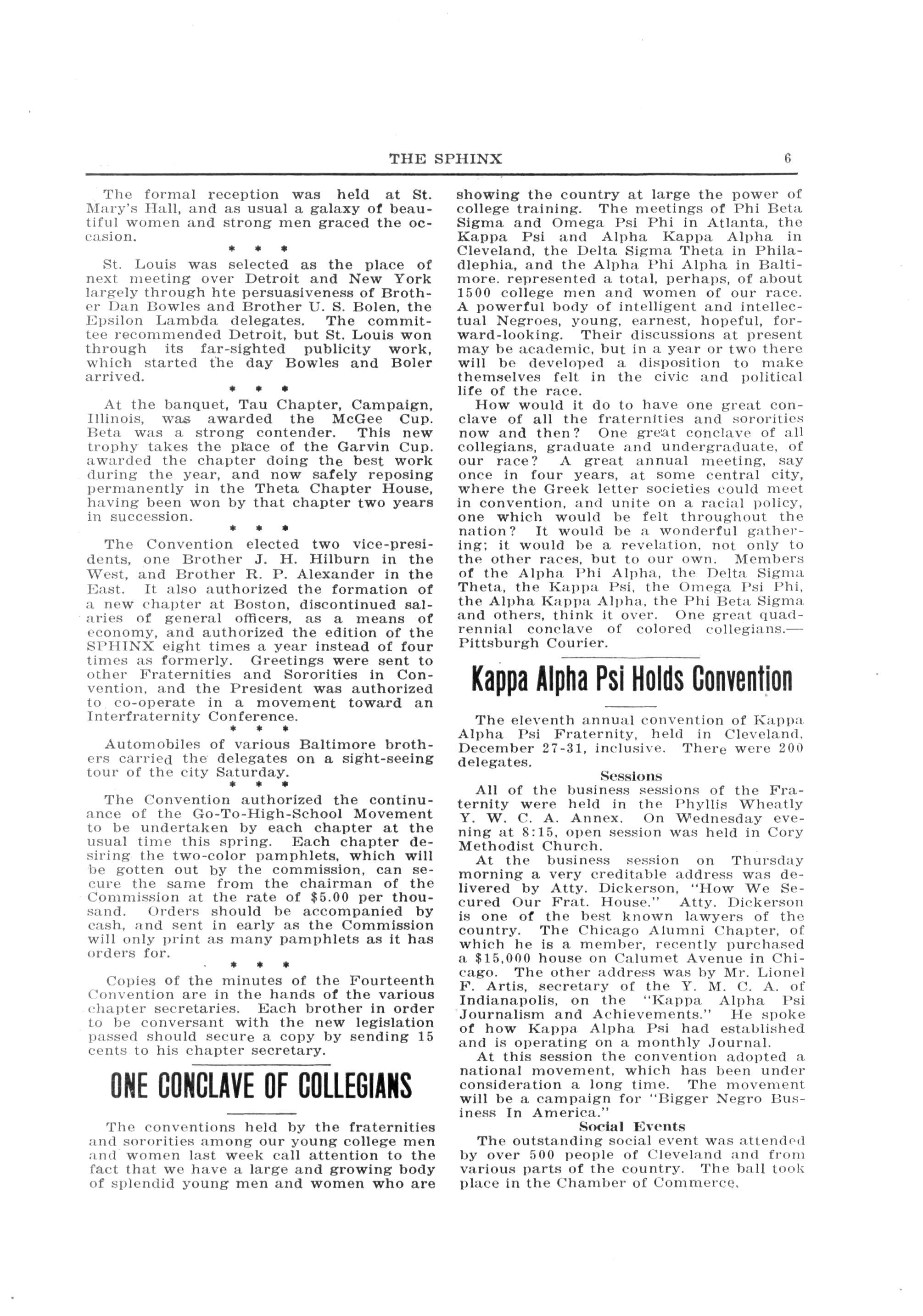 SigmaCup , with membership centralized and Interests concentrated in Boston, has brilliant prospects for a successful future. Such old brothers as George Walton, "Bill" Brown, "Charlie" Harris, Luther White, Otis Galloway, and "Joe" Mitchell have given ample evidence of ability and zeal in Alpha Phi Alpha work, and with the assistance of such fiery neophltes like "Cllf" Wharton of B U track fame, and sober associates like L K Downing of Beta, will bring a cleanup record to St Louis