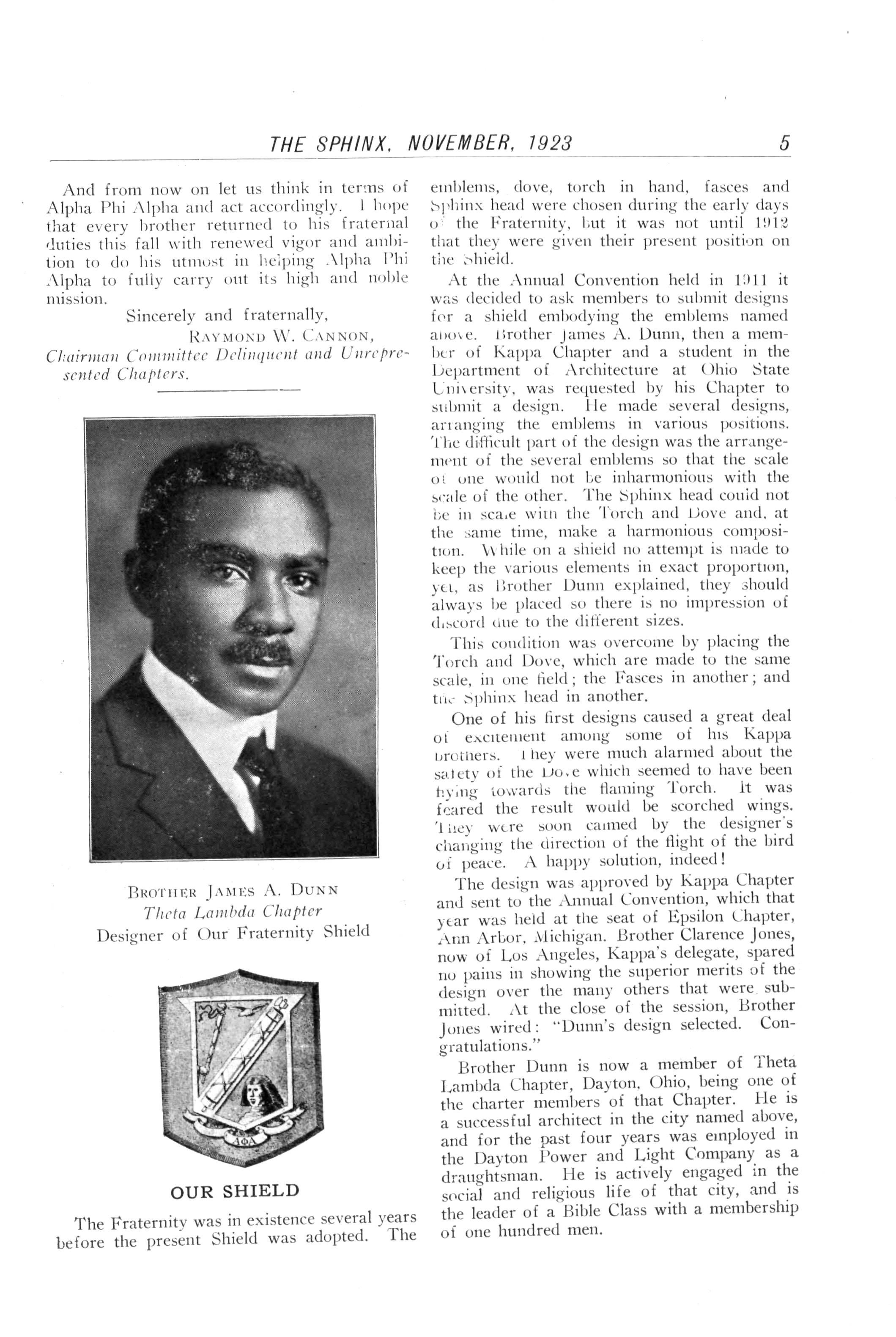 At the Annual Convention held in 191] it wasdecidedtoaskmeml>erstosubmit designs for a shield embodying the emblems named above BrotherJamesA Dunn,thenamember of Kappa Chapter and a student in the Department of Architecture at Ohio State University, was requested by his Chapter to submit a design He made several designs, arranging the emblems in various positions. Thedifficultpartofthedesignwasthearrangement of theseveral emblems sothatthe scale o! one would not be inharmonious with the scaleoftheother TheSphinxheadcouldnot beinsca.e witn the Torch and Dove and at the same time, make a harmonious composition. \\hilconashieldnoattempt ismadeto keepthevariouselementsinexact proportion, yei, as Brother Dunn explained, they should alwavs beplaced sothere isnoimpression of discordduetothedifferent sizes