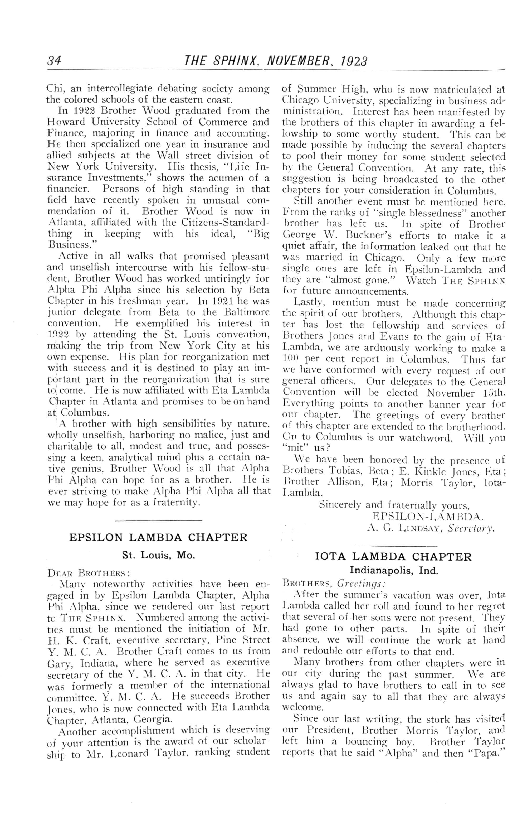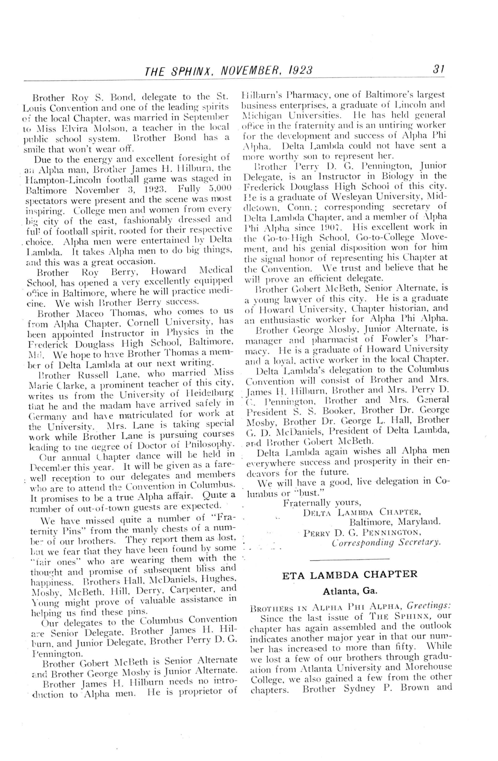 DELTA-LAMBDACHAPTER,Baltimore,Md President,GDMcDaniels,531WHoffmanStreet CorrespondingSecretary,PerryDGPennington,1518McCullohSt EPSILON-LAMBDACHAPTERStLouis,Mo President,DavidDJones,2846PineStreet Secretary,PJHauser2S40PineStreet
