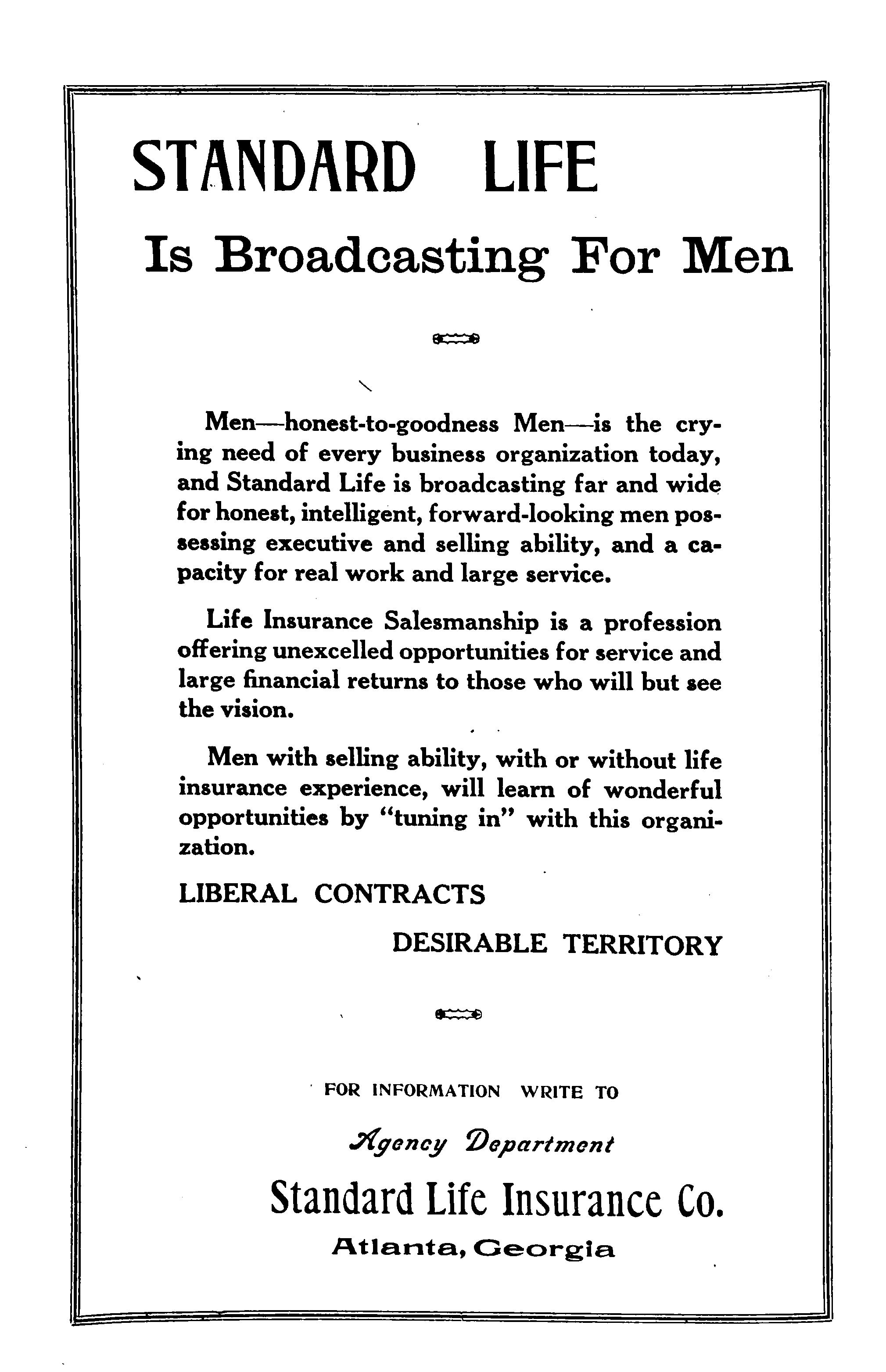 Men—honest-to-goodness Men—is the crying need of every business organization today, and Standard Life is broadcasting far and wide for honest, intelligent, forward-looking men possessing executive and selling ability, and a capacity for real work and large service.