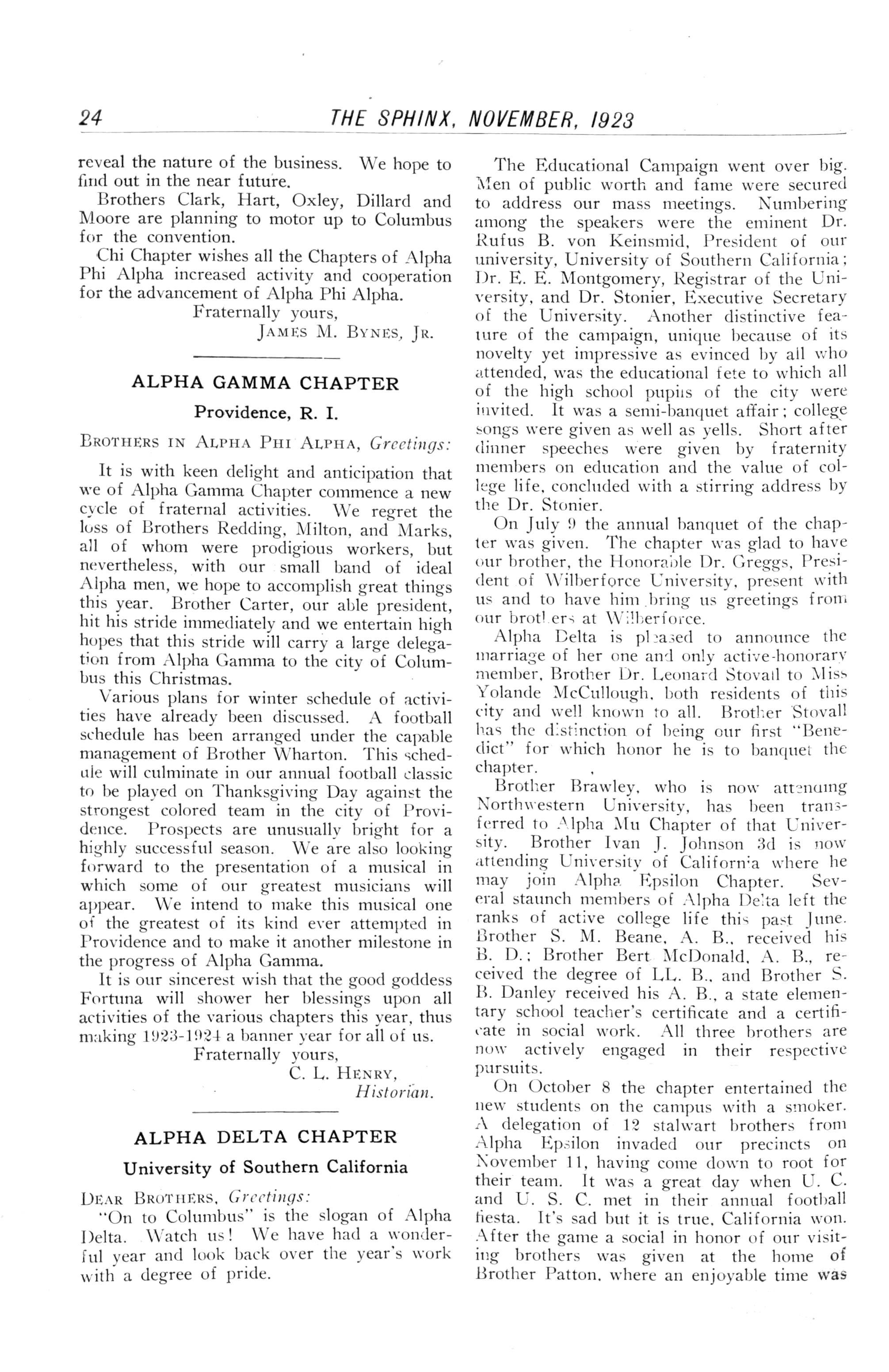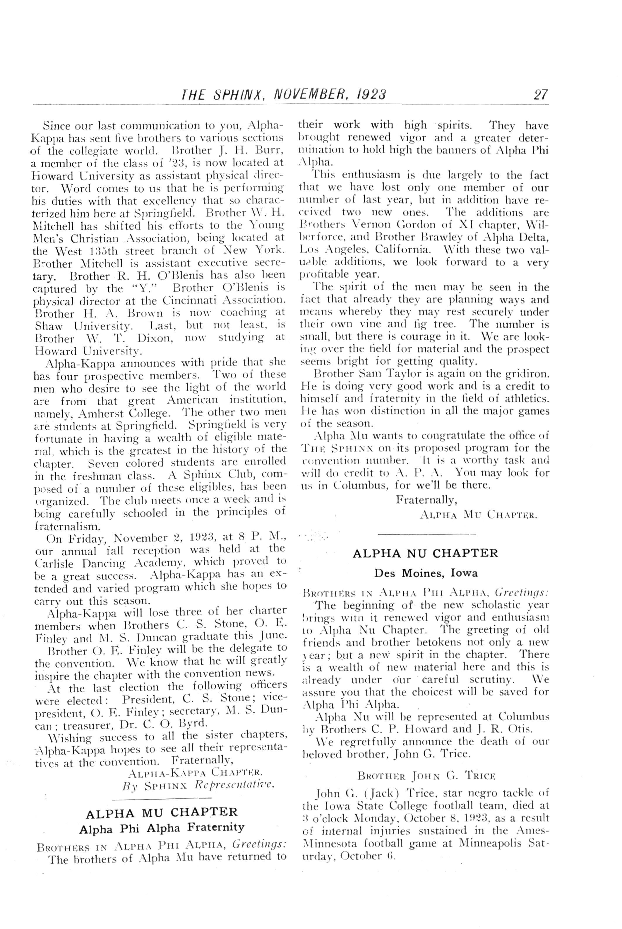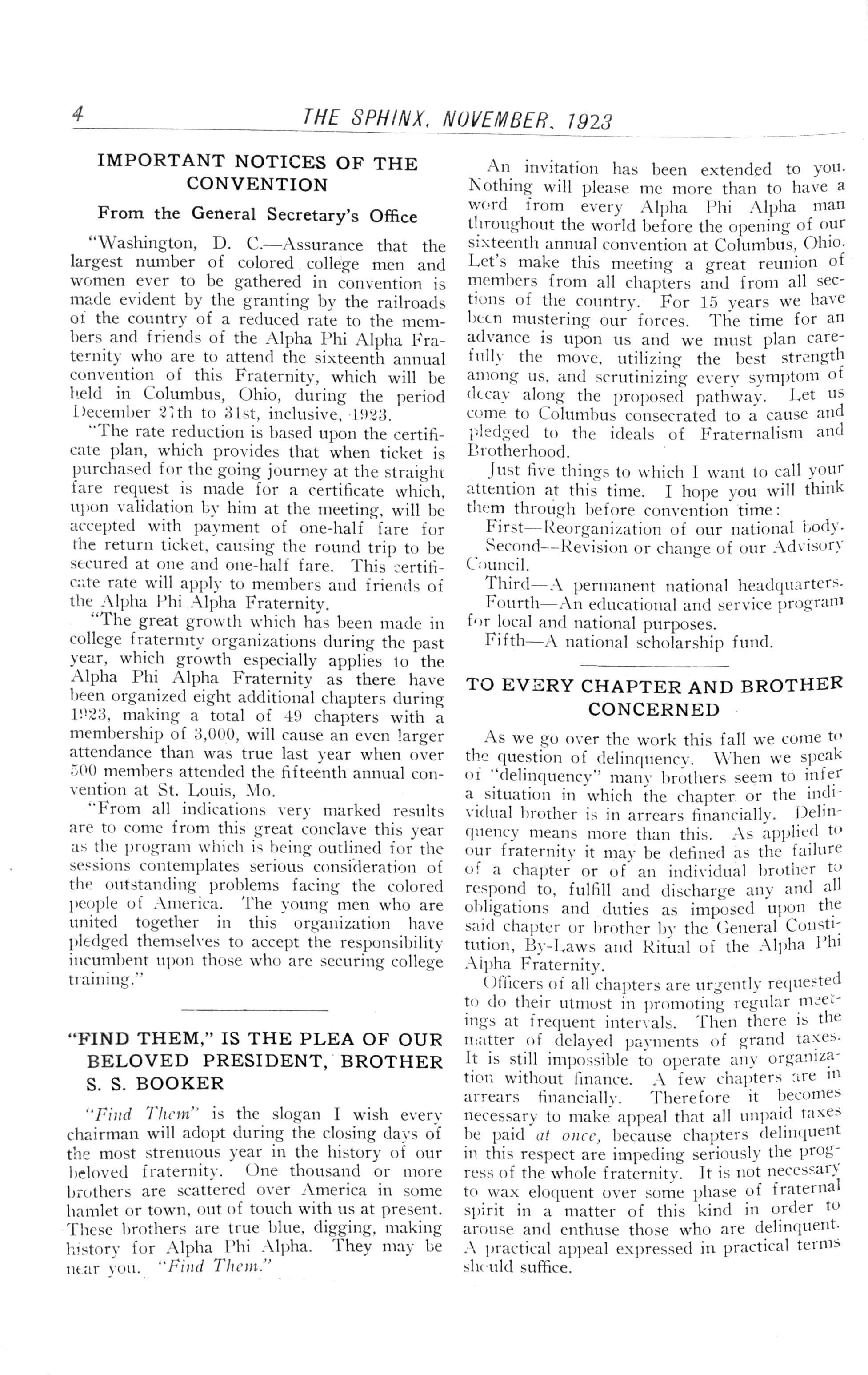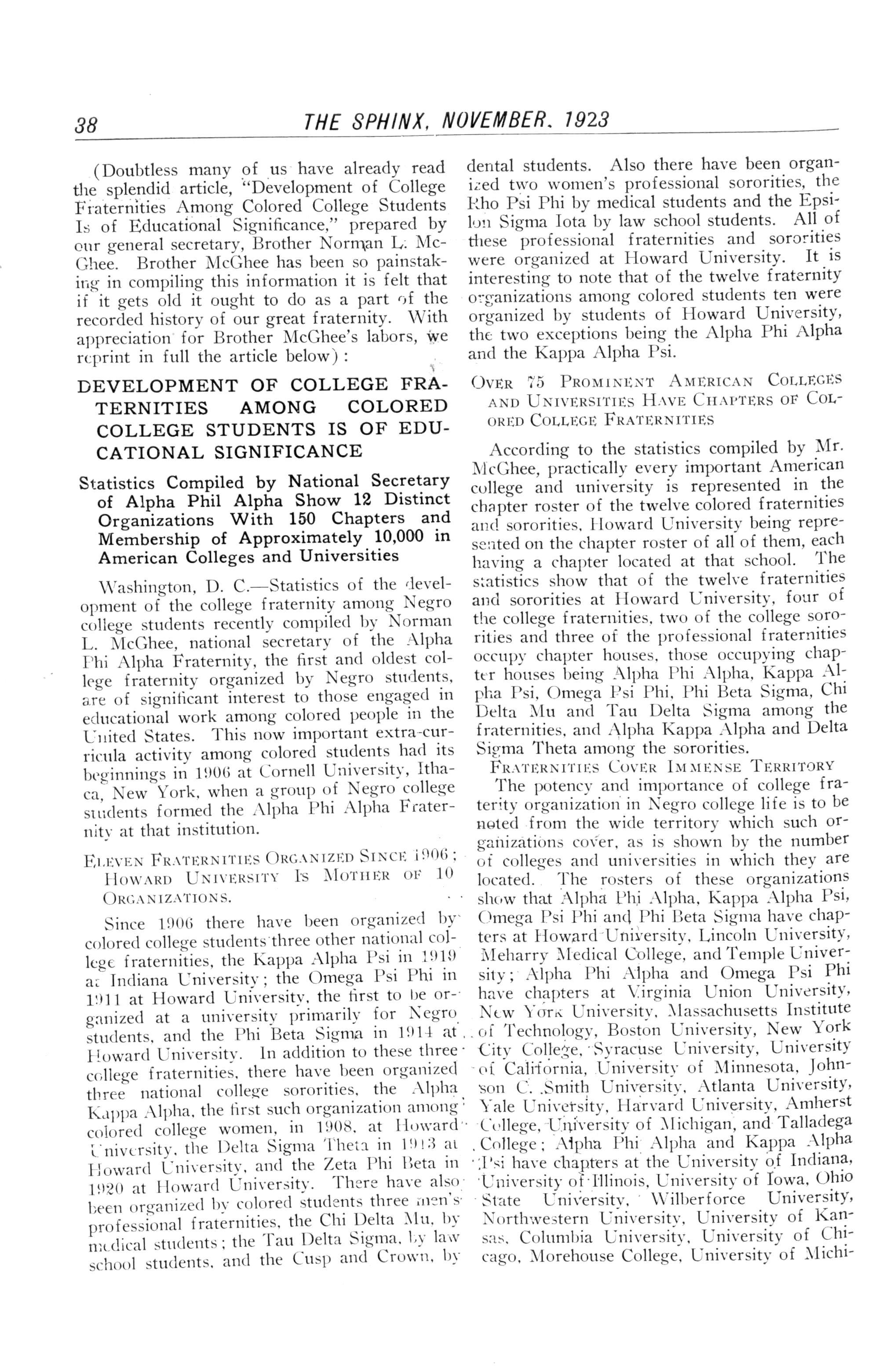 "Thegreatgrowthwhichhasbeenmadein collegefraternity organizationsduringthepast year, which growth especially applies 1Othe Alpha Phi Alpha Fraternity as there have beenorganizedeightadditionalchaptersduring Lf*23, making a total of 49 chapters with a membershipof3,000,willcauseaneven larger attendance than wastruelastyearwhen over 500membersattendedthe fifteenth annualconventionatSt Louis, Mo