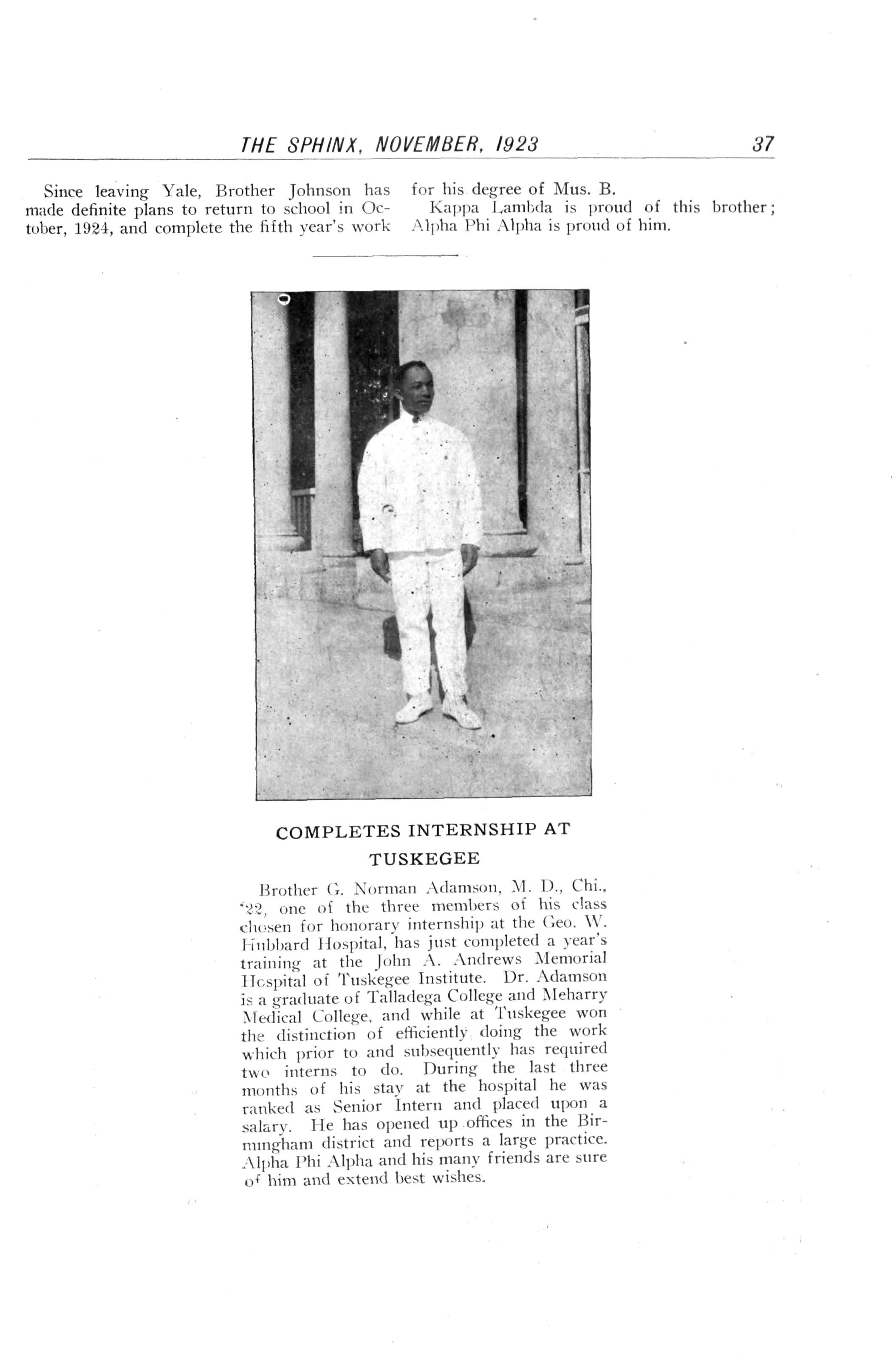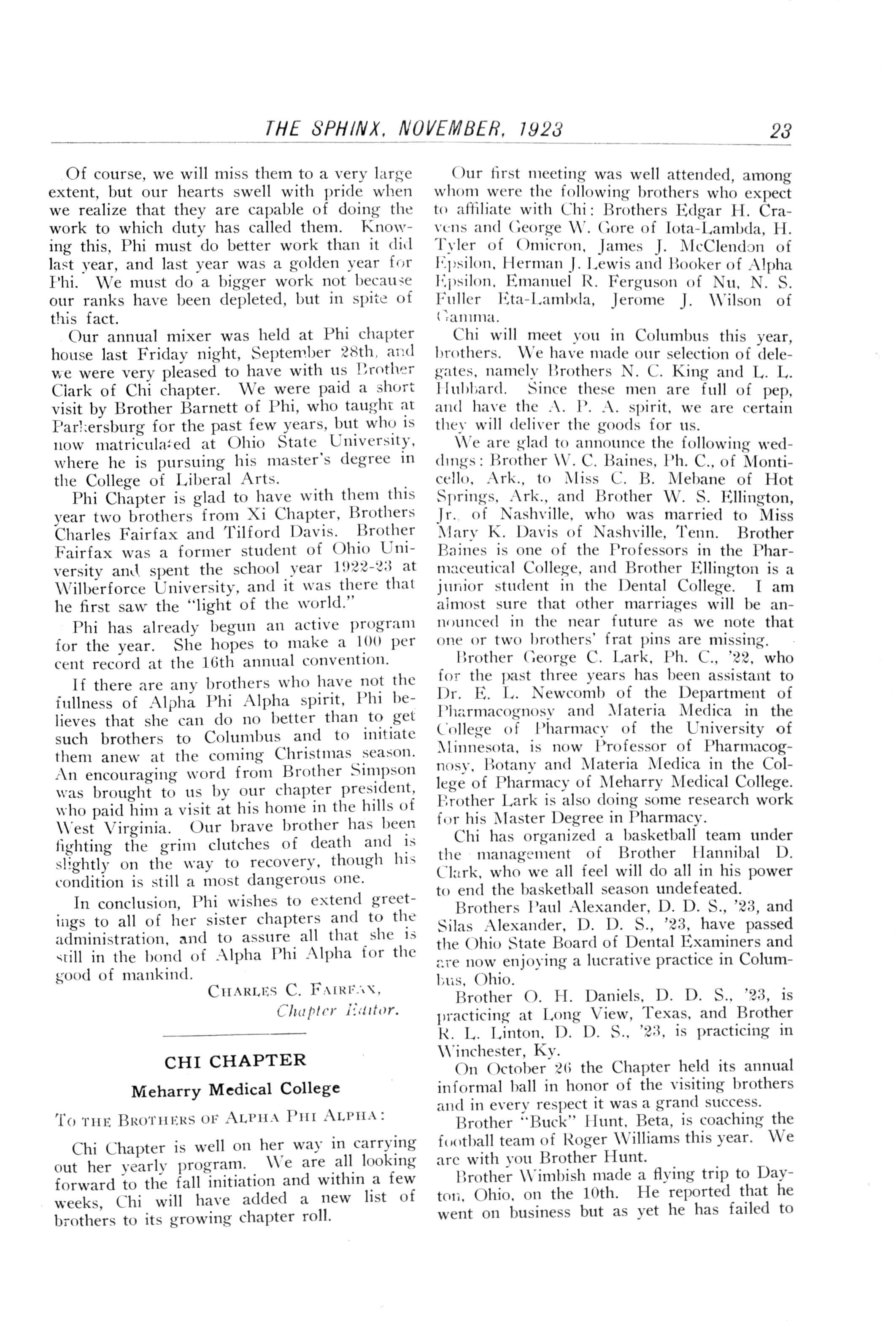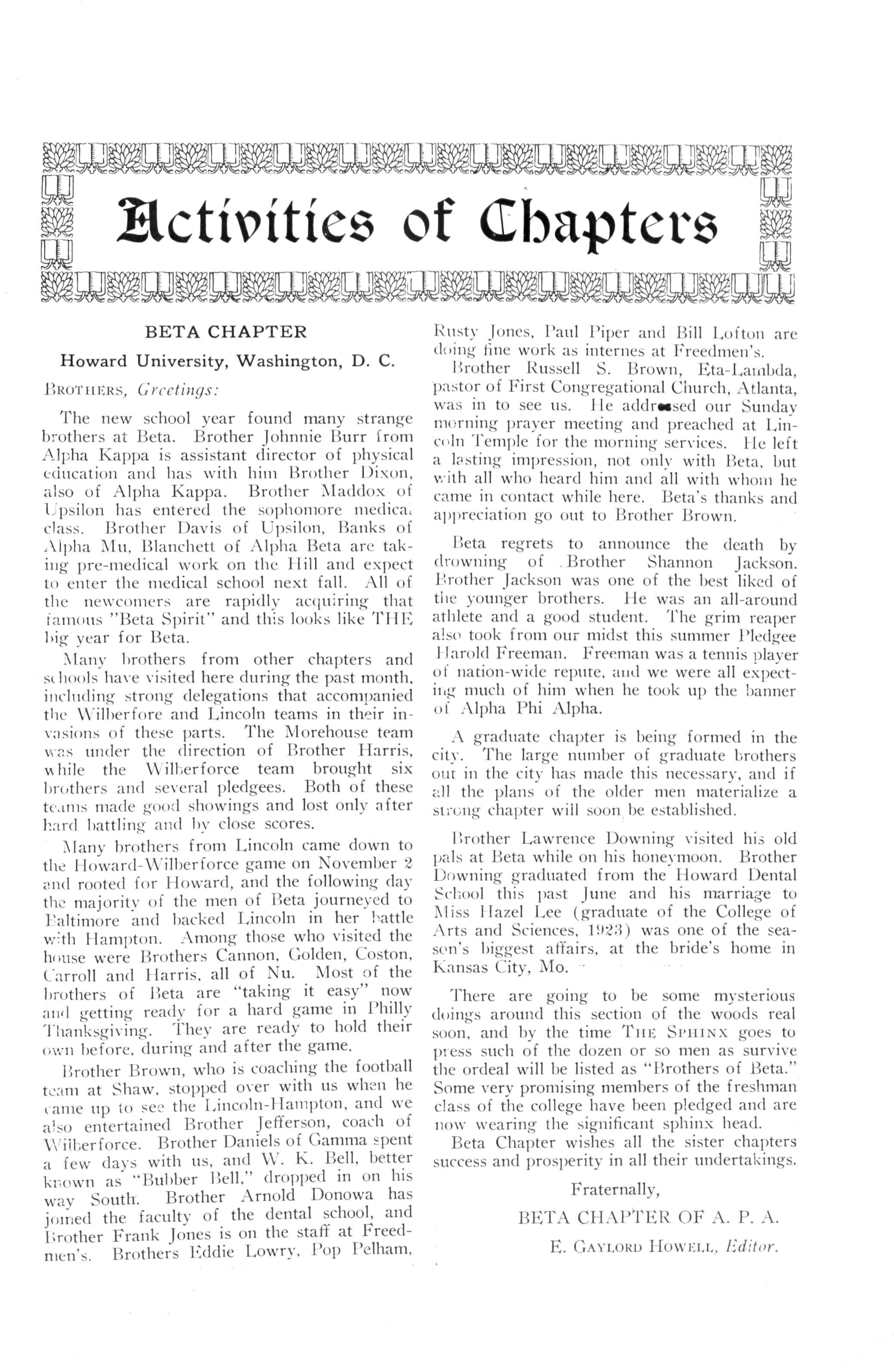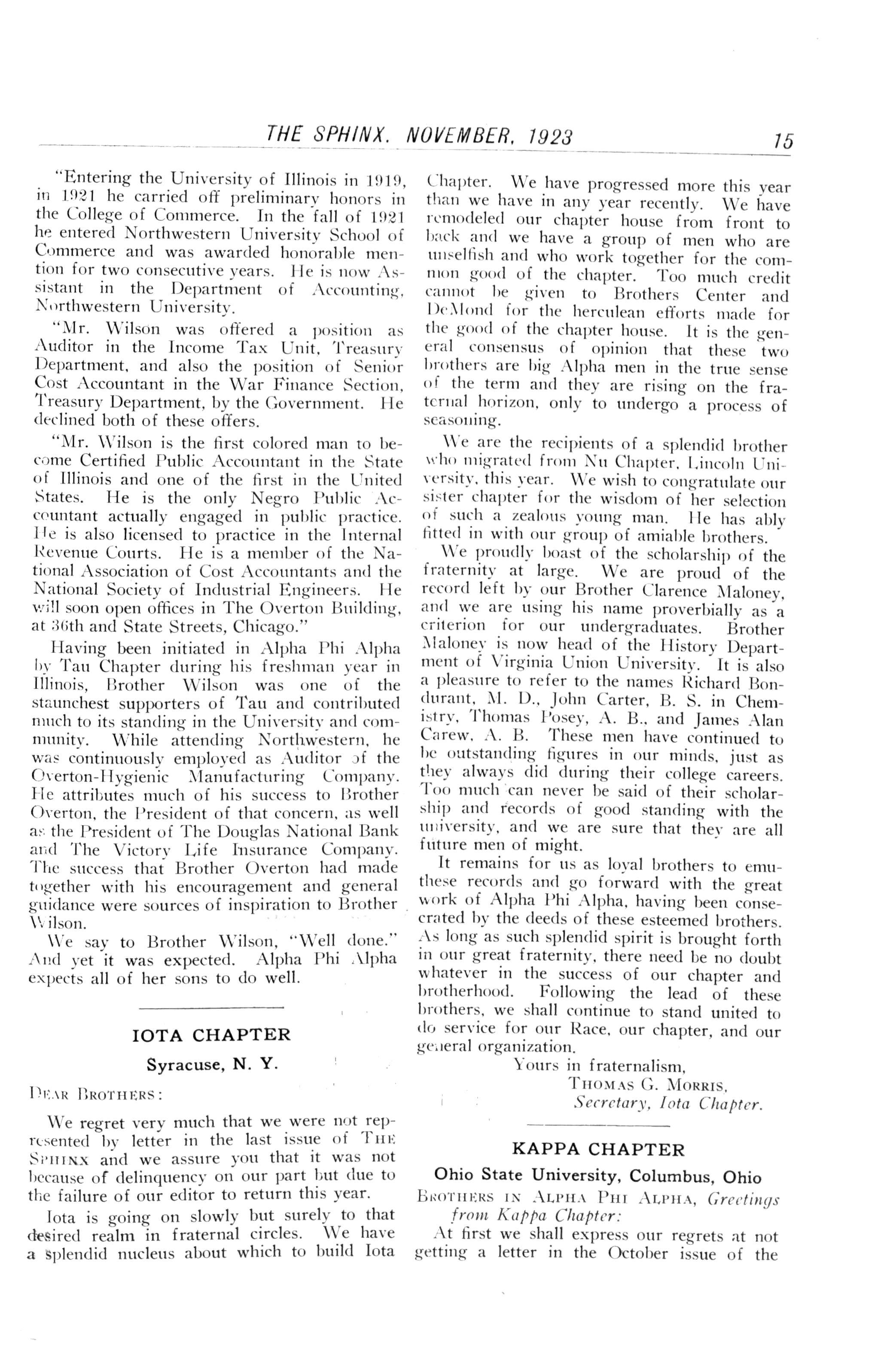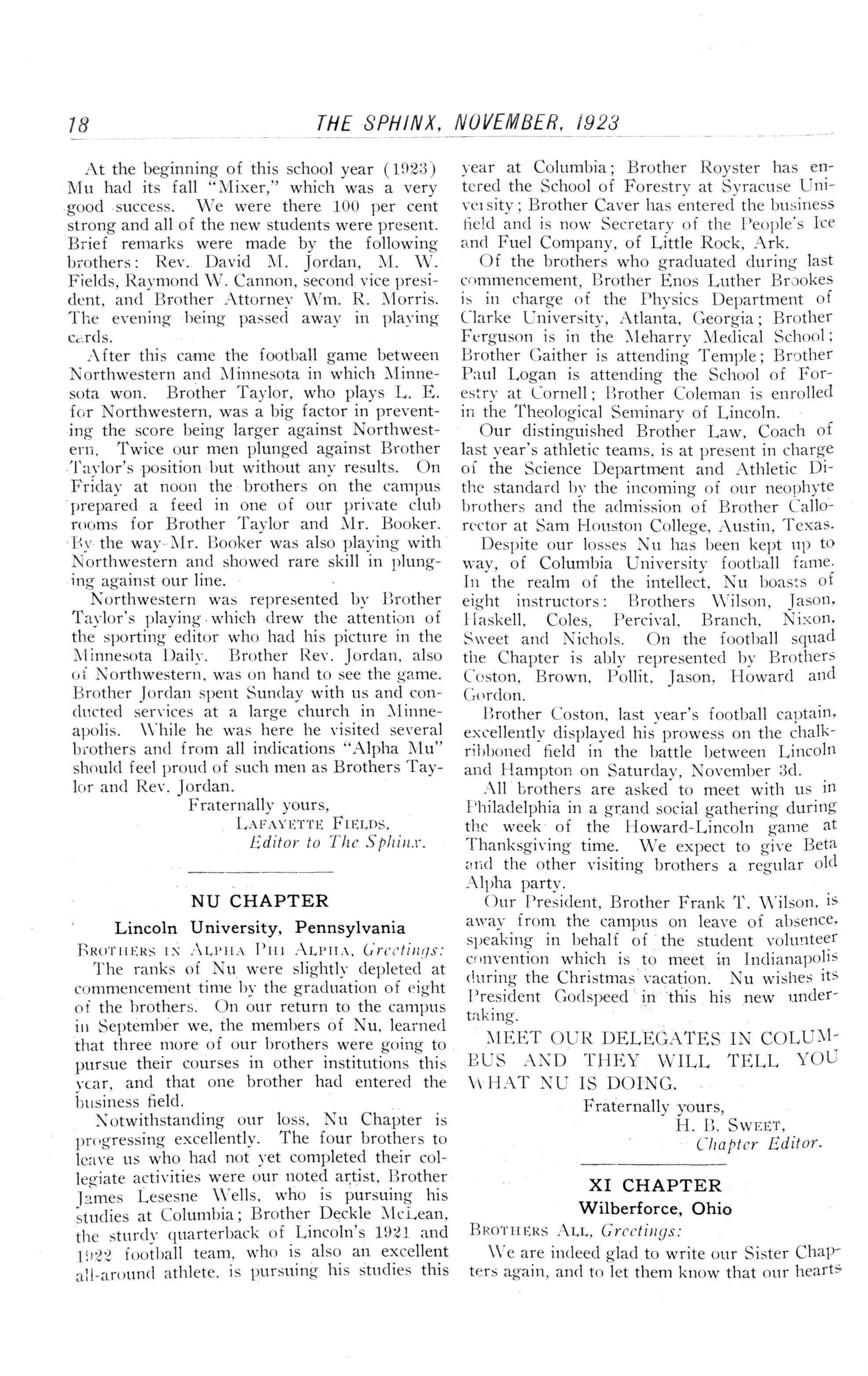 "Thegreatgrowthwhichhasbeenmadein collegefraternity organizationsduringthepast year, which growth especially applies 1Othe Alpha Phi Alpha Fraternity as there have beenorganizedeightadditionalchaptersduring Lf*23, making a total of 49 chapters with a membershipof3,000,willcauseaneven larger attendance than wastruelastyearwhen over 500membersattendedthe fifteenth annualconventionatSt Louis, Mo
