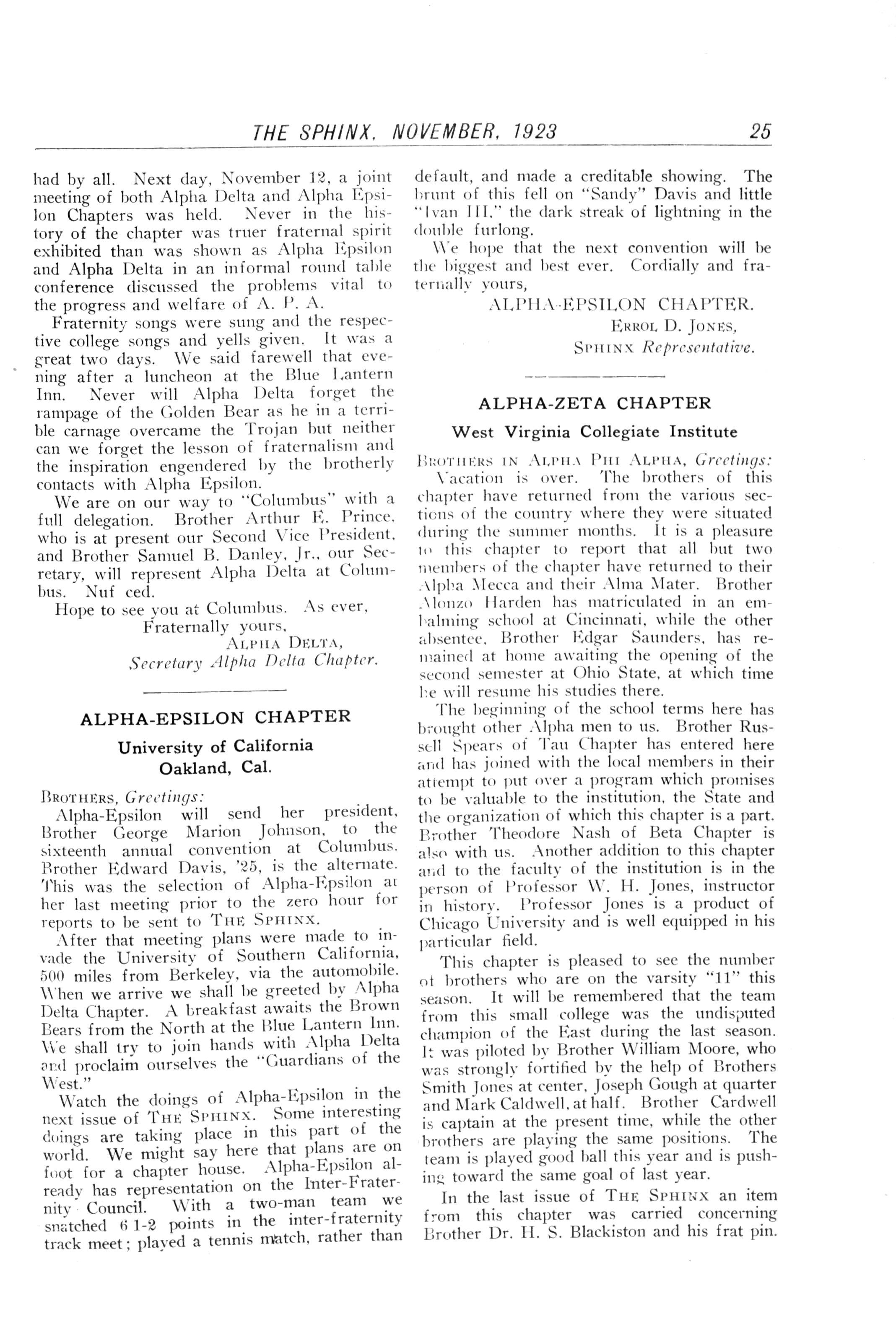 ALPHA-EPSILONCHAPTER,UniversityofCalifornia,Oakland.,Calif President,GeorgeMJohnson,54733rdStreet CorrespondingSecretary,ErrollAJones,820LindenStreet