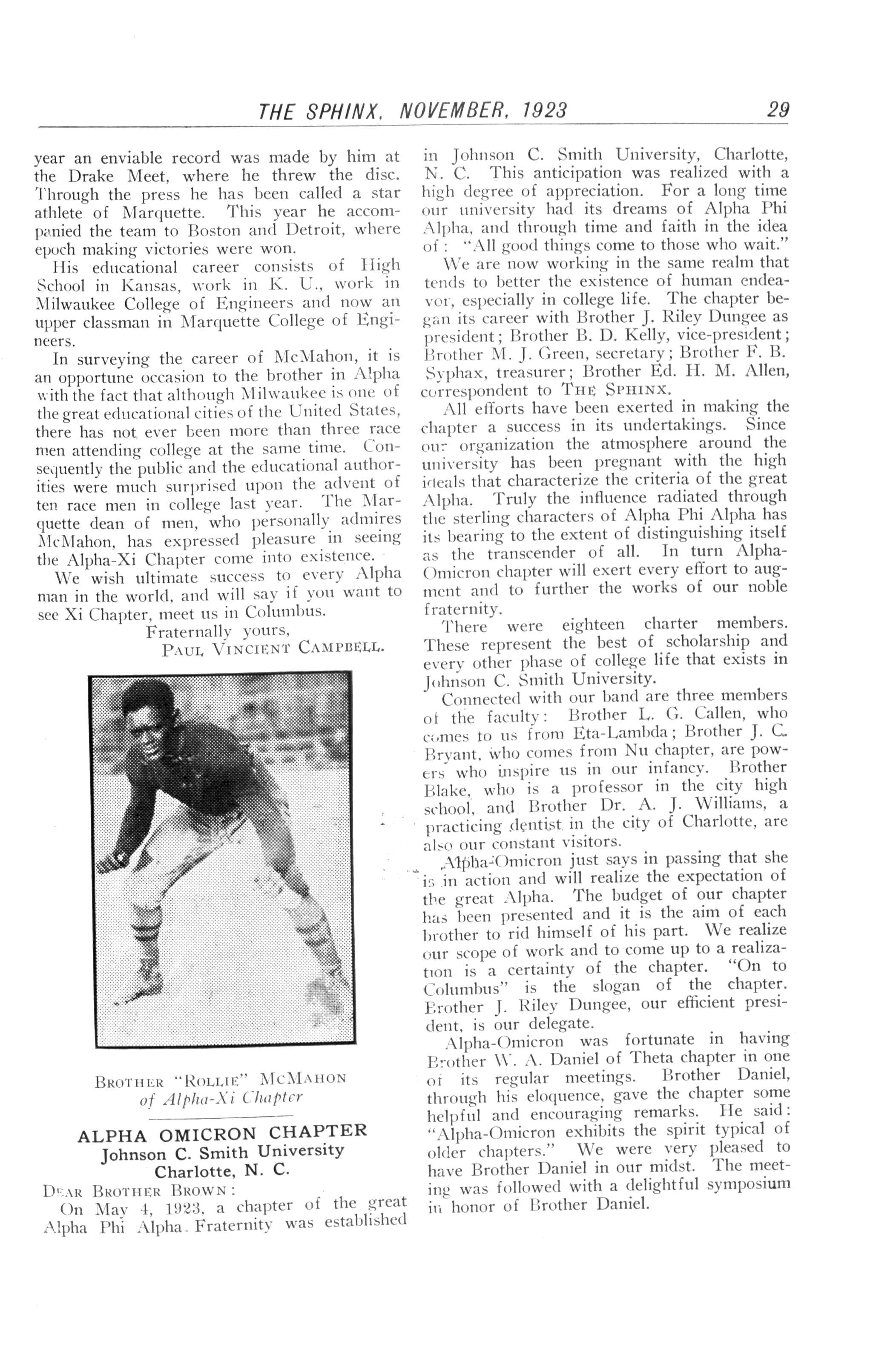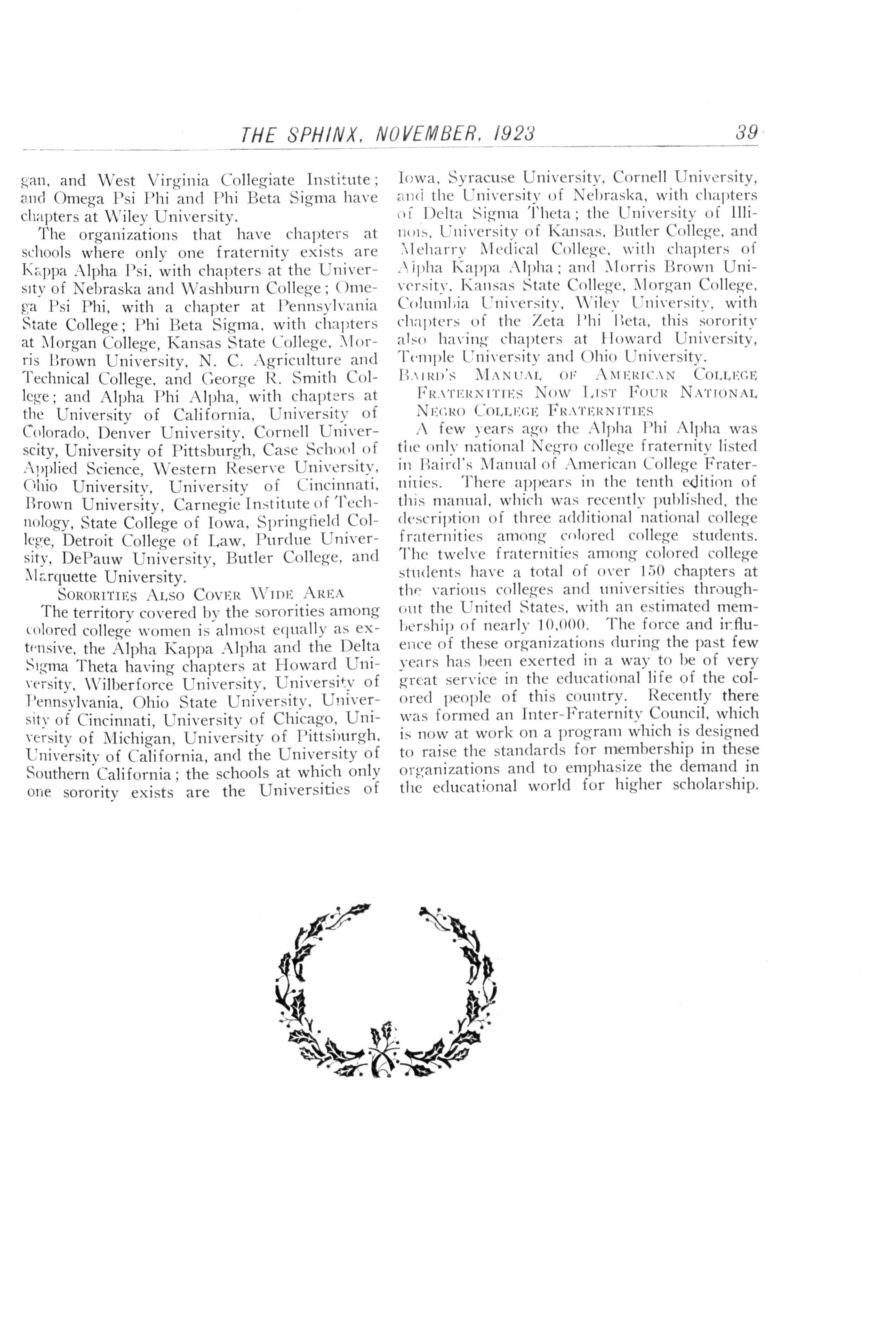 Accordingtothestatisticscompiled by Mr McGhee,practicallyeveryimportant American college and university is represented in the chapterrosterofthetwelvecolored fraternities andsororities,HowardUniversitybeingrepresentedonthechapterrosterofallofthem,each having achapter located at that school The statistics show that of the twelve fraternities and sororities at Howard University, four of thecollegefraternities,twoofthecollegesororitiesandthreeof theprofessional fraternities occupy chapter houses,those occupying chapterhousesbeingAlpha Phi Alpha,Kappa AlphaPsi,OmegaPsi Phi,PhiBetaSigma,Chi Delta Mu and Tau Delta Sigma among the fraternities,andAlphaKappaAlphaand Delta SigmaThetaamongthesororities.