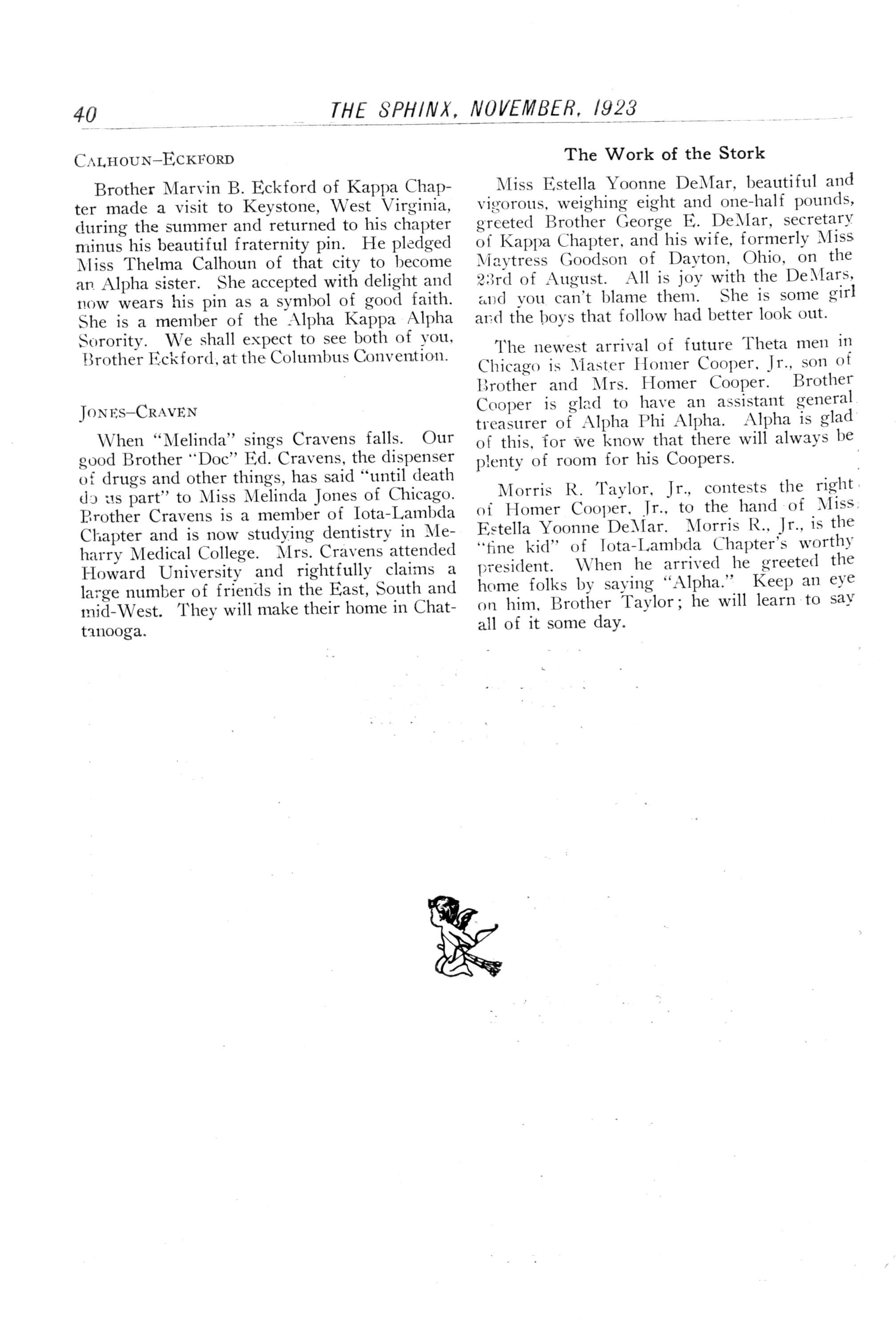 Brother Marvin B. Eckford of Kappa Chapter made a visit to Keystone, West Virginia, during the summer and returned to his chapter minus his beautiful fraternity pin. He pledged Miss Thelma Calhoun of that city to become an Alpha sister. She accepted with delight and now wears his pin as a symbol of good faith. She is a member of the Alpha Kappa Alpha Sorority We shall expect to see both of you Brother Eckford at the Columbus Convention