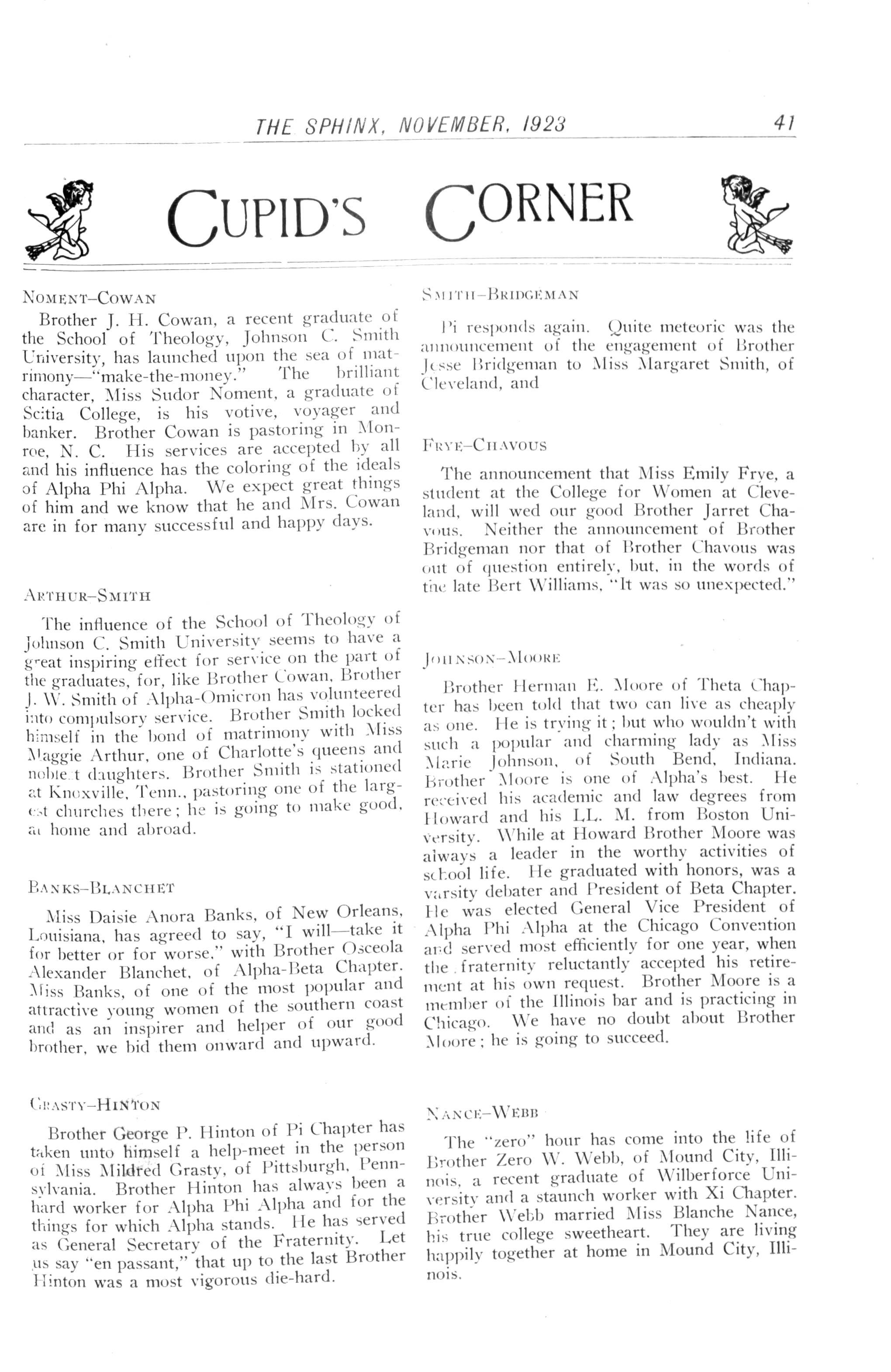 Brother J H Cowan, arecent graduate of the School of Theology, Johnson C. Smith University,haslaunchedupon theseaof matrimony—"make-the-money." The brilliant character, Miss Sudor Noment, agraduateof Scitia College, is his votive, voyager and hanker Brother Cowan ispastoring in Monroe, N C His services areaccepted hy all andhisinfluencehasthecoloringoftheideals ofAlpha PhiAlpha. Weexpect great things ofhimandweknowthat heandMrs Cowan areinformanysuccessful andhappydays