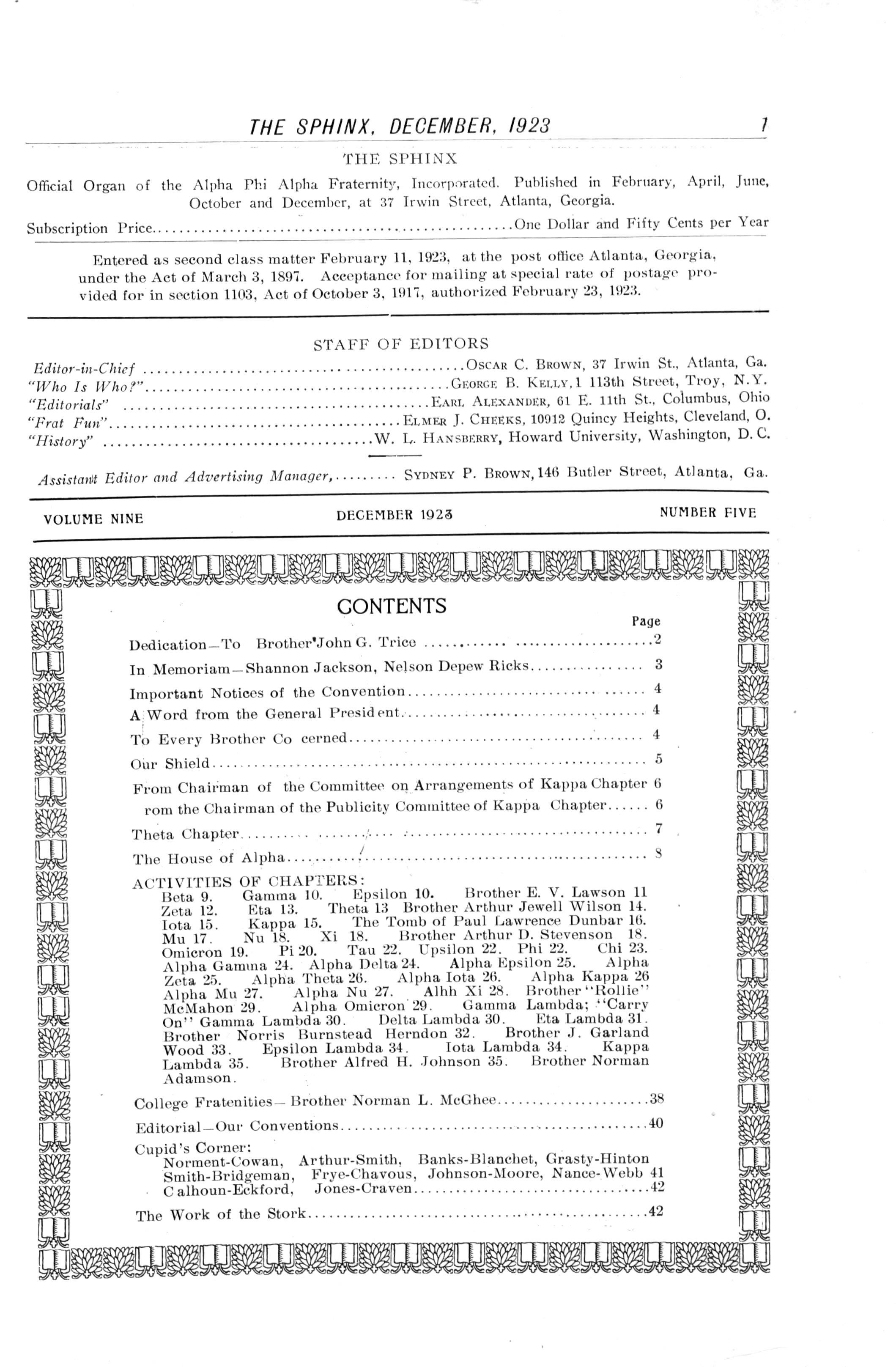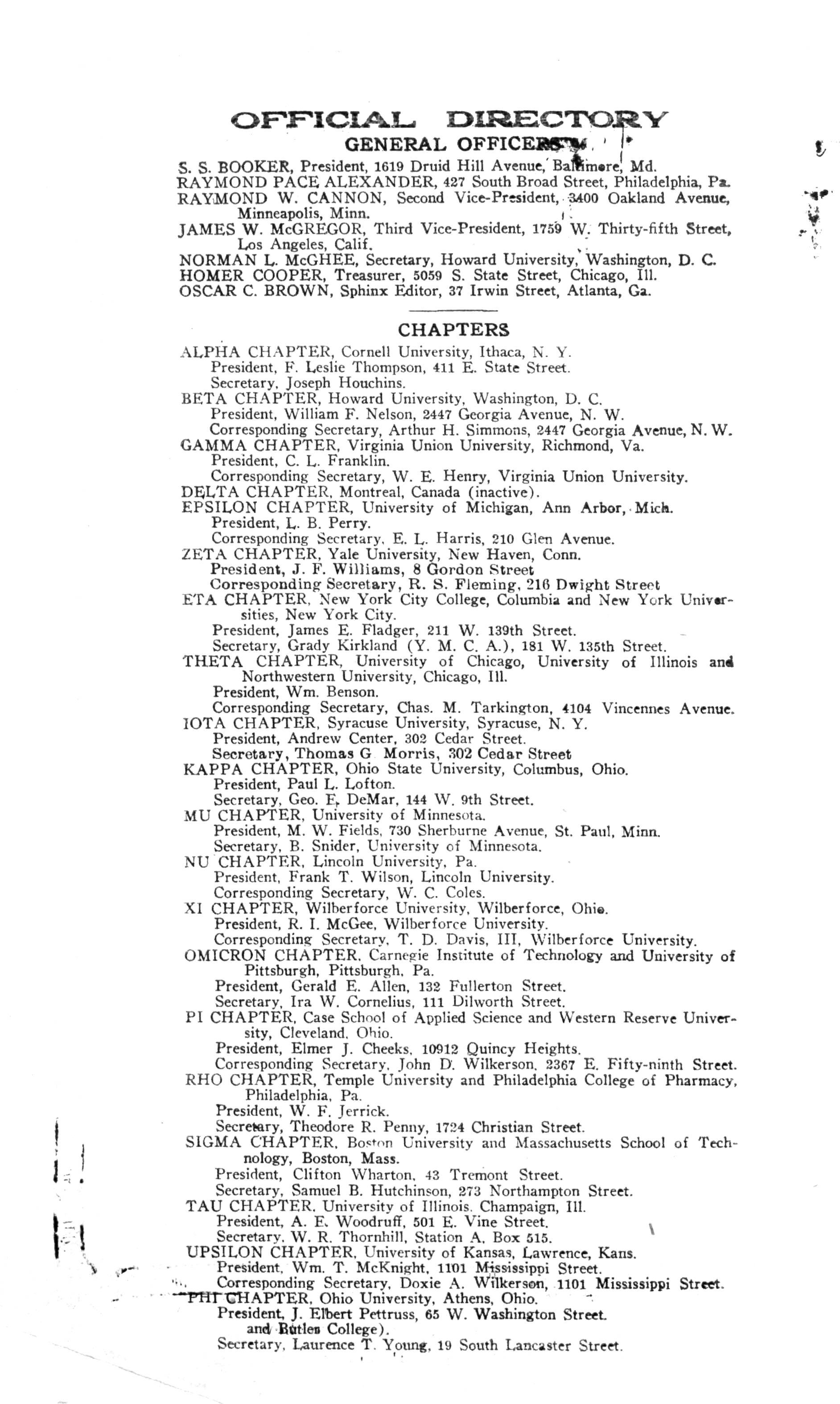 SSBOOKER,President,1619DruidHillAvenue,'Bamm»re'Md RAYMONDPACEALEXANDER,427SouthBroadStreet,Philadelphia,Pa RAYMONDWCANNON,SecondVice-President,&400Oakland Avenue, "** Minneapolis,Minn i li JAMESWMcGREGOR,ThirdVice-President,1759WThirty-fifth Street, LosAngeles,Calif v * ' NORMANLMcGHEE,Secretary,HowardUniversity,Washington,DC HOMERCOOPER,Treasurer,5059SStateStreet,Chicago,111 OSCARCBROWN,SphinxEditor,37IrwinStreet,Atlanta,Ga