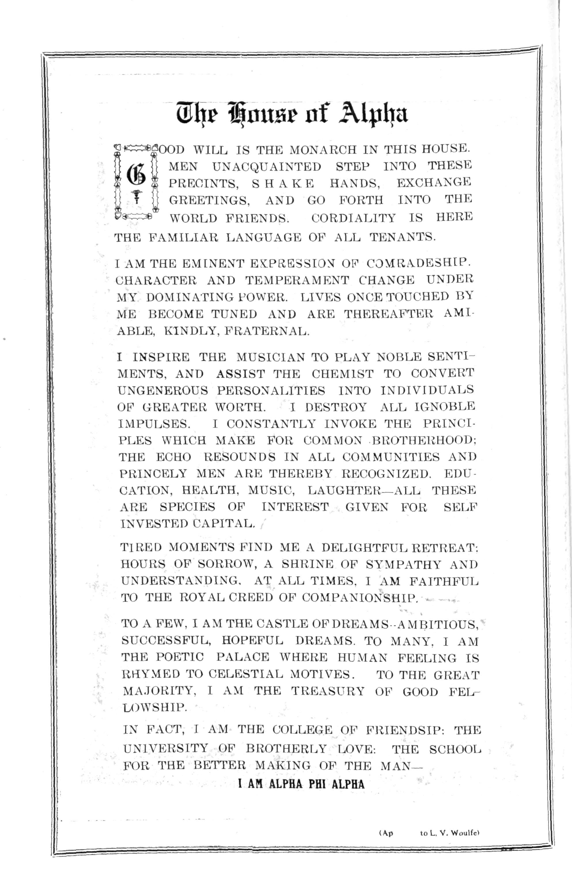 As wedraw backtheveilthat separatesus from yesteryear,werecognizeone outstanding influence that hasbeen coeval with our existence and concomitant with our growth. HARMONY hasat alltimes prevailed Let us, then, as our sixteenth milestone pushes silentlyabovethehorizon,seektheconfinesof oursanctuaryandinvokethegodstoassureus a continuance of that divine favor that has helpedtomakeuswhatweareandwhichwill insure us with a perfection of security commensurate with our endeavors and as lasting asourideals