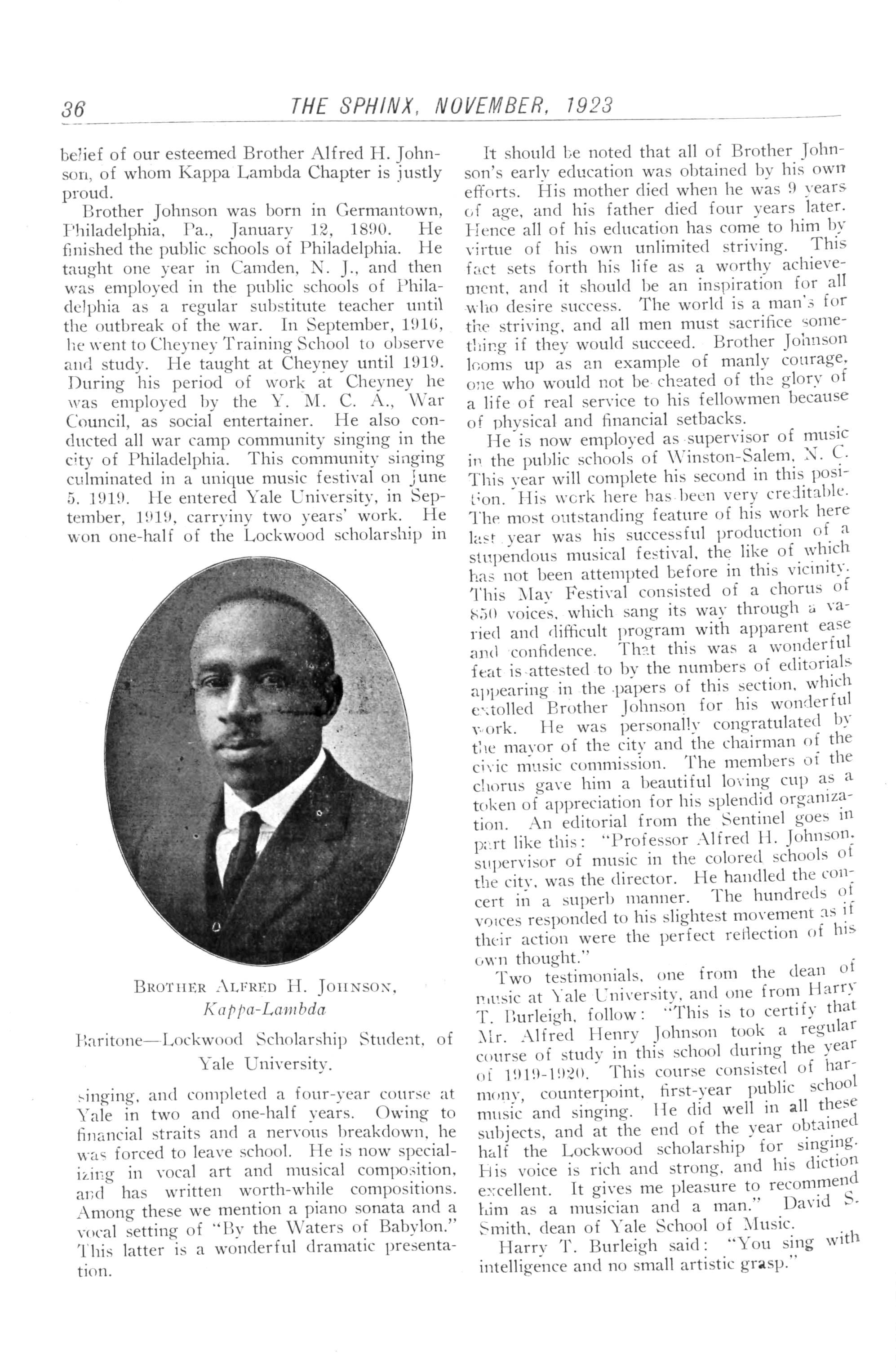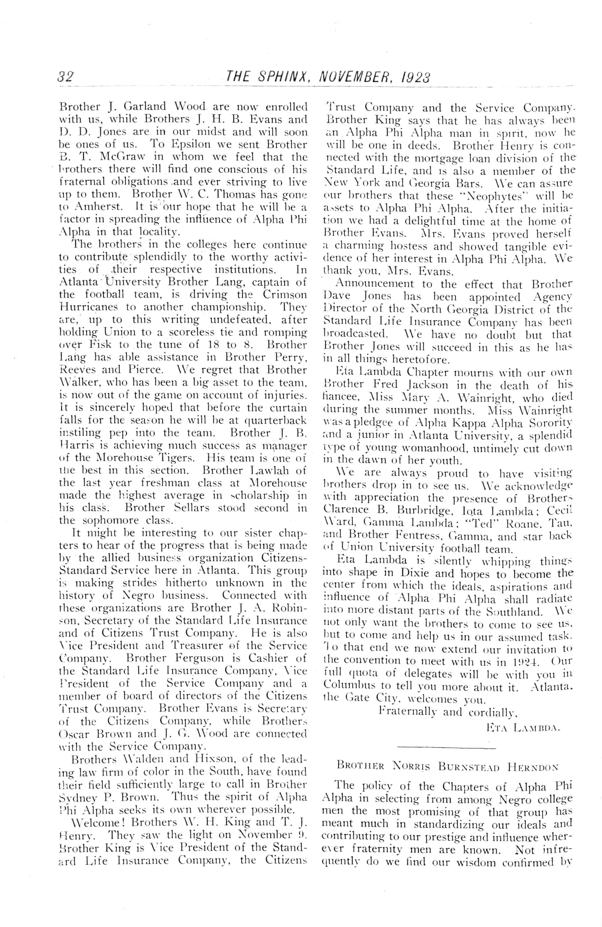 As wemeet in Columbus wewill notethe efficacy of suchaplan. Herewewill receive prima facie evidence of the solidity of the parentorganizationandtheco-ordinationmanifestinitsworkingpartsasrepresentedbythe General Officers and the Chapter Representatives Herewewillbeabletosensethepotentialities of organized effort Here we will realizethatco-operation isnotonlyawordof pleasing consonance, but is significant of accrued benefits and hopes of greater achievements We will once more drink deep from the fountain that inspires us to cherish the idealsof Alpha Phi Alpha; tocontribute unselfishlytoherprinciples;andtokeepunsullied her fair name.