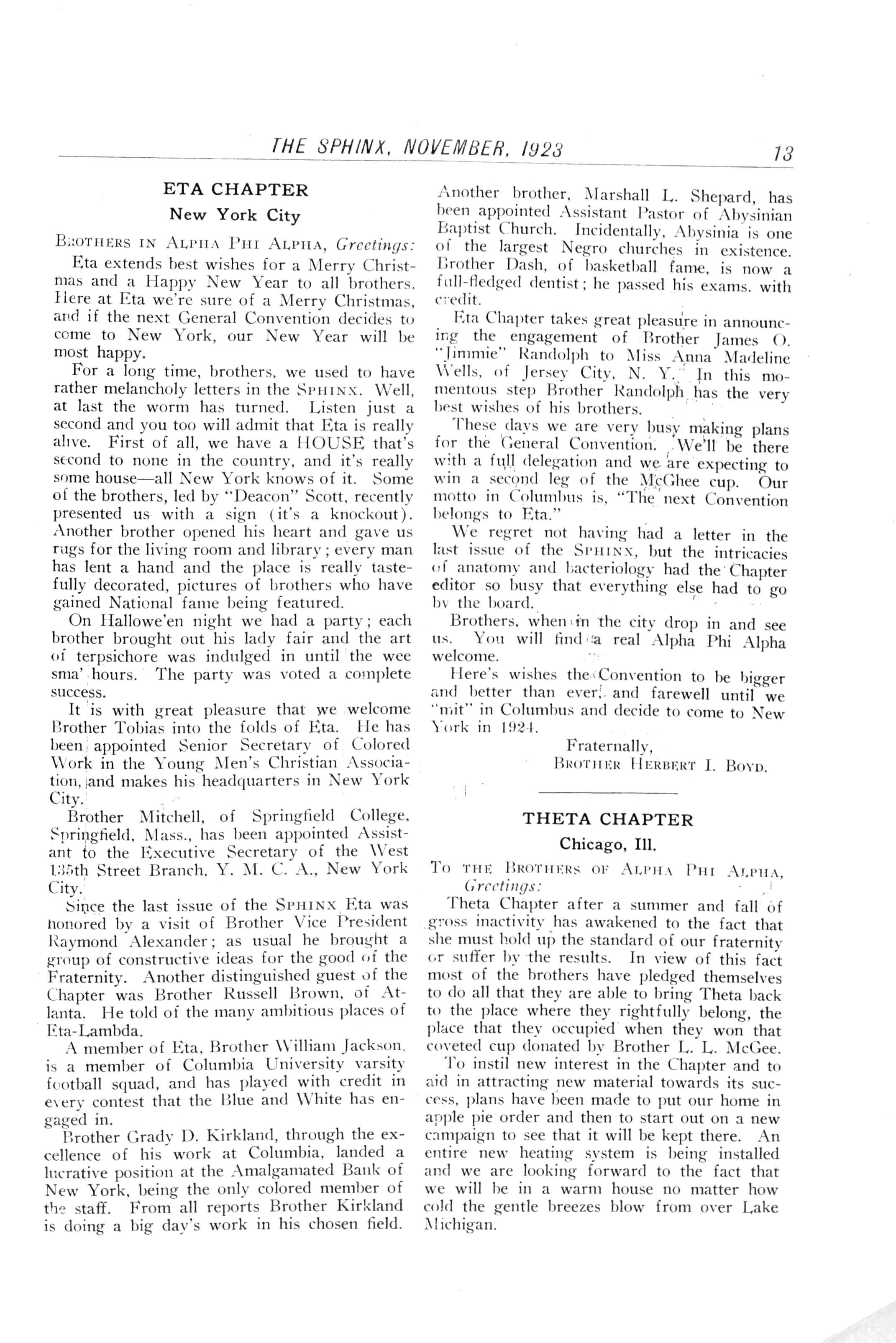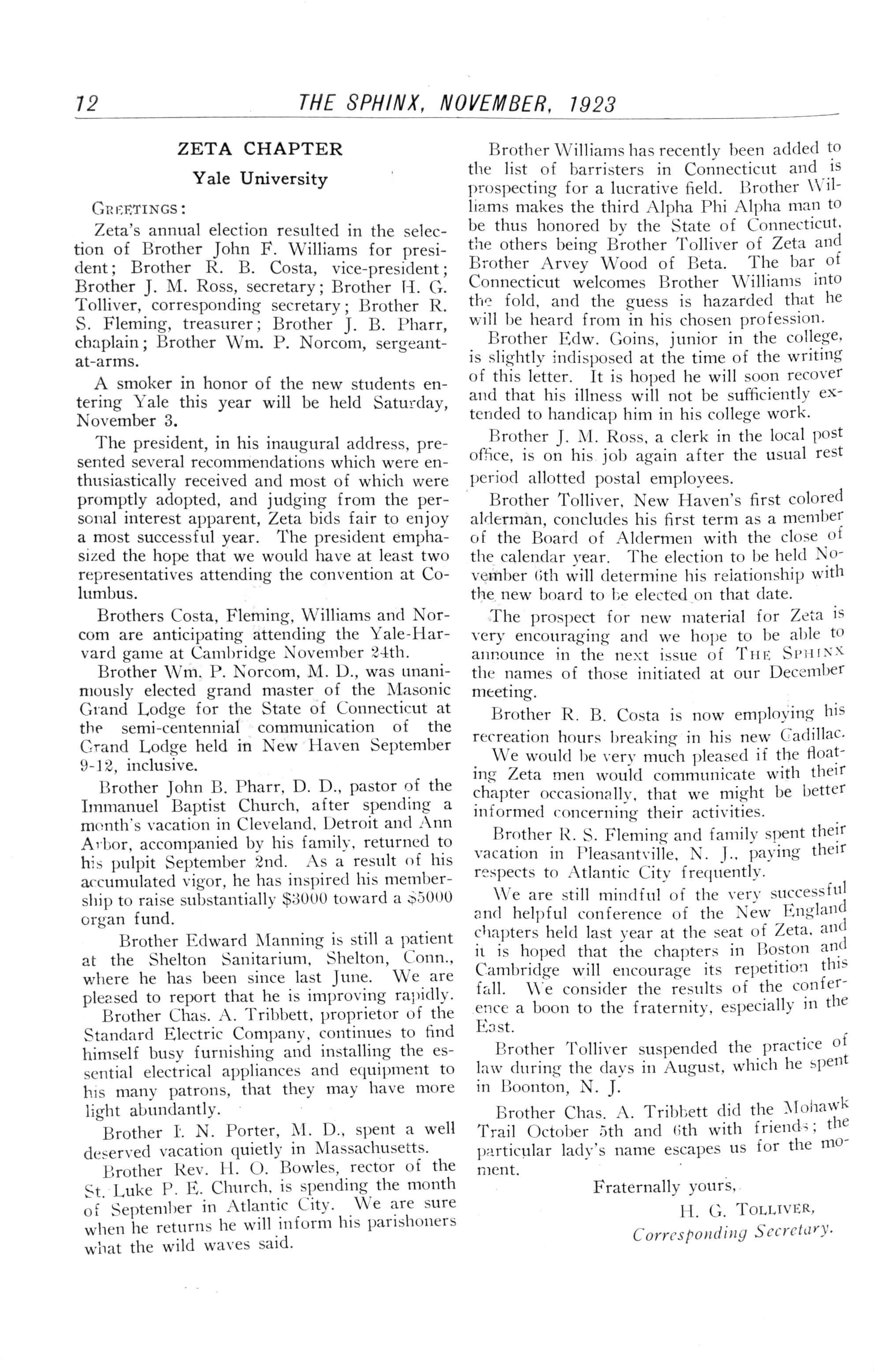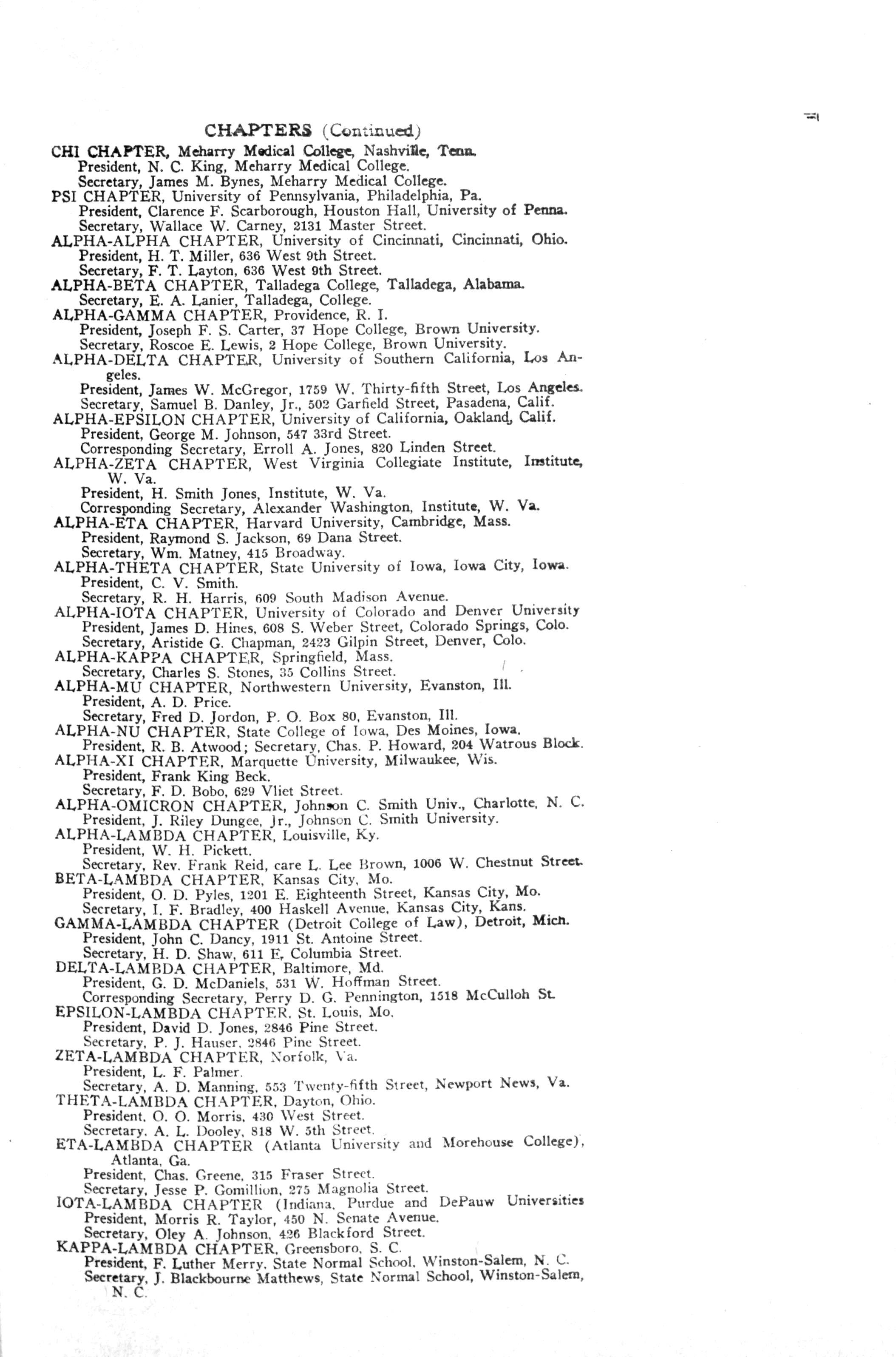 CorrespondingSecretary,ELHarris,210GlenAvenue ZETACHAPTER,YaleUniversity,NewHaven,Conn President,JFWilliams,8GordonStreet CorrespondingSecretary,R.S.Fleming,216DwightStreet ETACHAPTER,NewYorkCityCollege,ColumbiaandNewYorkUniversities,NewYorkCity President,JamesEFladger,211W139thStreet Secretary,GradyKirkland(YMCA.),181W135thStreet THETACHAPTER,UniversityofChicago,UniversityofIllinoisand NorthwesternUniversity,Chicago,111 President,WmBenson