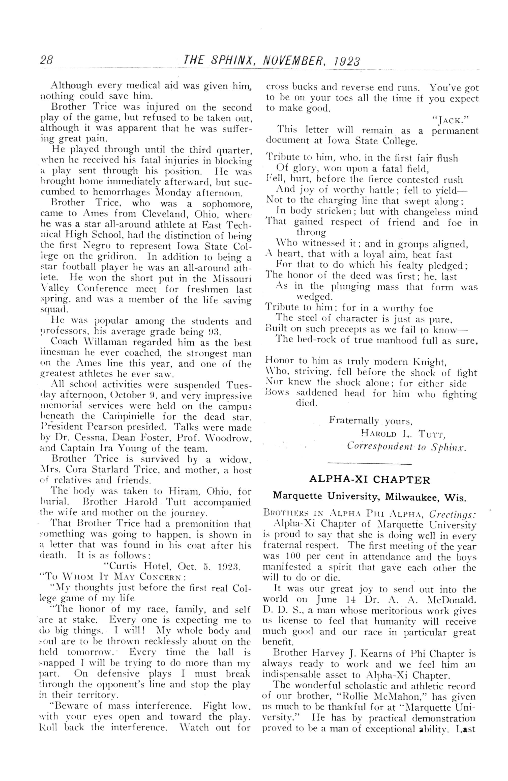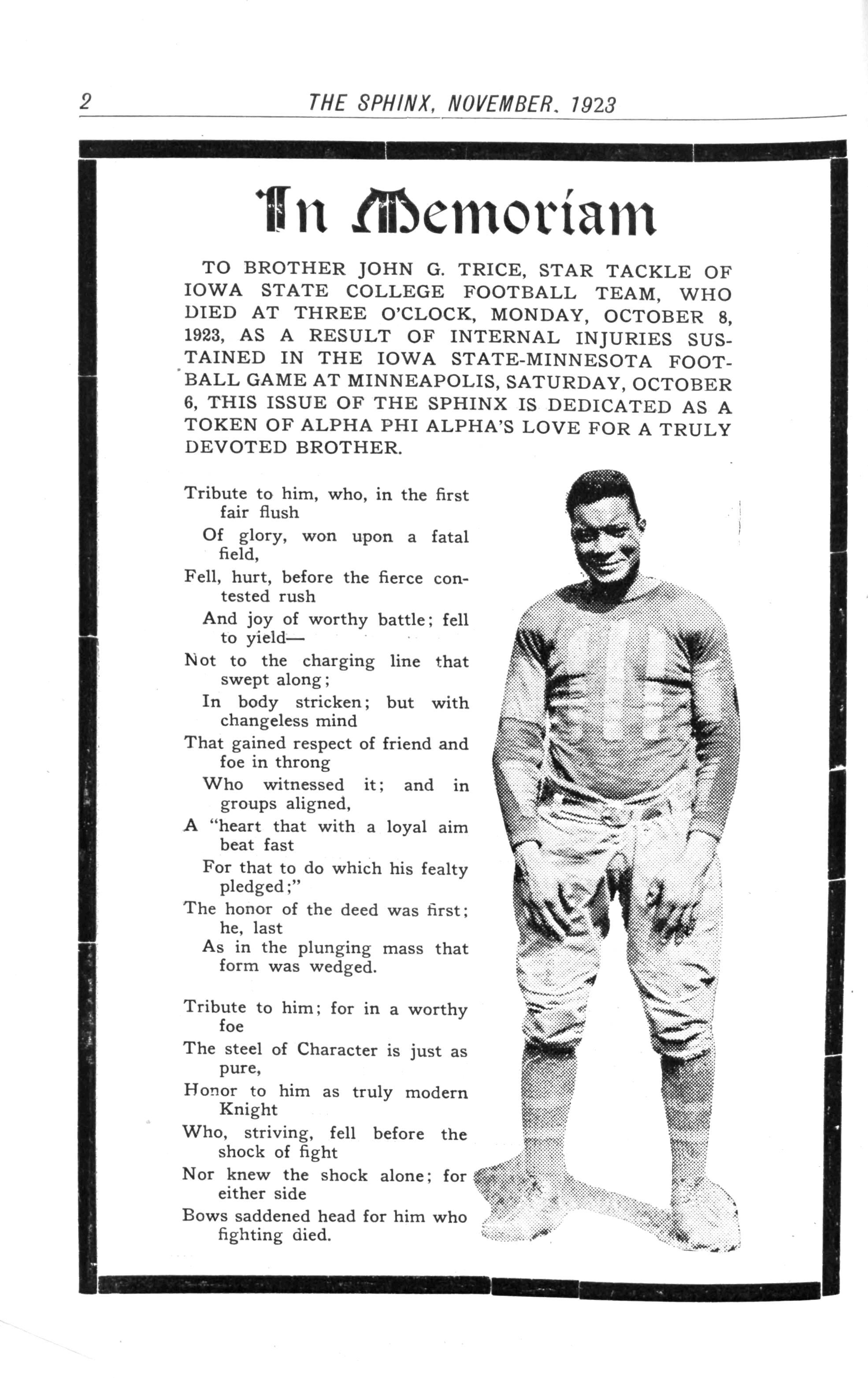 TO BROTHER JOHN G TRICE, STAR TACKLE OF IOWA STATE COLLEGE FOOTBALL TEAM, WHO DIED AT THREE O'CLOCK, MONDAY, OCTOBER 8, 1923, AS A RESULT OF INTERNAL INJURIES SUSTAINED IN THE IOWA STATE-MINNESOTA FOOTBALL GAME AT MINNEAPOLIS, SATURDAY, OCTOBER 6, THIS ISSUE OF THE SPHINX IS DEDICATED AS A TOKEN OF ALPHA PHI ALPHA'S LOVE FOR A TRULY DEVOTED BROTHER
