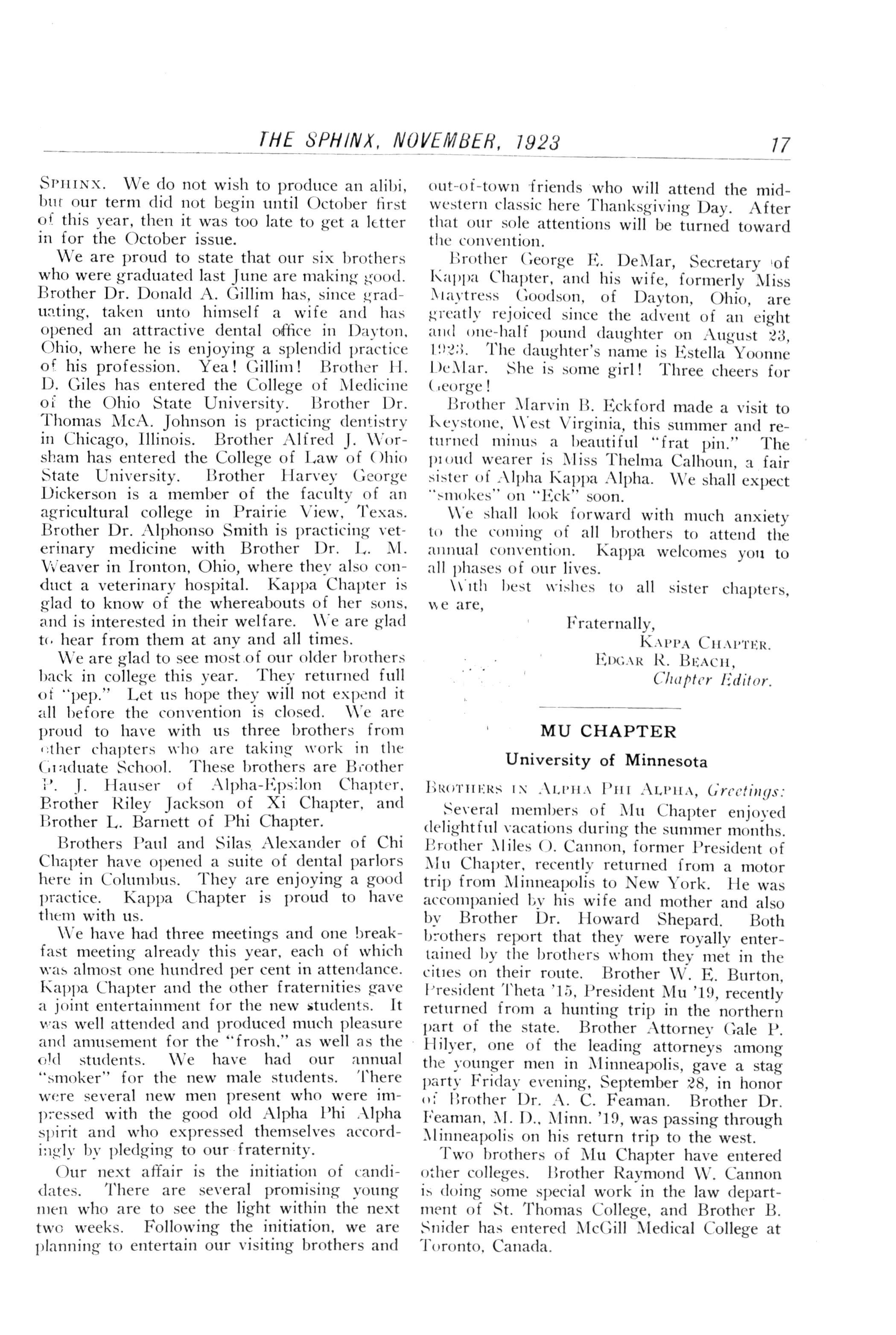Miss Estella Yoonne DeMar, beautiful and vigorous, weighing eight and one-half pounds, greeted Brother George E DeMar, secretary of Kappa Chapter, and his wife, formerly Miss Maytress Goodson of Dayton, Ohio, on the 23rd of August. All is joy with the DeMars, and you can't blame them. She is some girl and the boys that follow had better look out.