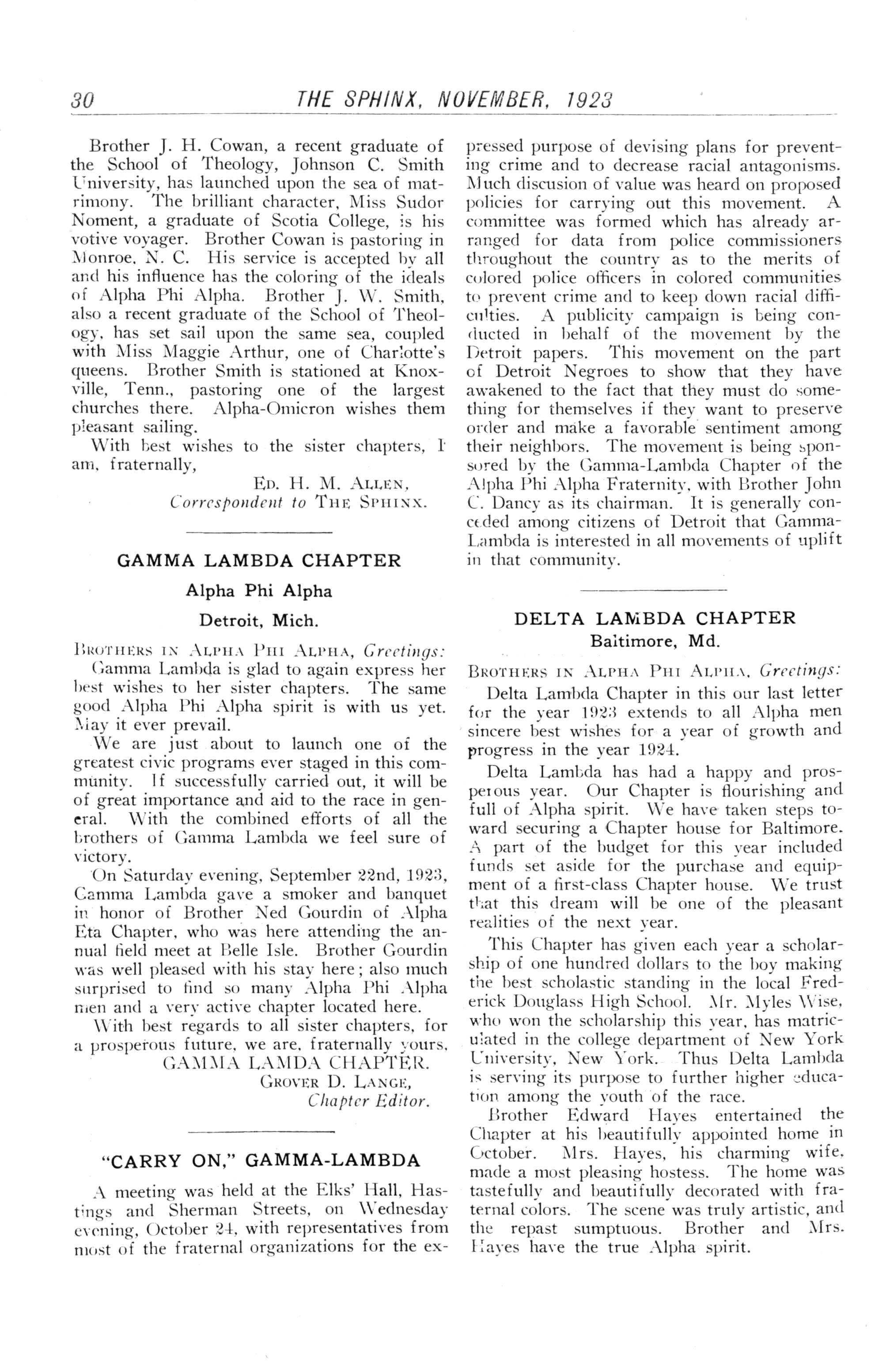GAMMA-LAMBDACHAPTER(DetroitCollegeofLaw),Detroit,Mich President,JohnCDancy,1911StAntoineStreet Secretary,H.D.Shaw,611F,ColumbiaStreet.