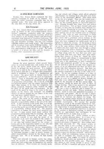 A ONE-MAN CAMPAIGN Brother Rev. Ernest Dyett conducted the Educational Campaign in Joliet all by himself. Certainly the entire fraternity commends him for his splendid work. The news item below appeared in the only daily in his city, Joliet, 111.; Aids Campaign The Rev. Ernest Dyett has concluded two weeks' work in behalf of the "Go-to-High-School, Go-toGpllege" campaign, conducted under the auspices of the Alpha Phi Alpha national fraternity, which has sixty chapters in the leading colleges and universities, extending from Harvard to Southern California. The campaign received the endorsement of President Harding and President Coolidge, and last year touched 3,000,000 children and young people. The proposition will be broadcast from station W M A Q Sunday. The Rev. Ernest Dyett has introduced the campaign before approximately 6,000 people in Joliet. H e spoke in behalf of it before the Elks, and the Knights of Pythias, other organization and churches.