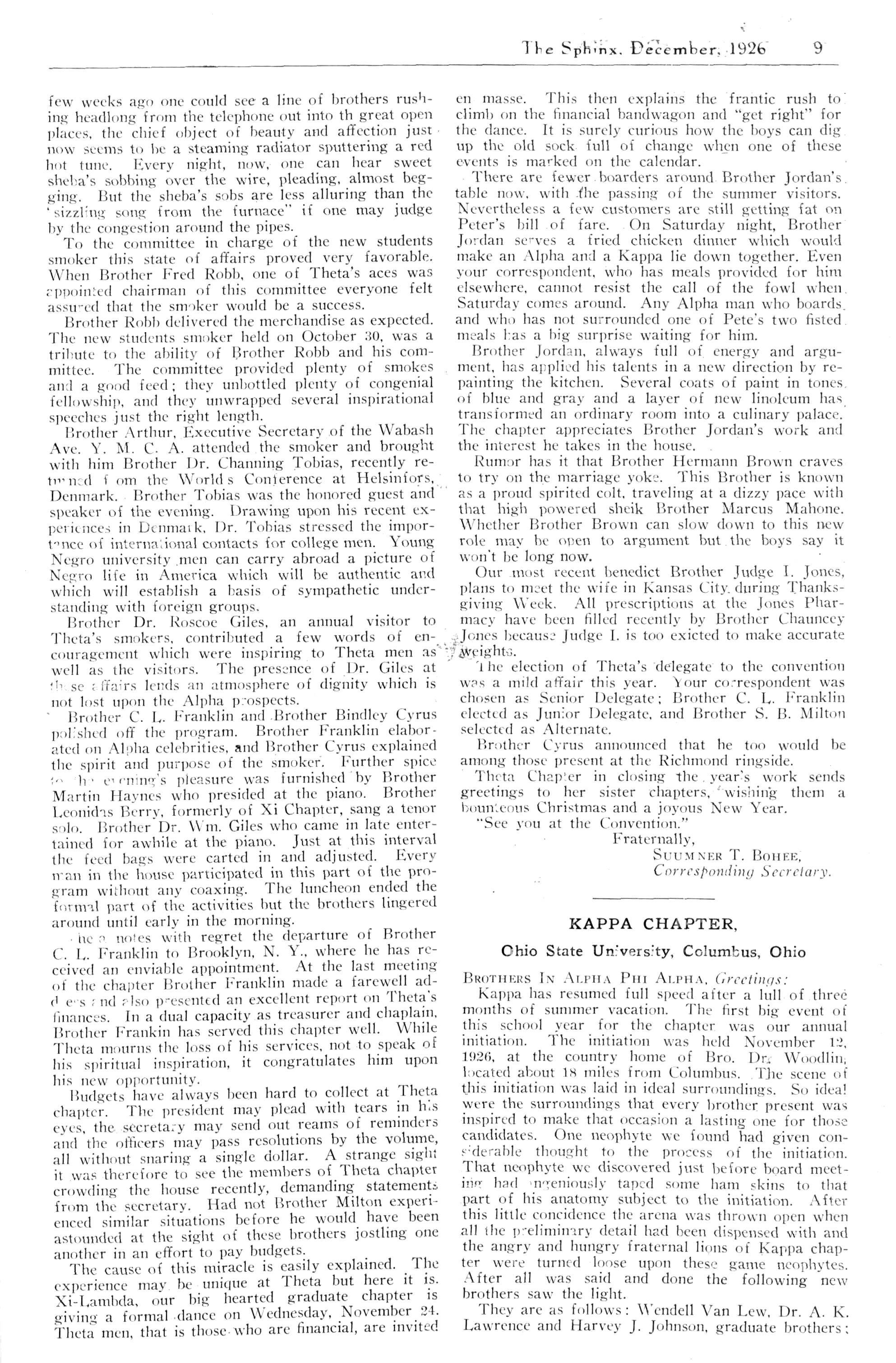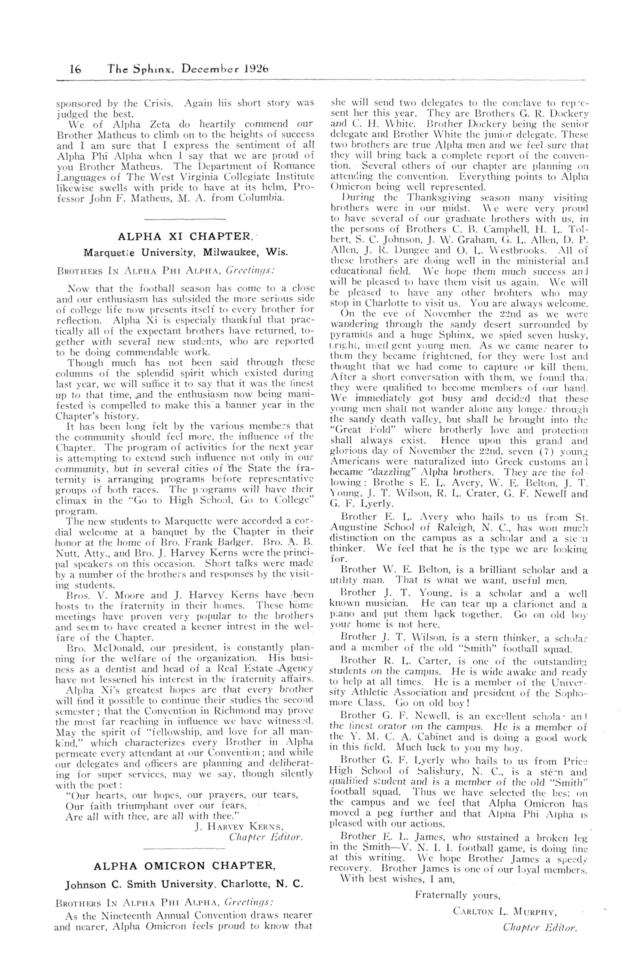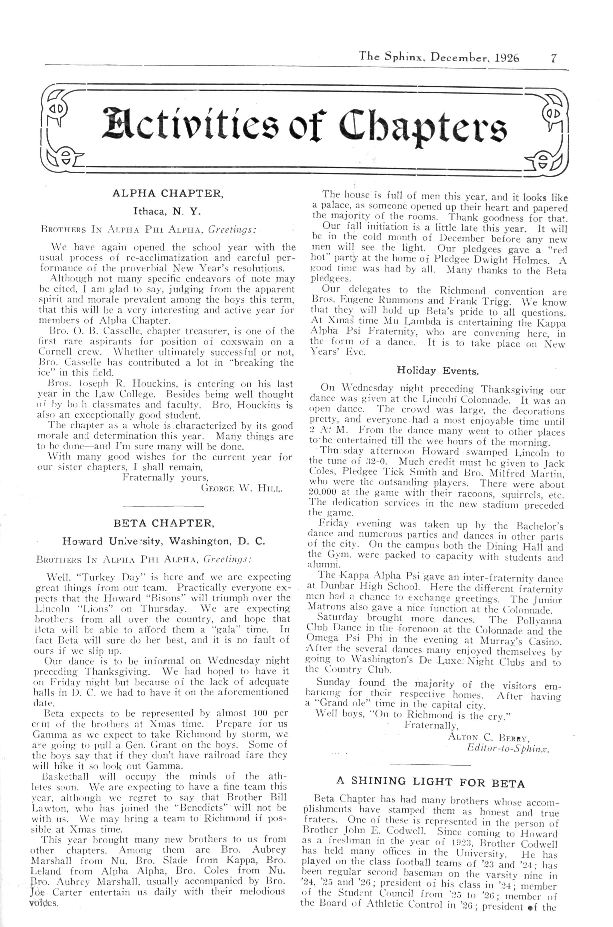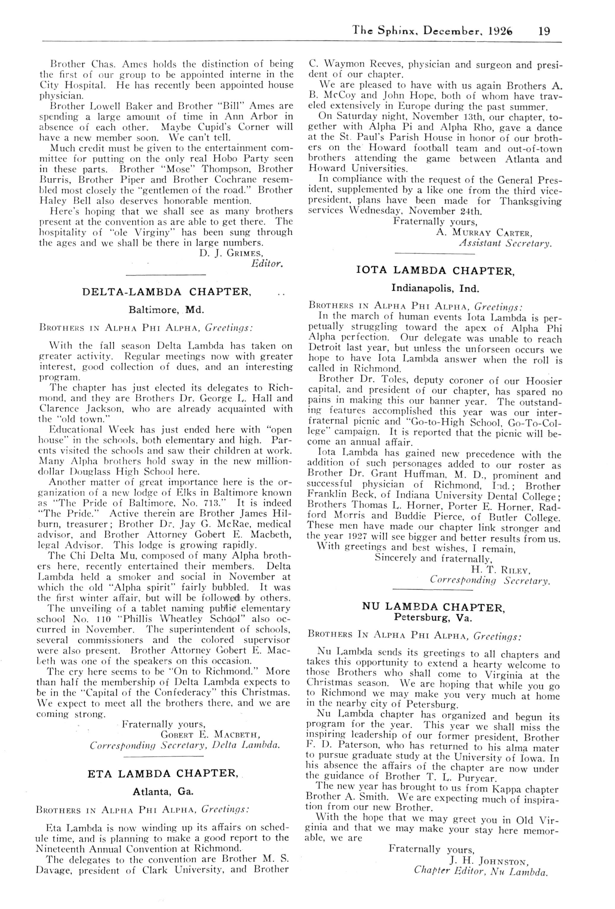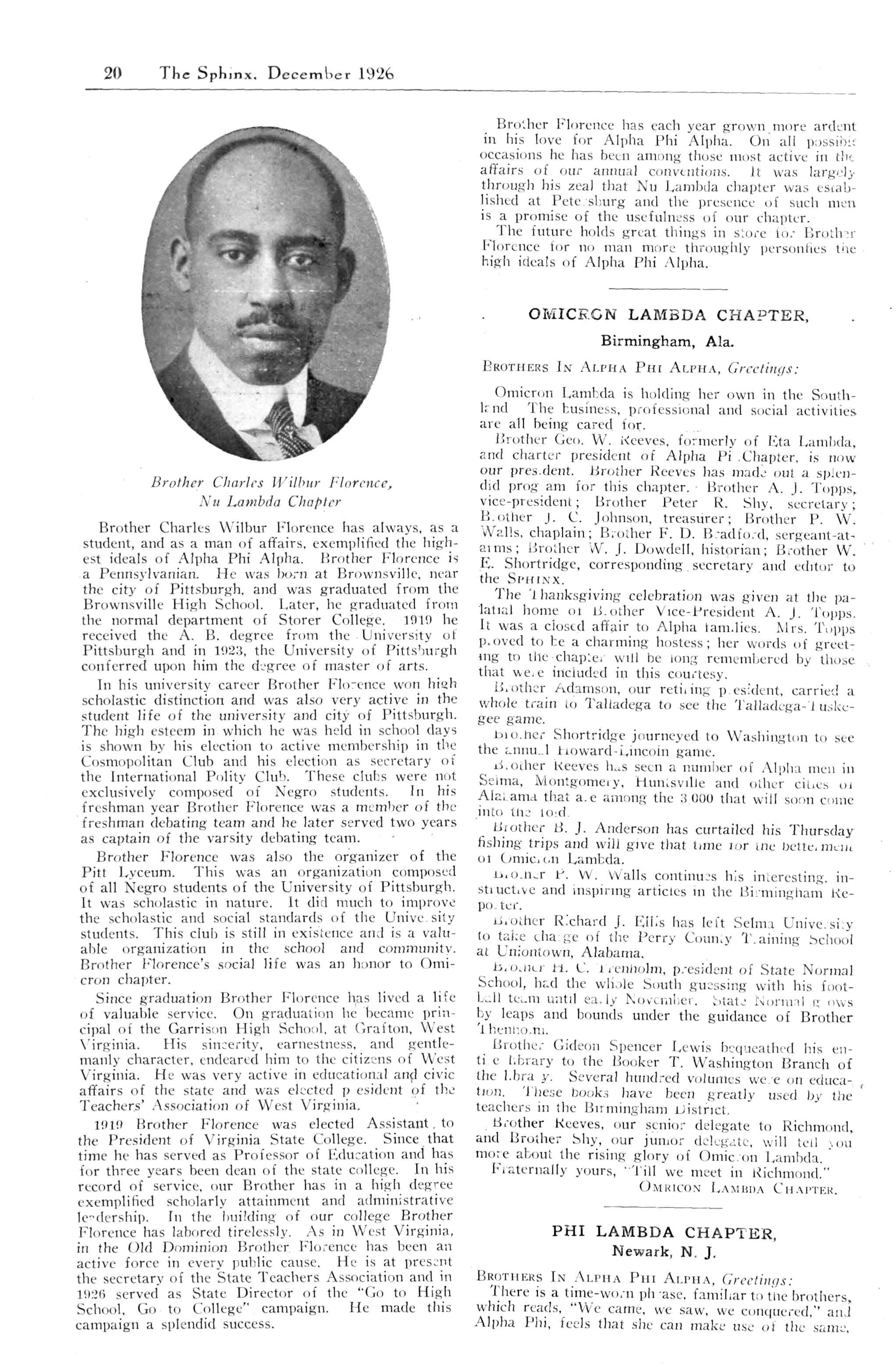 Alpha; Beta—A Shining Light for Beta, Brother John E. Cod well; Tneta; Kappa: Mu; Nu; Xi; Pi; Tau; Chi; Alpha Alpha; Alpha Epsilon; Alpha Zeta—Brother John P. Matheus; Alpha Xi; Alpha Omicron; Alpha Pi; Alpha Rho; Alpha Sigma; Alpha Upsilon; Gamma Lambda; Delta Lambda; Eta Lambda; Iota Lambda; Nu Lambda Brother Charles W Florence; Omicron Lambda; Phi Lambda; Sigma Lambda