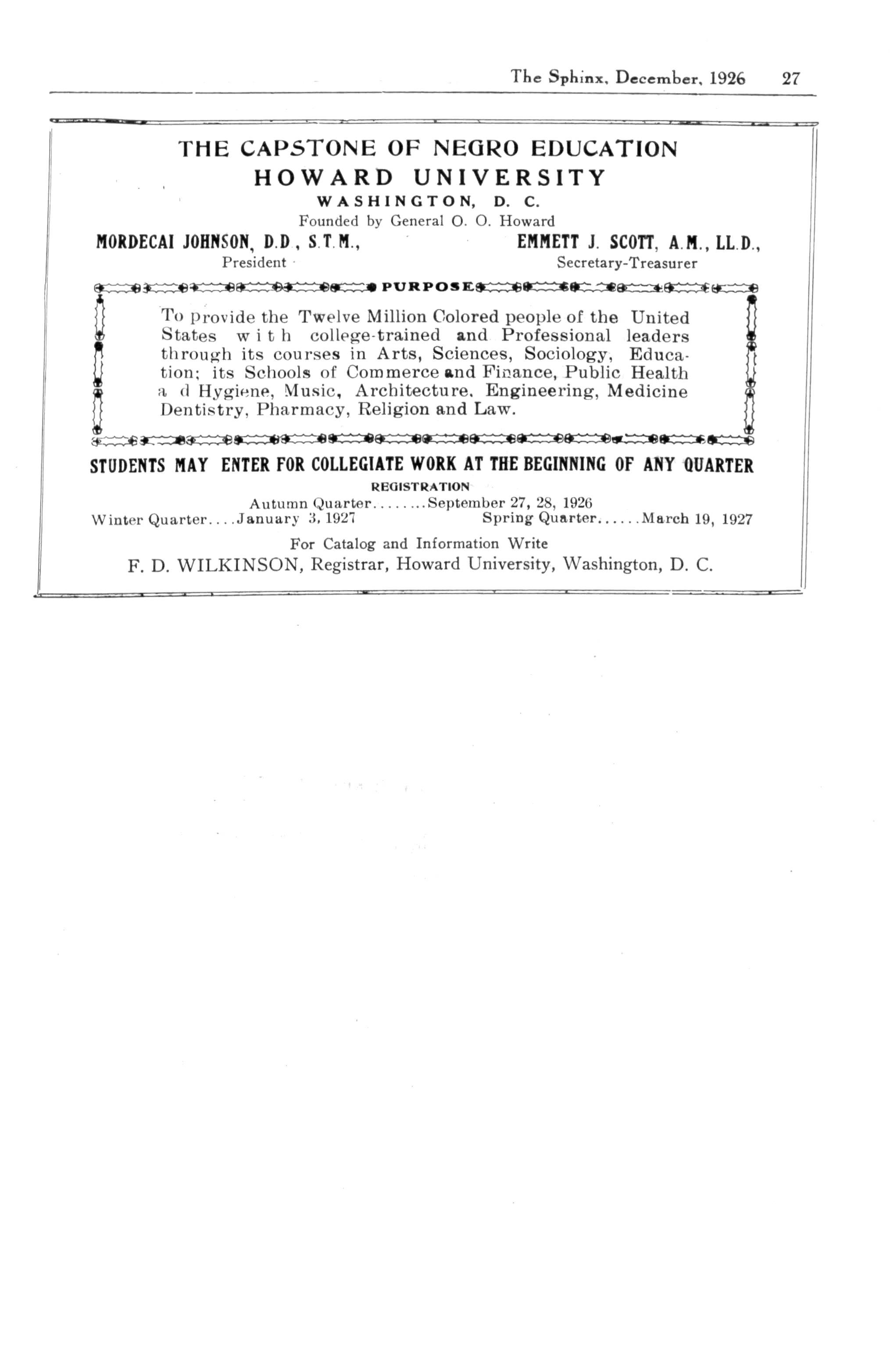 Autumn Quarter September 27, 28, 1926 Winter Quarter January X 1927 Spring Quarter March 19, 1927 For Catalog and Information Write F. D. WILKINSON, Registrar, Howard University, Washington, D. C.