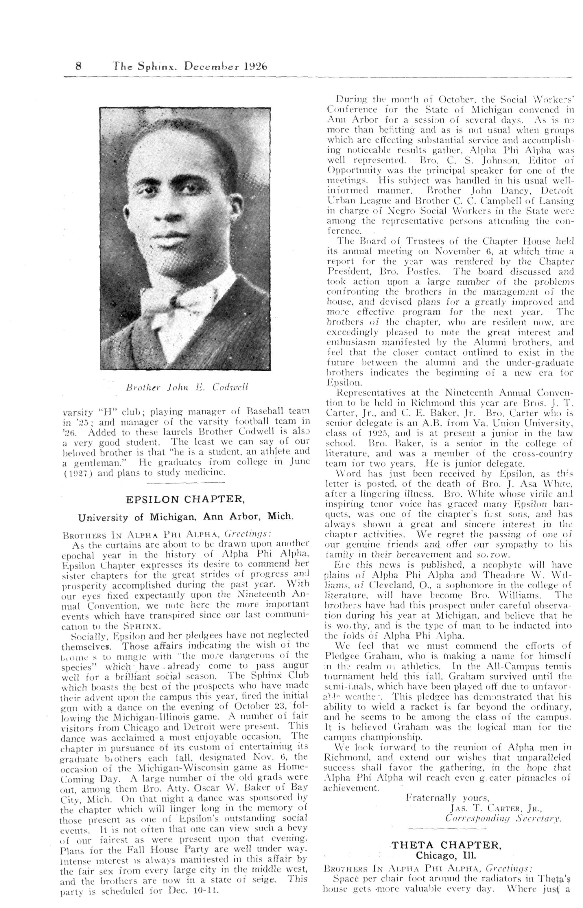 Bro. James Asa White was a member of Epsilon Chapter, and later affiliated with Gamma Lambda Time and again the sacred halls of old Epsilon have resounded with the melody of his voice, now hushed, except when accompanied by the angelic host of Heaven.