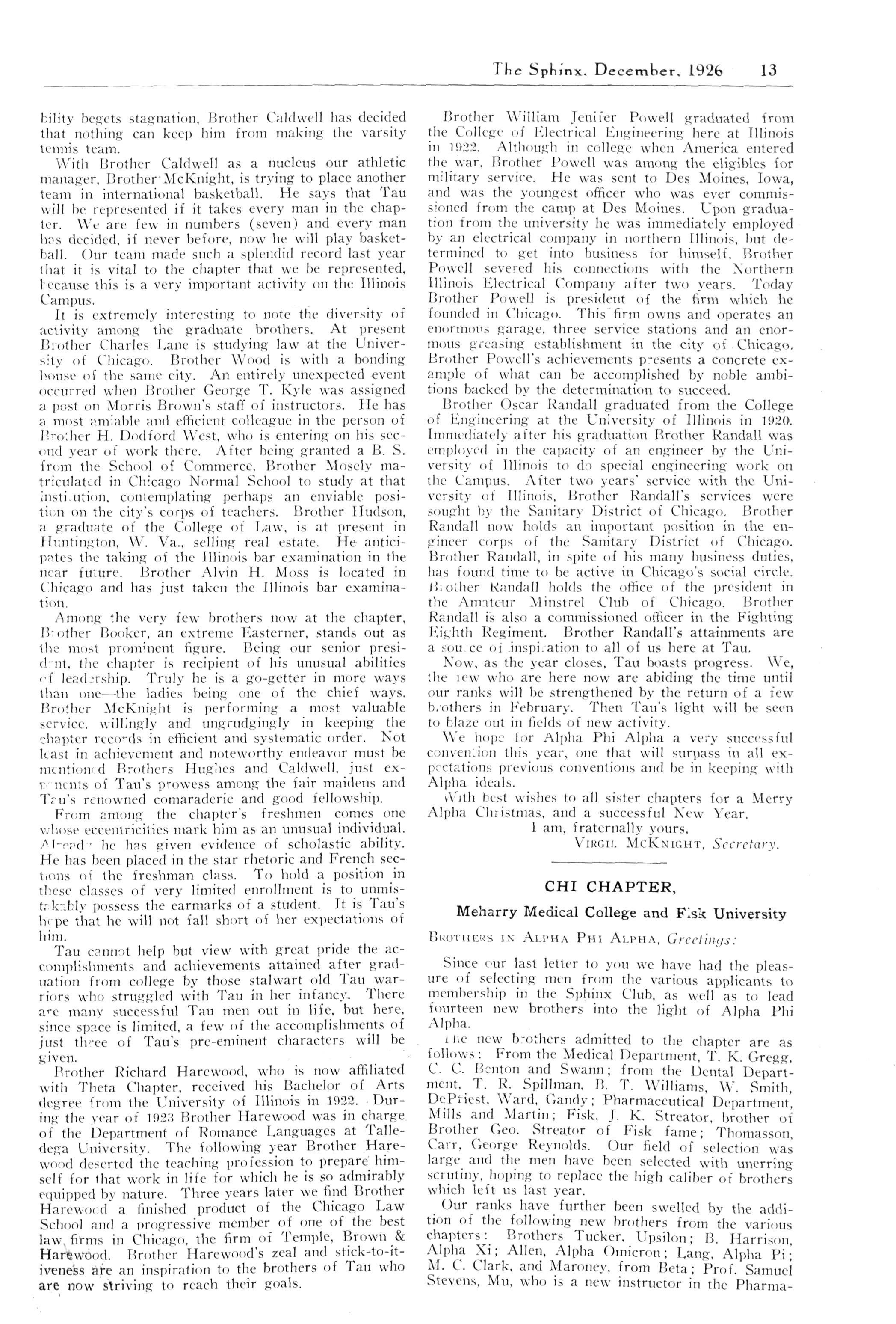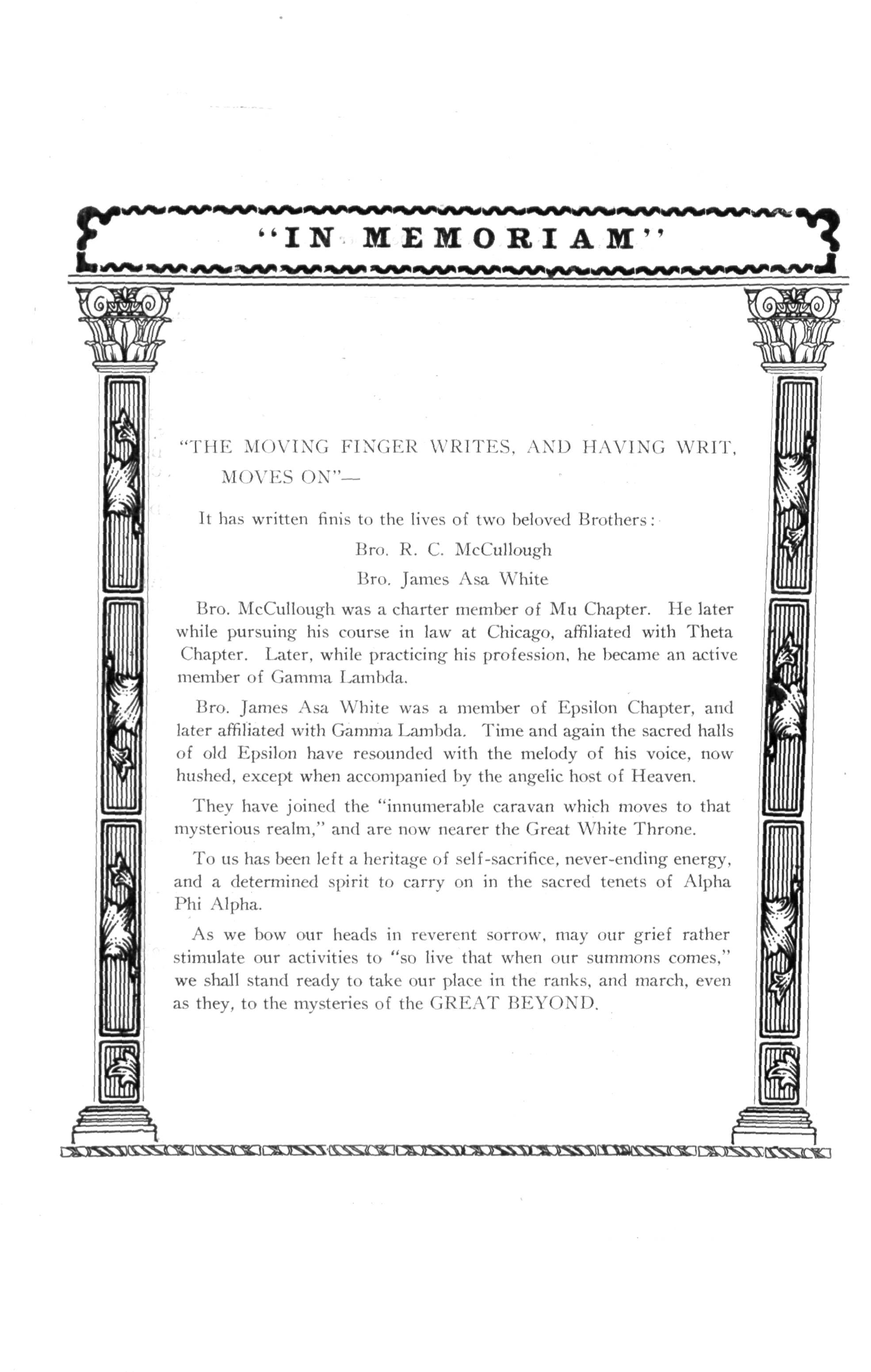 Bro. McCullough was a charter member of Mu Chapter. He later while pursuing his course in law at Chicago, affiliated with Theta Chapter Later, while practicing his profession, he became an active member of Gamma Lambda.