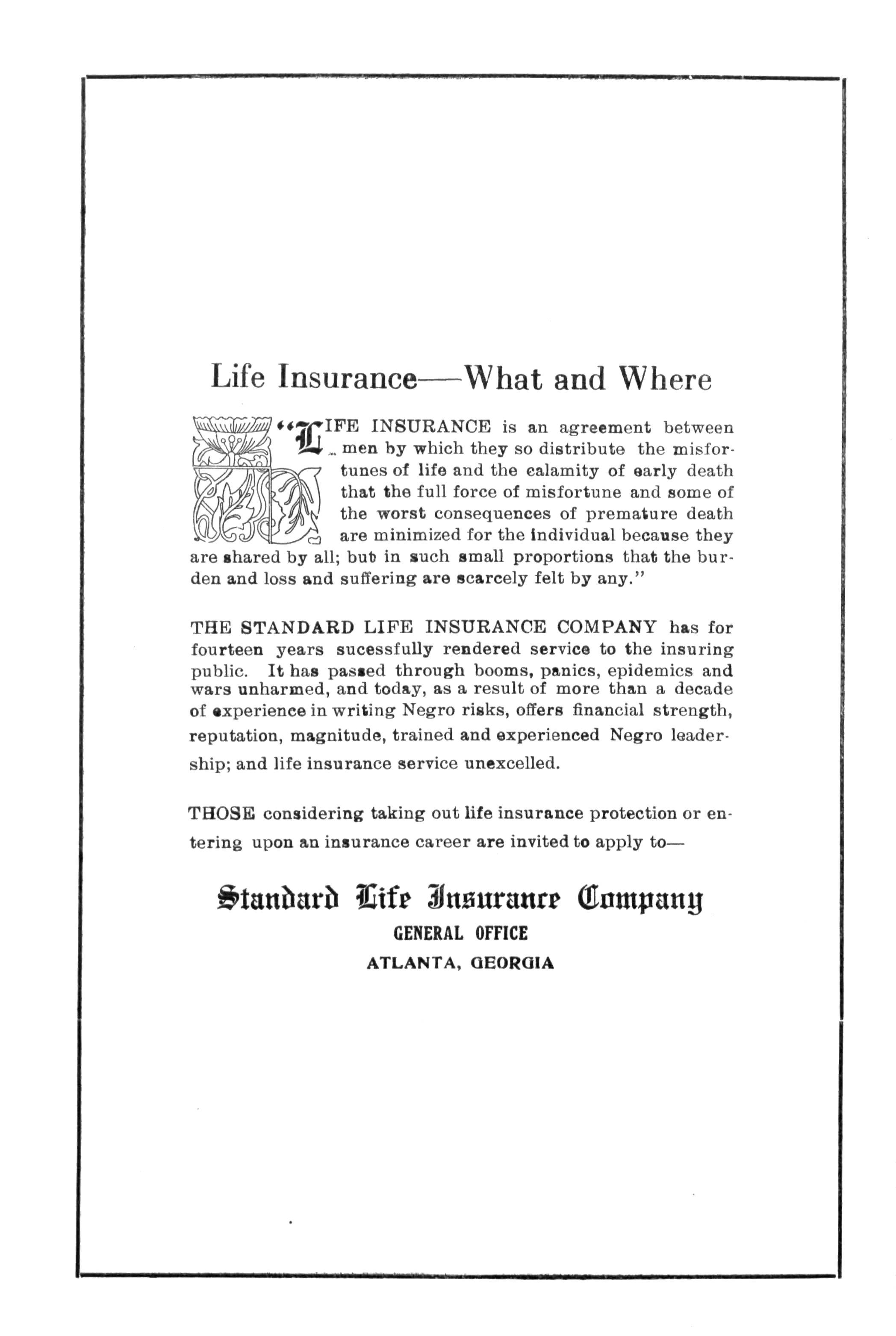 THE STANDARD LIFE INSURANCE COMPANY has for fourteen years sucessfuUy rendered service to the insuring public It has passed through booms, panics, epidemics and wars unharmed, and today, as a result of more than a decade of sxperience in writing Negro risks, offers financial strength, reputation, magnitude, trained and experienced Negro leadership; and life insurance service unexcelled.