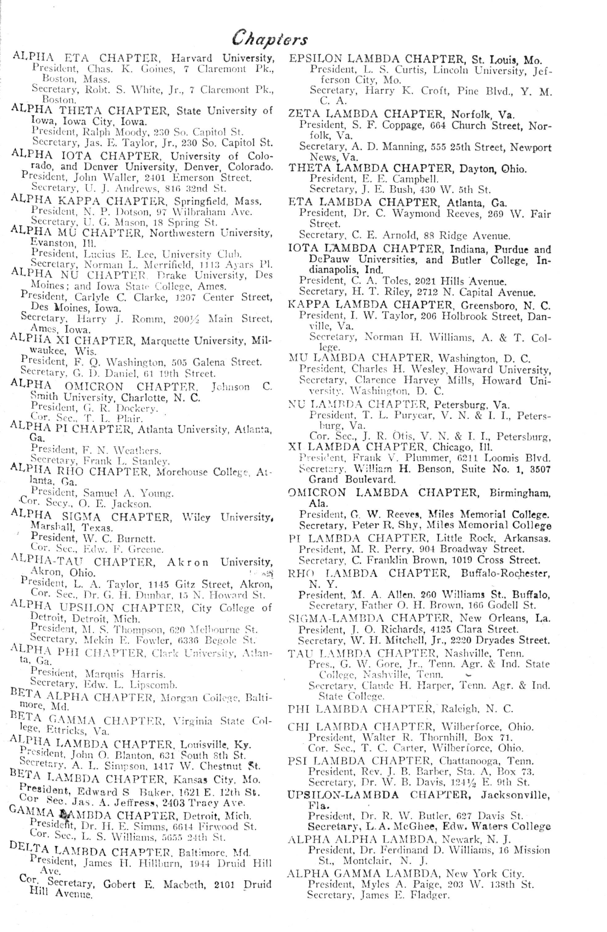President, G W Reeves, Miles Memorial College Secretary, Peter R, Shy, Miles Memorial College IT LAMBDA CHAPTER, Little Rock, Arkansas. President, M. R. Perry, 904 Broadway Street. Secretary, C Franklin Brown, 1019 Cross Street