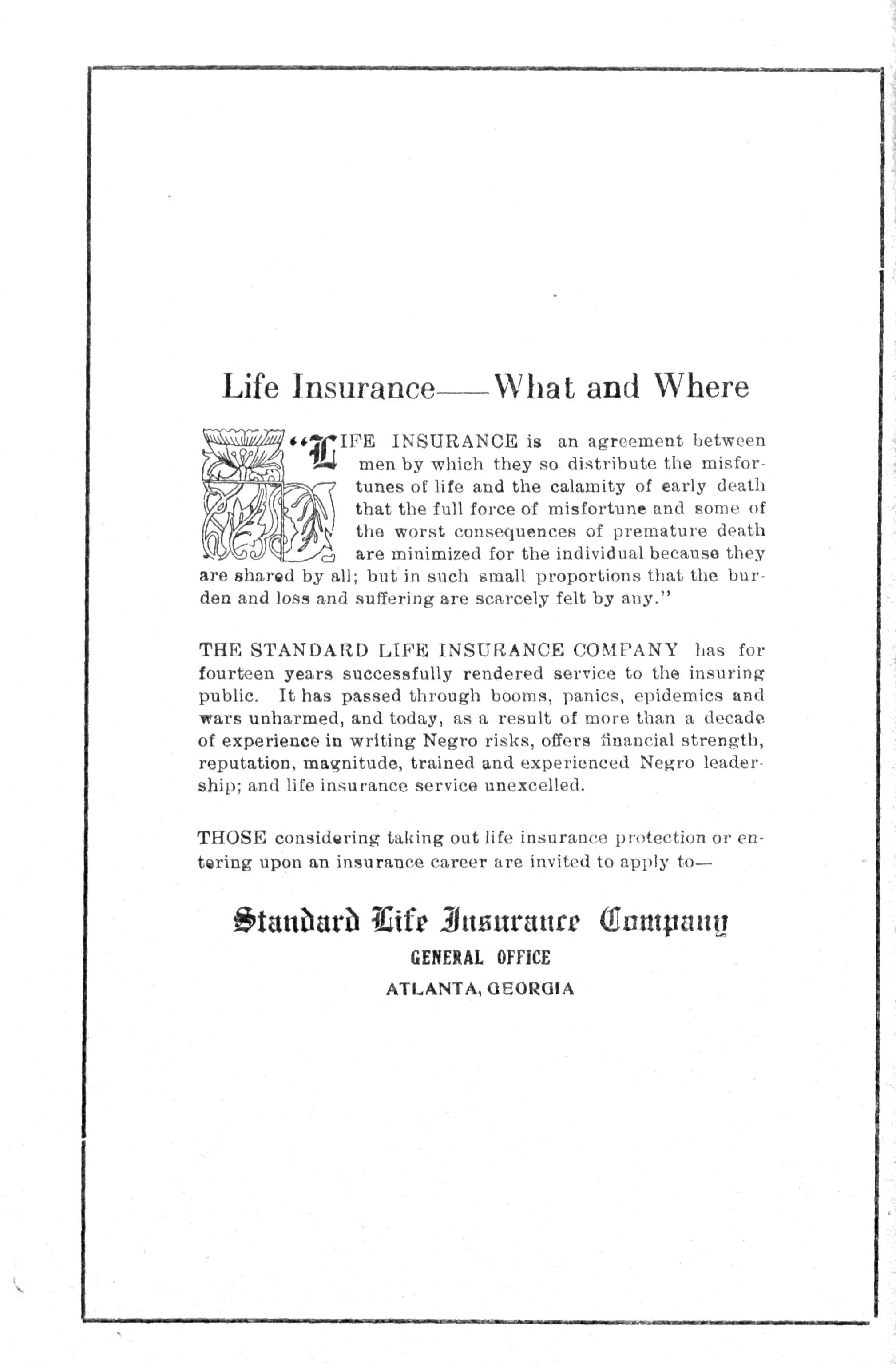 THE STANDARD LIFE INSURANCE COMPANY has for fourteen years successfully rendered service to the insuring public It has passed through booms, panics, epidemics and wars unharmed, and today, as a result of more than a decade of experience in writing Negro risks, offers financial strength, reputation, magnitude, trained and experienced Negro leadership; and life insurance service unexcelled.