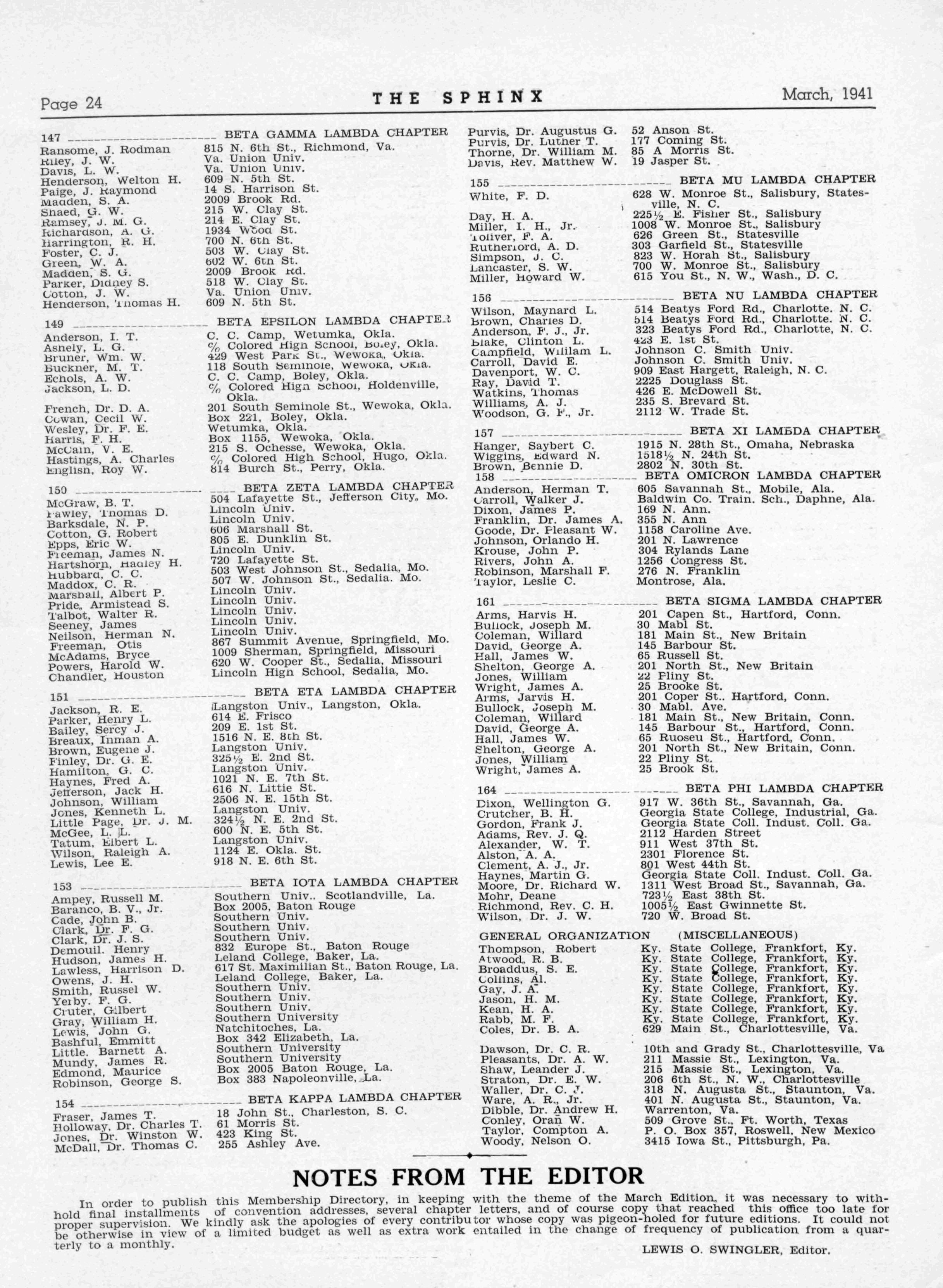 Editor's Notes-This list of names does not include the total membership of men initiated into Alpha Phi Alpha Pn^™^ nor of men active inthe promotion of the organization's program It represents the names and addresses of members a.vailabit to the editor at press time Such a Directory, in a more complete form, will serve as a guide by which fraternity memoers can bebrought in closer touch with each other