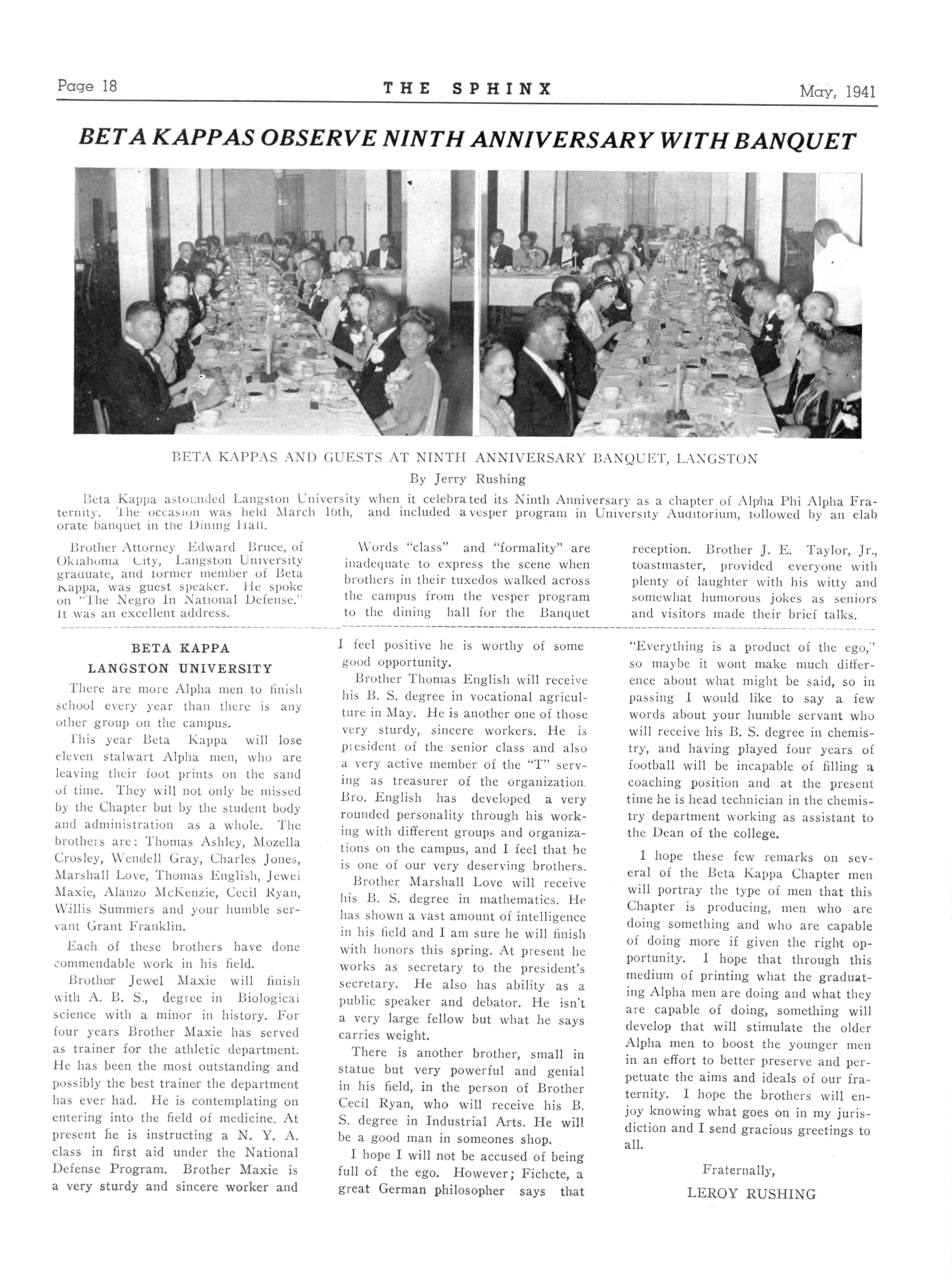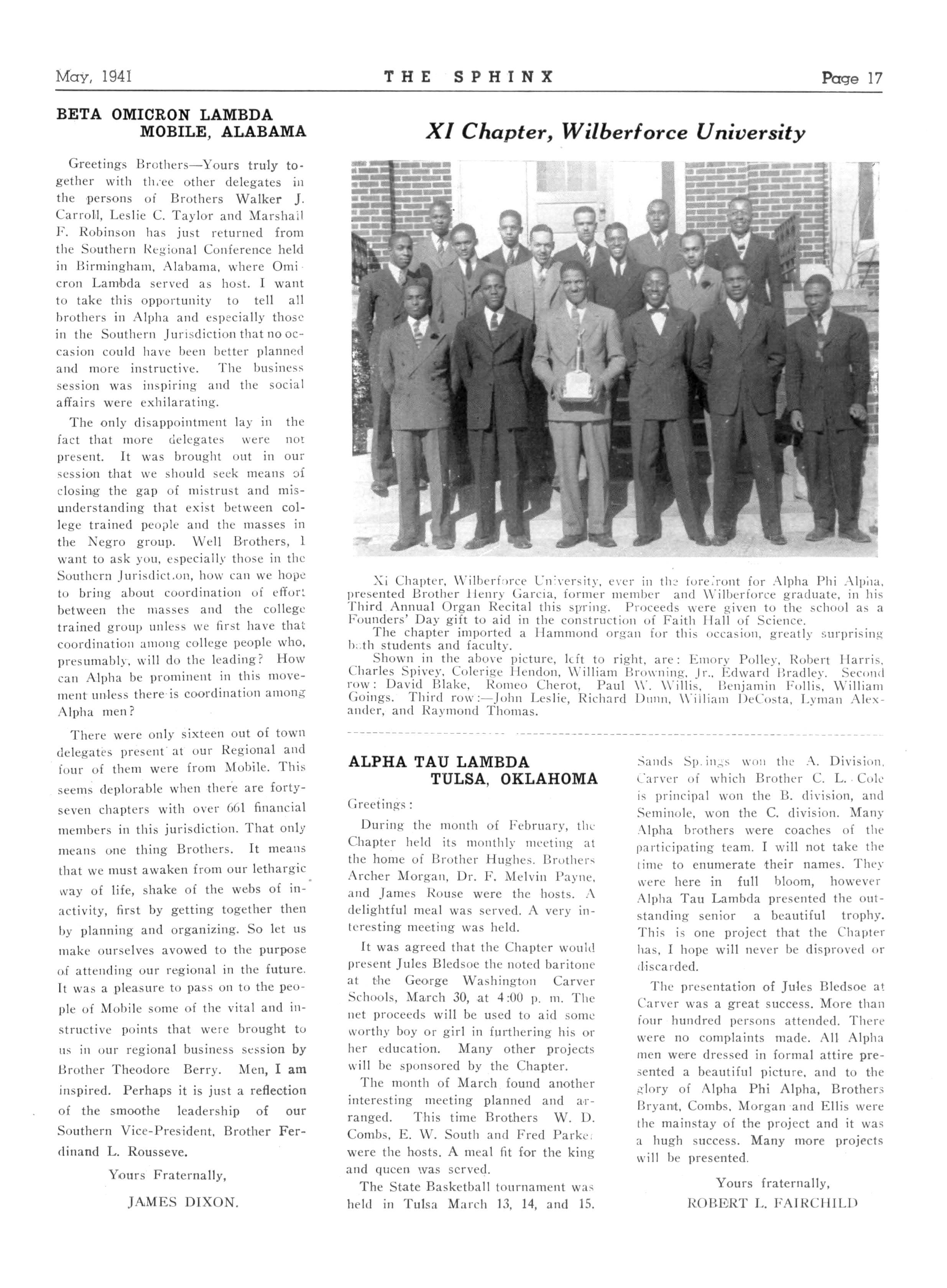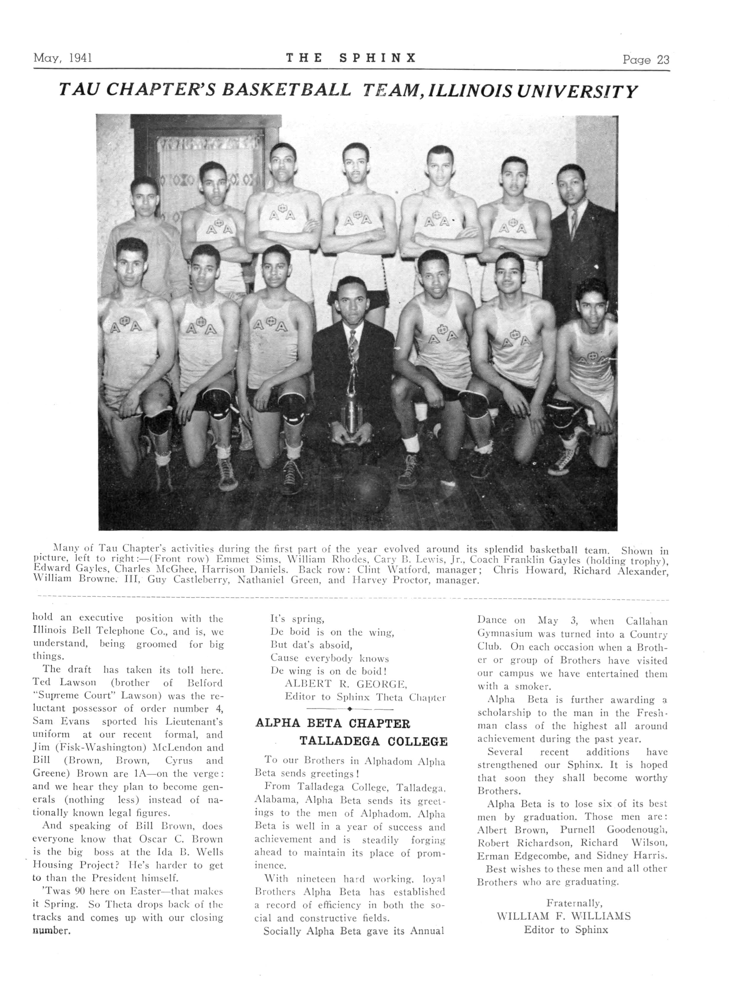 From Talladega College, Talladega Alabama, Alpha Beta sends its greetings to the men of Alpliadom Alpha Beta is well in a year of success and achievement and is steadily forging ahead to maintain its place of prominence