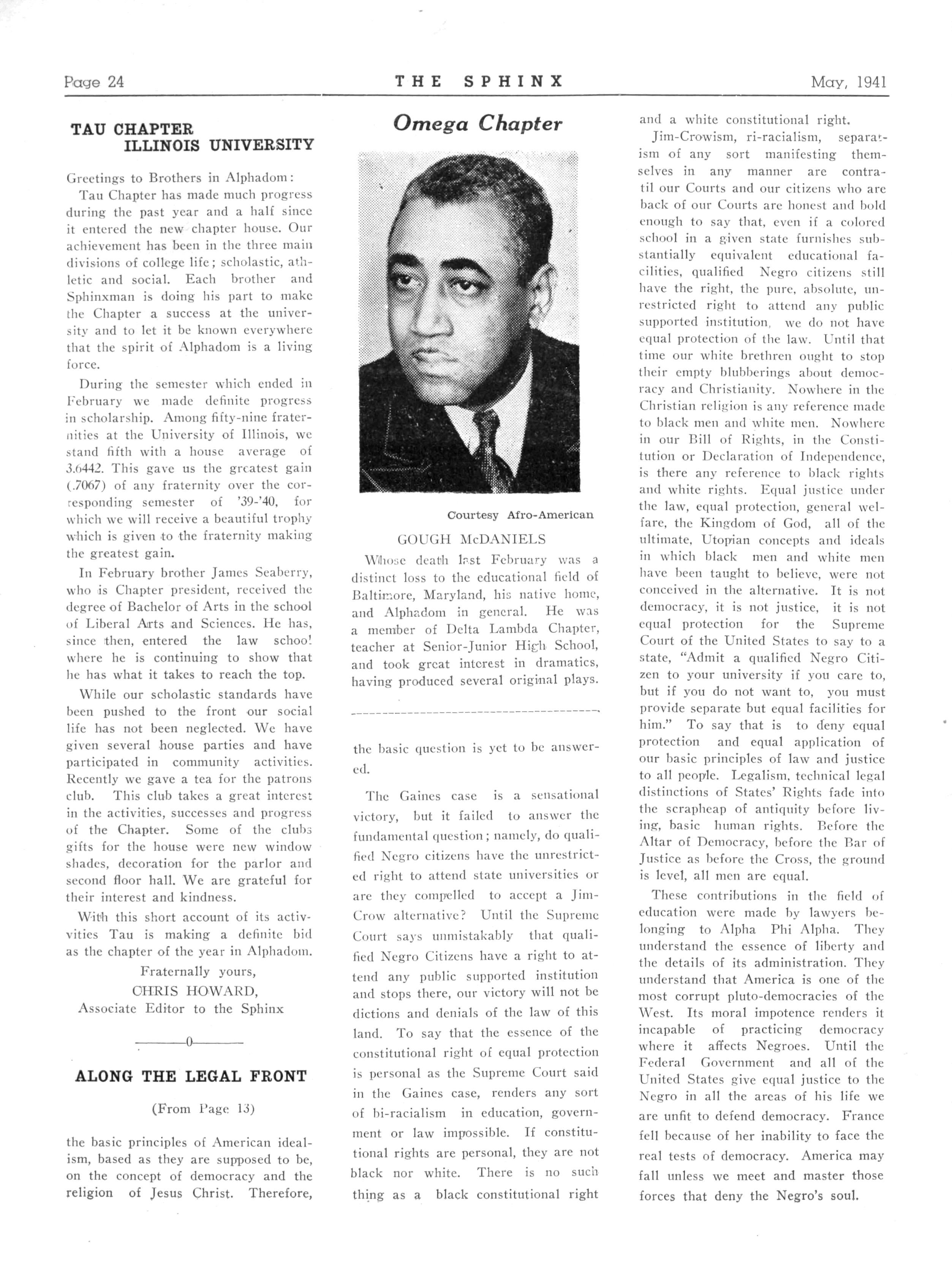 These contributions in the field of education were made by lawyers belonging to Alpha Phi Alpha They understand the essence of liberty and the details of its administration They understand that America is one of the most corrupt pluto-democracies of the West Its moral impotence renders it incapable of practicing democracy where it affects Negroes Until the Federal Government and all of the United States give equal justice to the Negro in all the areas of his life we are unfit todefend democracy France fell because of her inability to face the real tests of democracy America may fall unless we meet and master those forces that deny the Negro's soul