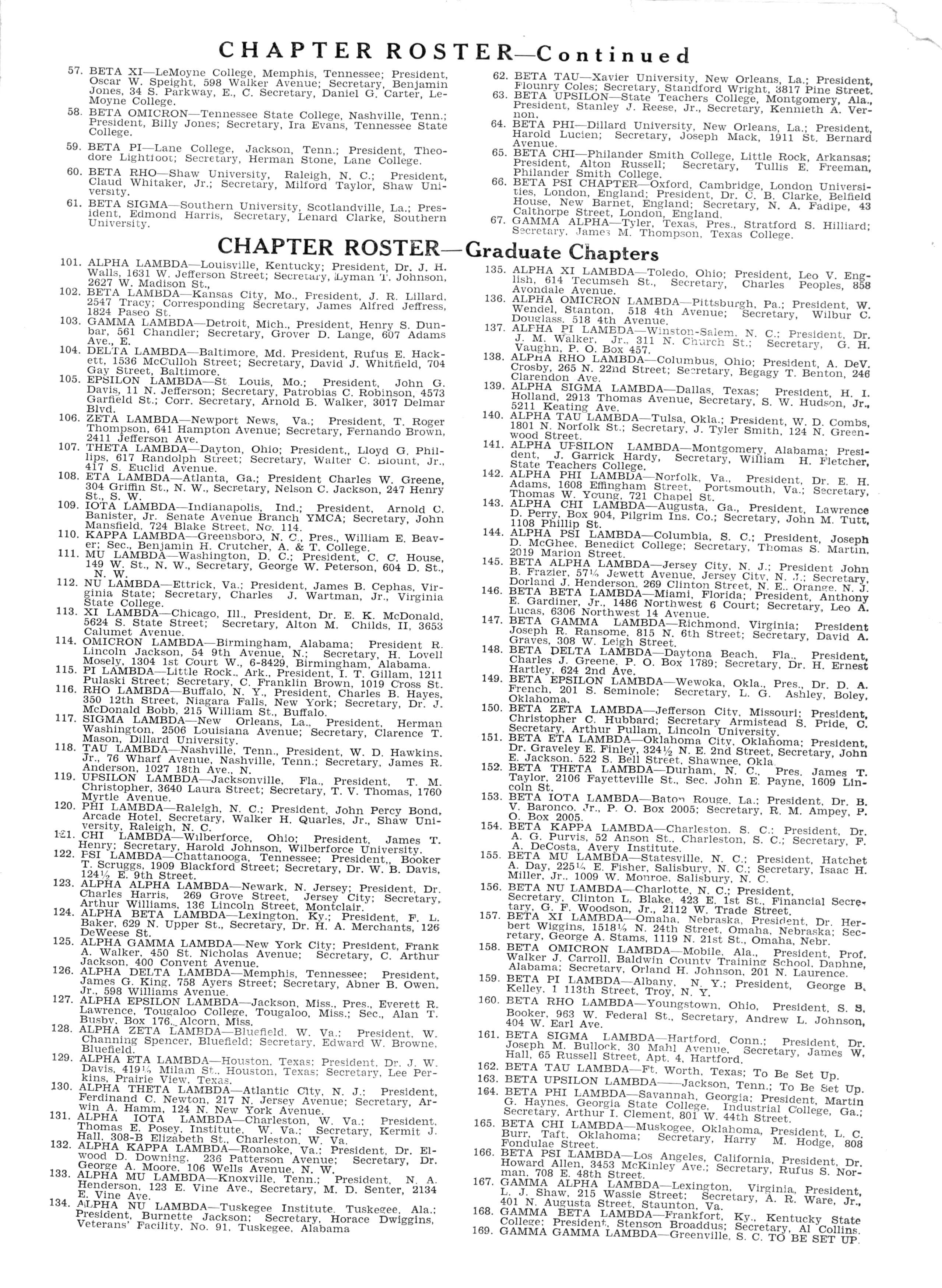 57 BETA XI—LeMoyne College, Memphis, Tennessee; President Oscar W Speight, 598 Walker Avenue; Secretary, Benjamin Jones, 34 S Parkway, E., C Secretary, Daniel G Carter, LeMoyne College