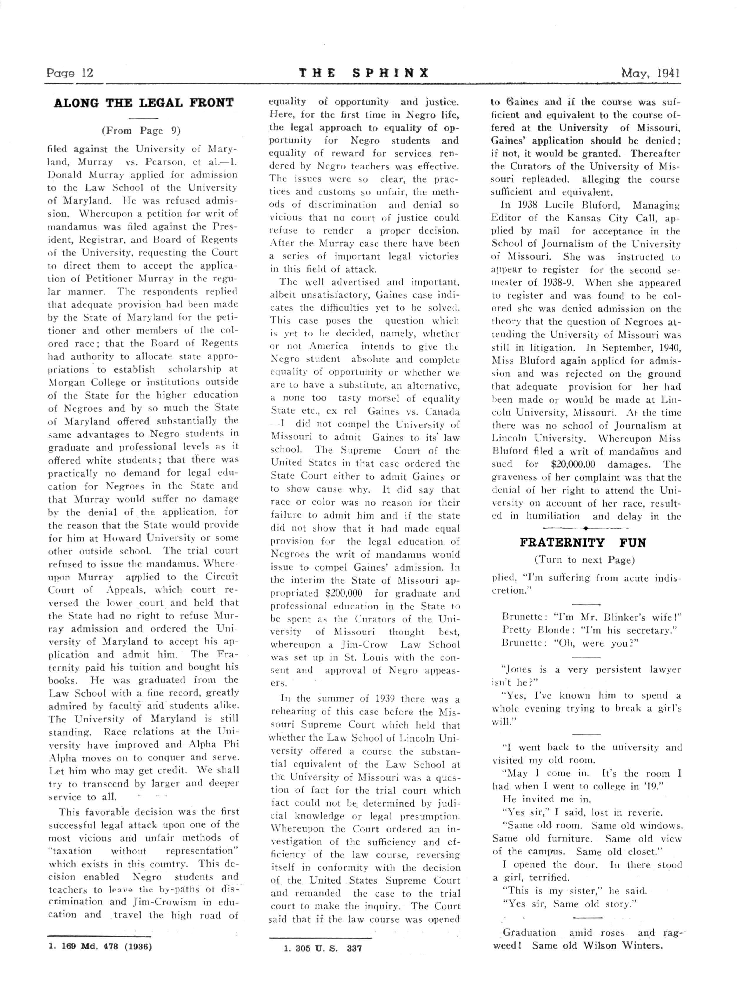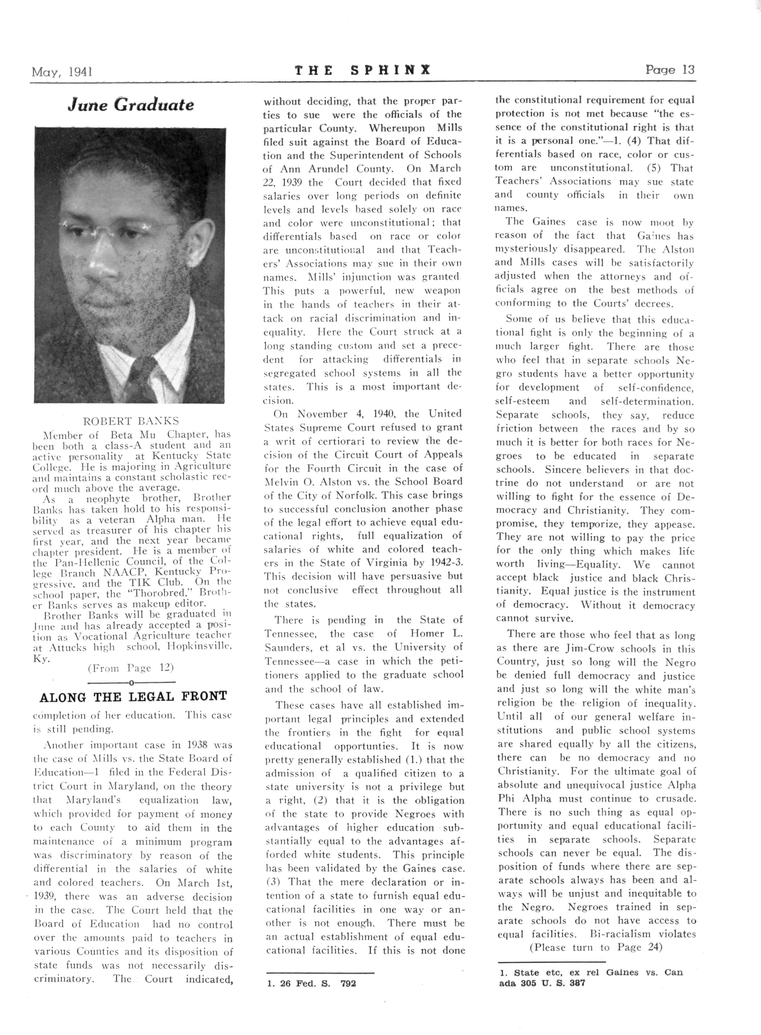 The Gaines case is a sensational victory, but it failed to answer the fundamental question;namely,doqualified Negro citizens have the unrestricted right to attend state universities or are they compelled to accept a JimCrow alternative? Until the Supreme Court says unmistakably that qualified Negro Citizens have a right to attend any public supported institution and stops there,our victorywillnot be dictions and denials of the law of this land To say that the essence of the constitutional right of equal protection is personal as the Supreme Court said in the Gaines case, renders any sort of hi-racialism in education, government or law impossible If constitutional rights are personal, they are not black nor white There is no such thing as a black constitutional right