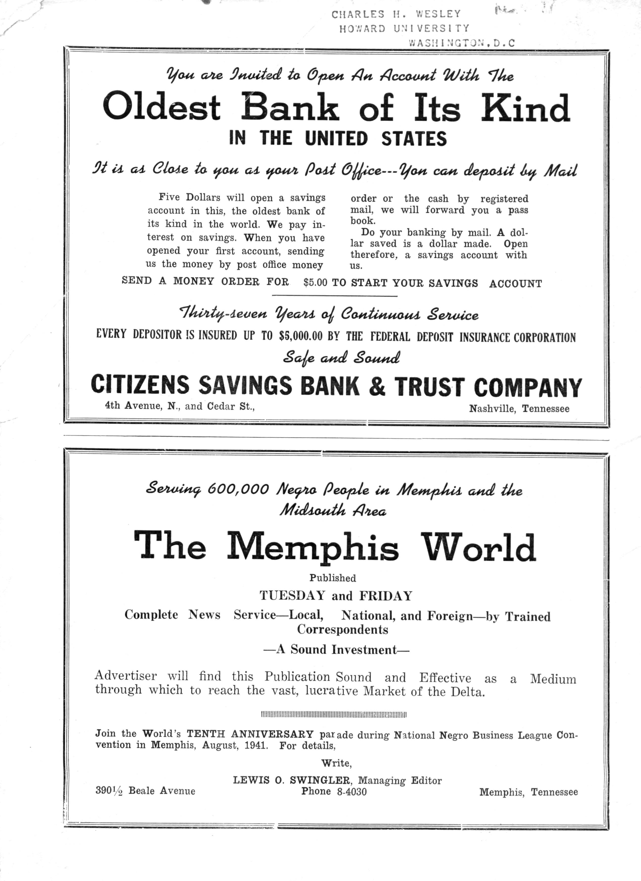 Join the World's TENTH ANNIVERSARY parade during National Negro Business League Convention in Memphis, August, 1941 For details, Write,