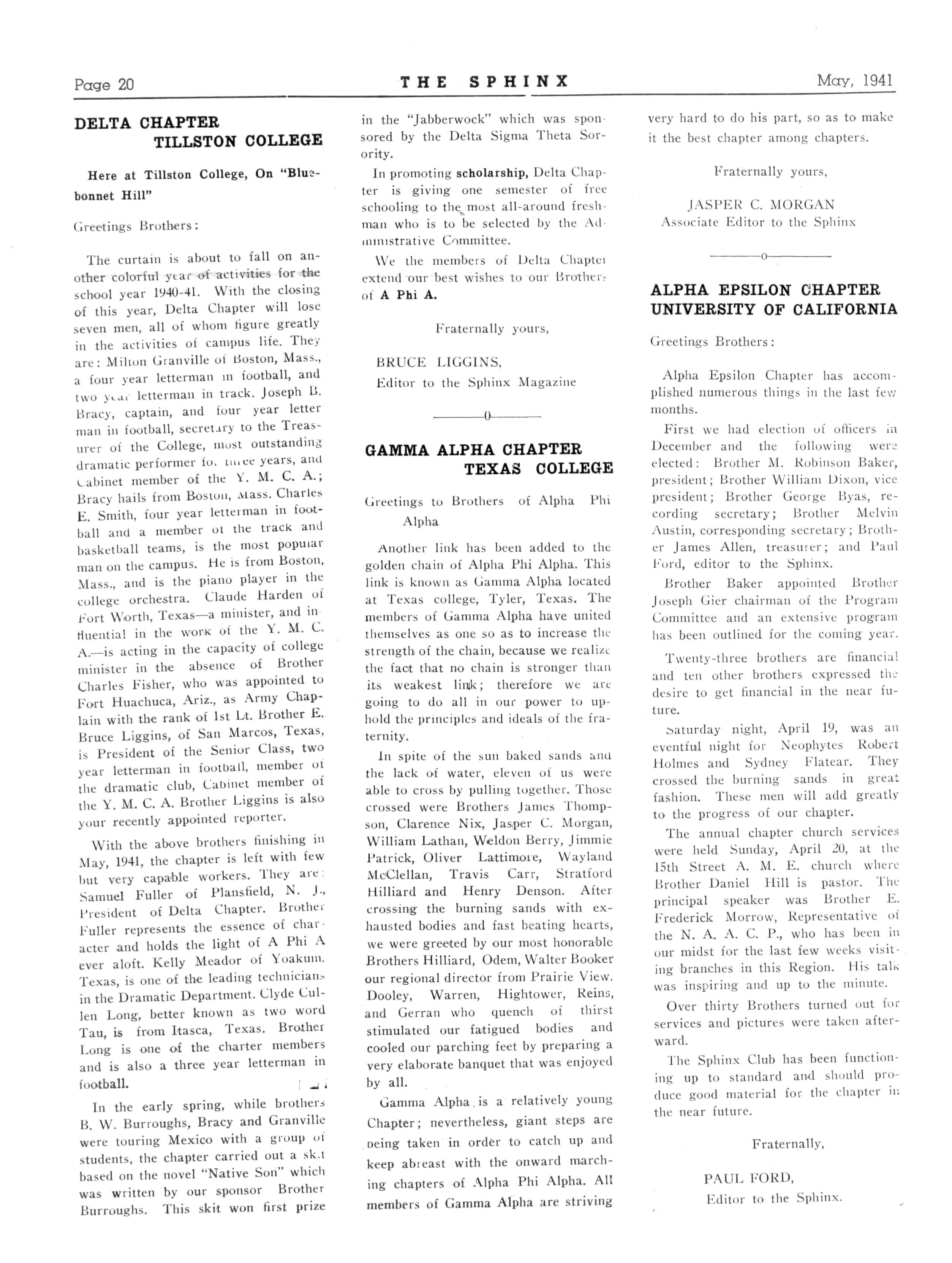 Greetings to Brothers in Alphadom: Tau Chapterhasmademuch progress during the past year and a half since it entered the new chapter house. Our achievement has been inthe three main divisions ofcollegelife; scholastic, athletic and social Each brother and Sphinxman is doing his part to make the Chapter a success at the university and tn let it be known everywhere that the spirit of Alphadom is a living force