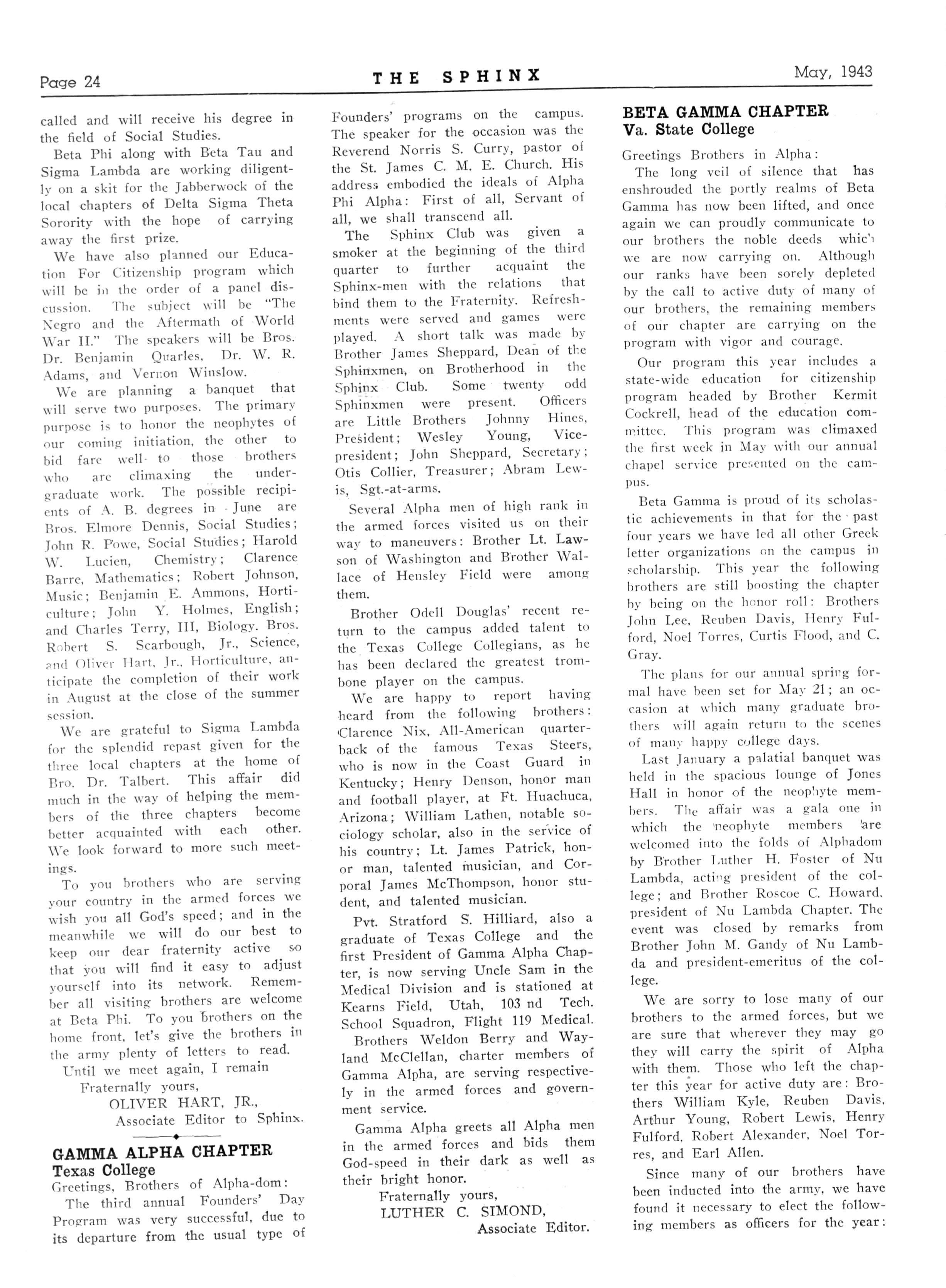 38 ALPHA RHO—Morehouse College, Ga.; President Benjamin Bullock, Secretary, Clarence Williams, Morehouse College
