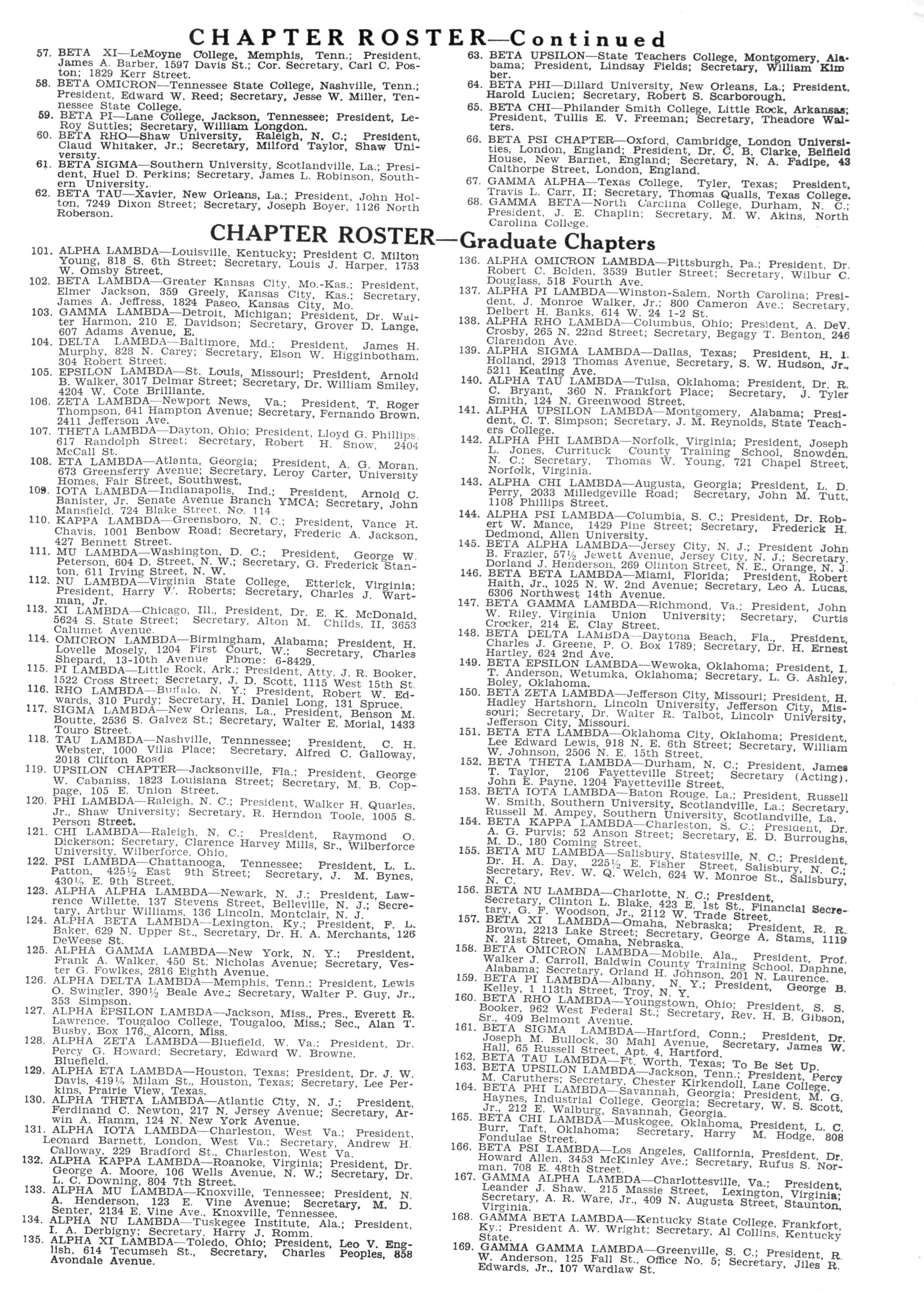 109 IOTA LAMBDA—Indianapolis, Ind.; President ArnoldC Banister, Jr Senate Avenue Branch YMCA; Secretary John Mansfield. 724Blake Street. No.114. "ciary, jonn