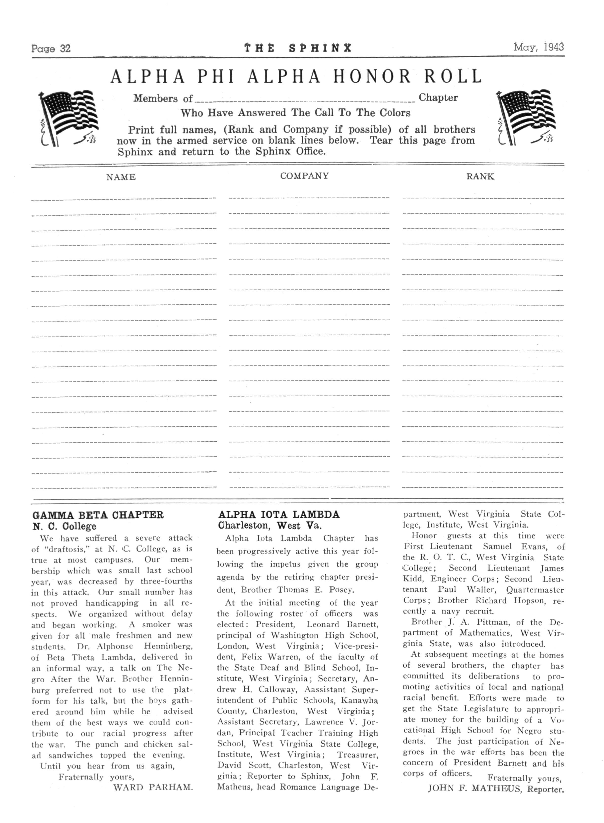 At the initial meeting of the year the following roster of officers was elected: President, Leonard Barnett, principal of Washington High School, London, West Virginia; Vice-president, Felix Warren, of the faculty of the State Deaf and Blind School, Institute, West Virginia; Secretary, Andrew H Calloway, Aassistant Superintendent of Public Schools, Kanawha County, Charleston, West Virginia; Assistant Secretary, Lawrence V Jordan, Principal Teacher Training High School, West Virginia State College, Institute, West Virginia; Treasurer, David Scott, Charleston, West Virginia; Reporter to Sphinx, John F Matheus, head Romance Language De-